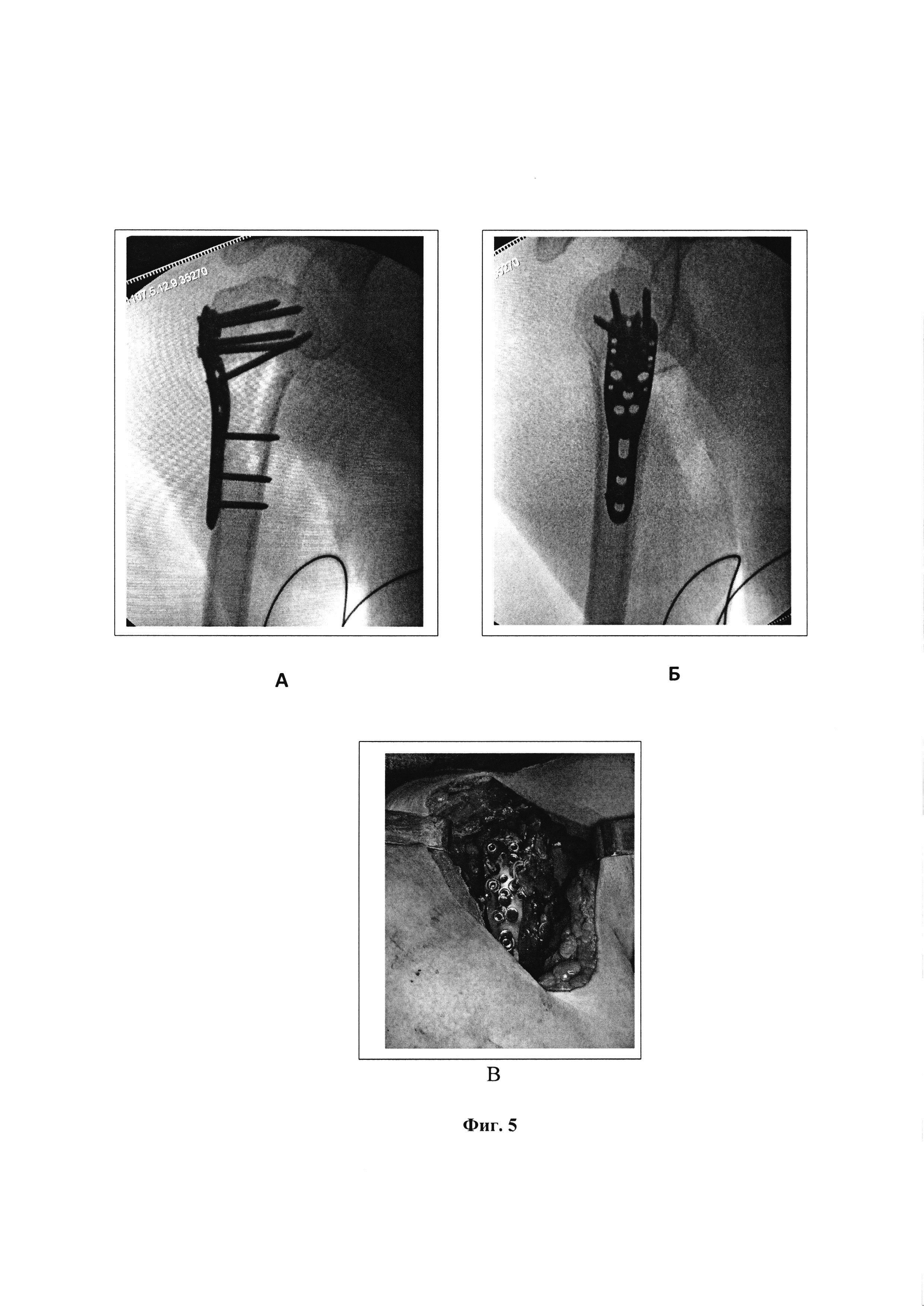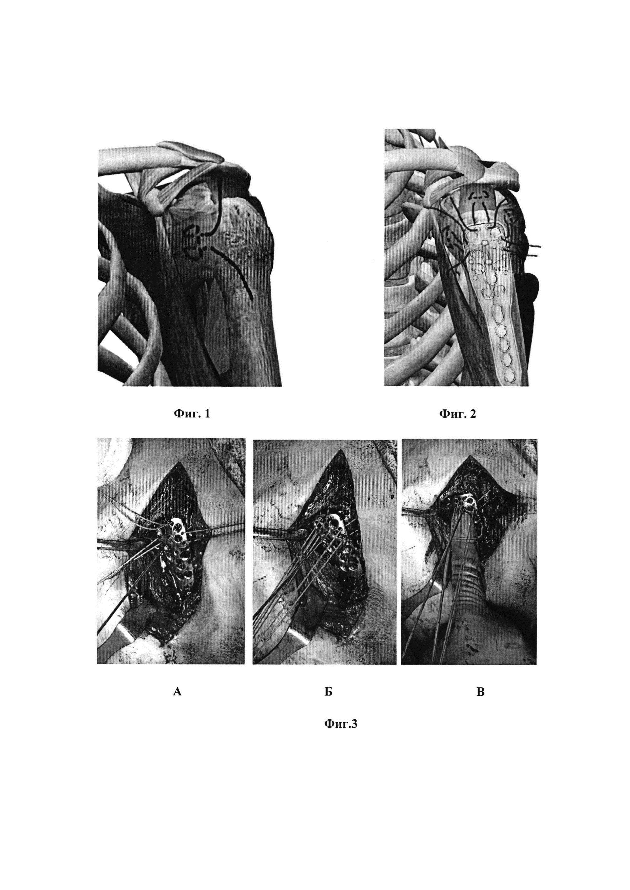 1. Способ остеосинтеза при переломе проксимального отдела плечевой кости, включающий хирургический доступ к плечевому суставу, прошивание отдельными нитями сухожилий надостной, подостной и подлопаточной мышц с последующей репозицией отломков посредством тракции за концы проведенных через сухожилия нитей, после чего проводят остеосинтез с фиксацией импланта к плечевой кости блокирующими винтами и фиксацией концов нитей к импланту, отличающийся тем, что осуществляют дельтопекторальный доступ к плечевому суставу с разрезом кожи и подкожной жировой клетчатки между дельтовидной и большой грудной мышцами; в качестве импланта используют пластину с блокирующими отверстиями для остеосинтеза переломов проксимального отдела плечевой кости; проводят прошивание сухожилий – сначала подлопаточной мышцы, затем надостной и подостной; после прошивания сухожилий концы нитей продевают через отверстия, расположенные по переднему, верхнему и заднему краям пластины, ориентируясь на ход сухожилий прошитых мышц, после чего под электронно-оптическим преобразователем центрируют пластину относительно суставной поверхности головки плечевой кости, так чтобы угол между плоскостью суставной поверхности и продольной осью пластины соответствовал шеечно-диафизарному углу плечевой кости, для чего в центральное отверстие в пластине устанавливают центральную спицу с последующей репозицией отломков путем тракции за концы нитей посредством натяжения всех 3 нитей одновременно, прижимая пальцем пластину к репонированным отломкам плечевой кости; осуществляют фиксацию концов нитей к отверстиям в пластине. 2. Способ по п. 1, отличающийся тем, что прошивание сухожилий подлопаточной, надостной и подостной мышц проводят нерассасывающимися нитями на расстоянии 1 см от точки прикрепления тремя стежками. 3. Способ по п. 1, отличающийся тем, что используют предизогнутую пластину для проксимального отдела плеча, имеющую блокирующие отверстия для винтов и отверстия для подшивания сухожилий вращательной манжеты плеча, а также отверстие, расположенное по центру пластины, для проведения спицы. 4. Способ по п. 1, отличающийся тем, что дельтопекторальный доступ осуществляют через разрез кожи и подкожно-жировой клетчатки, начиная от клювовидного отростка лопатки до верхней трети плеча длиной 15 см, находят v.cephalica и, отводя ее латерально, осуществляют доступ между дельтовидной и большой грудной мышцами к плечевому суставу с последующей визуализацией сухожилия длинной головки двухглавой мышцы плеча, малого бугорка и начинающегося от него сухожилия подлопаточной мышцы. 5. Способ по п. 1, отличающийся тем, что центральную спицу через центральное отверстие пластины для ее центрирования проводят под углом 130° к продольной оси пластины в центр суставной поверхности головки плечевой кости до субхондрального слоя. 6. Способ по п. 1, отличающийся тем, что для репозиции отломков тракцию за концы всех 3 нитей одновременно начинают в тот момент, когда пластина находится на расстоянии 1-1,5 см от кости, при этом после репозиции отломков прижатие пластины к кости пальцем осуществляют ее скольжением по центральной спице до локации в правильном положении на головке плечевой кости. 7. Способ по п. 1, отличающийся тем, что пластину устанавливают накостно и фиксируют к проксима