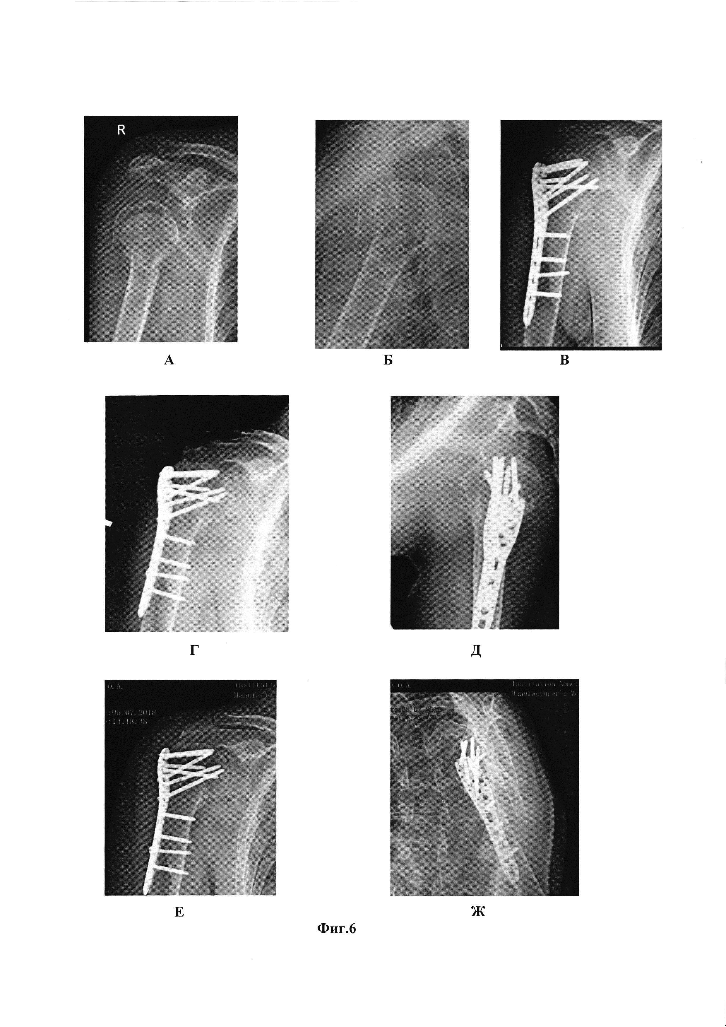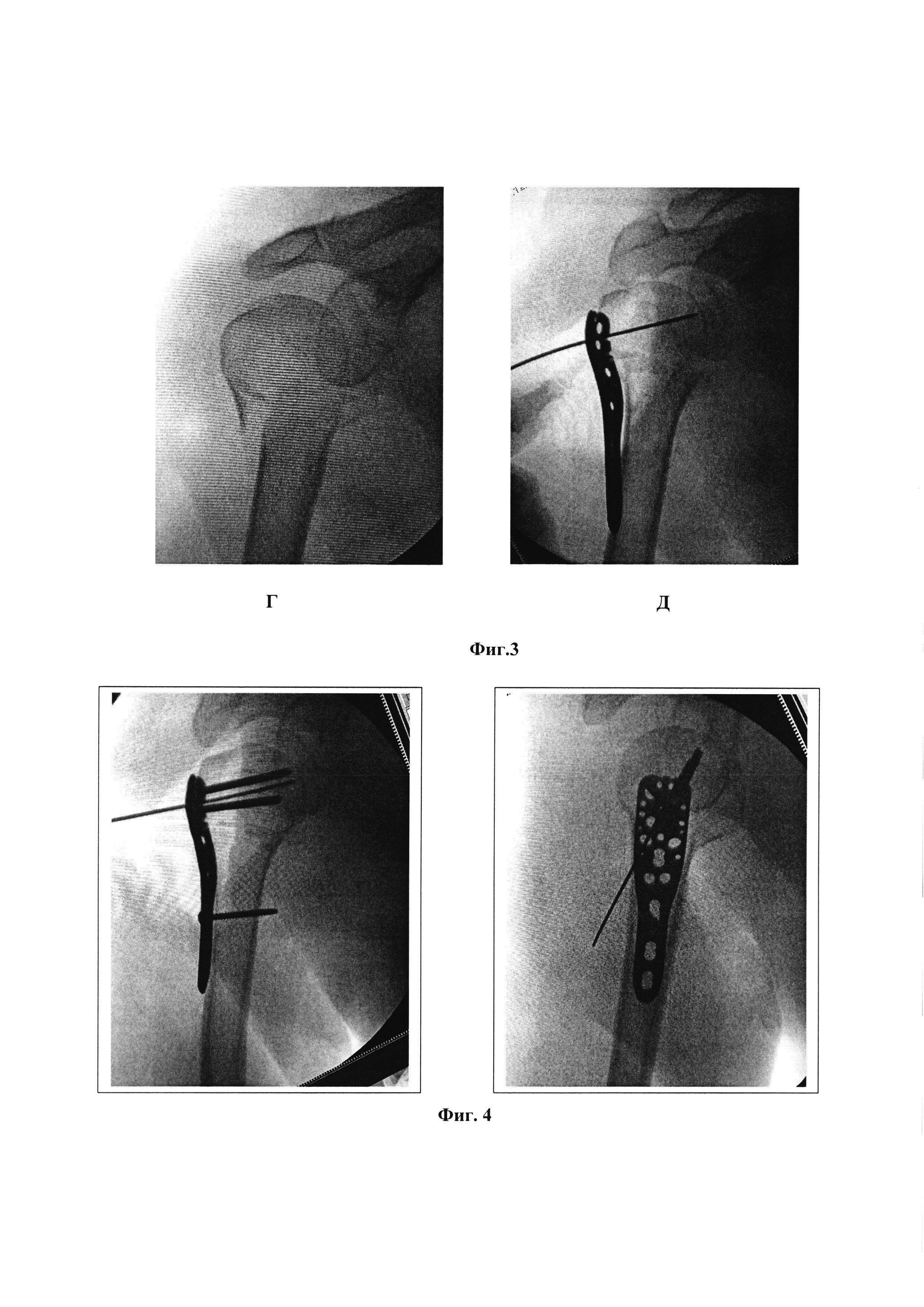 Изобретение относится к области медицины, а именно к травматологии, и может быть использовано для репозиции отломков при переломах проксимального отдела плечевой кости. Осуществляют дельтопекторальный доступ к плечевому суставу с разрезом кожи и подкожной жировой клетчатки между дельтовидной и большой грудной мышцами. В качестве импланта используют пластину с блокирующими отверстиями для остеосинтеза переломов проксимального отдела плечевой кости. Проводят прошивание сухожилий – сначала подлопаточной мышцы, затем надостной и подостной отдельными нитями. После прошивания сухожилий концы нитей продевают через отверстия, расположенные по переднему, верхнему и заднему краям пластины, ориентируясь на ход сухожилий прошитых мышц. Затем под электронно-оптическим преобразователем центрируют пластину относительно суставной поверхности головки плечевой кости, так чтобы угол между плоскостью суставной поверхности и продольной осью пластины соответствовал шеечно-диафизарному углу плечевой кости, для чего в центральное отверстие в пластине устанавливают центральную спицу с последующей репозицией отломков путем тракции за концы нитей посредством натяжения всех 3 нитей одновременно, прижимая пальцем пластину к репонированным отломкам плечевой кости. Пластину фиксируют к проксимальному отделу плечевой кости блокируемыми винтами. Осуществляют фиксацию концов нитей к отверстиям в пластине. Изобретение обеспечивает повышение надежности фиксации отломков как при простых 2-фрагментарных, так и при тяжелых 3-4-фрагментарных переломах проксимального отдела плечевой кости, на любых сроках после травмы, при минимизации риска развития послеоперационных осложнений. 7 з.п. ф-лы, 6 ил., 1 табл., 1 пр.