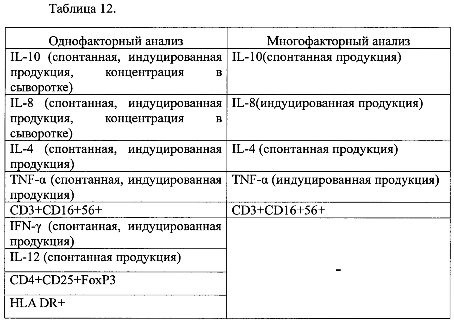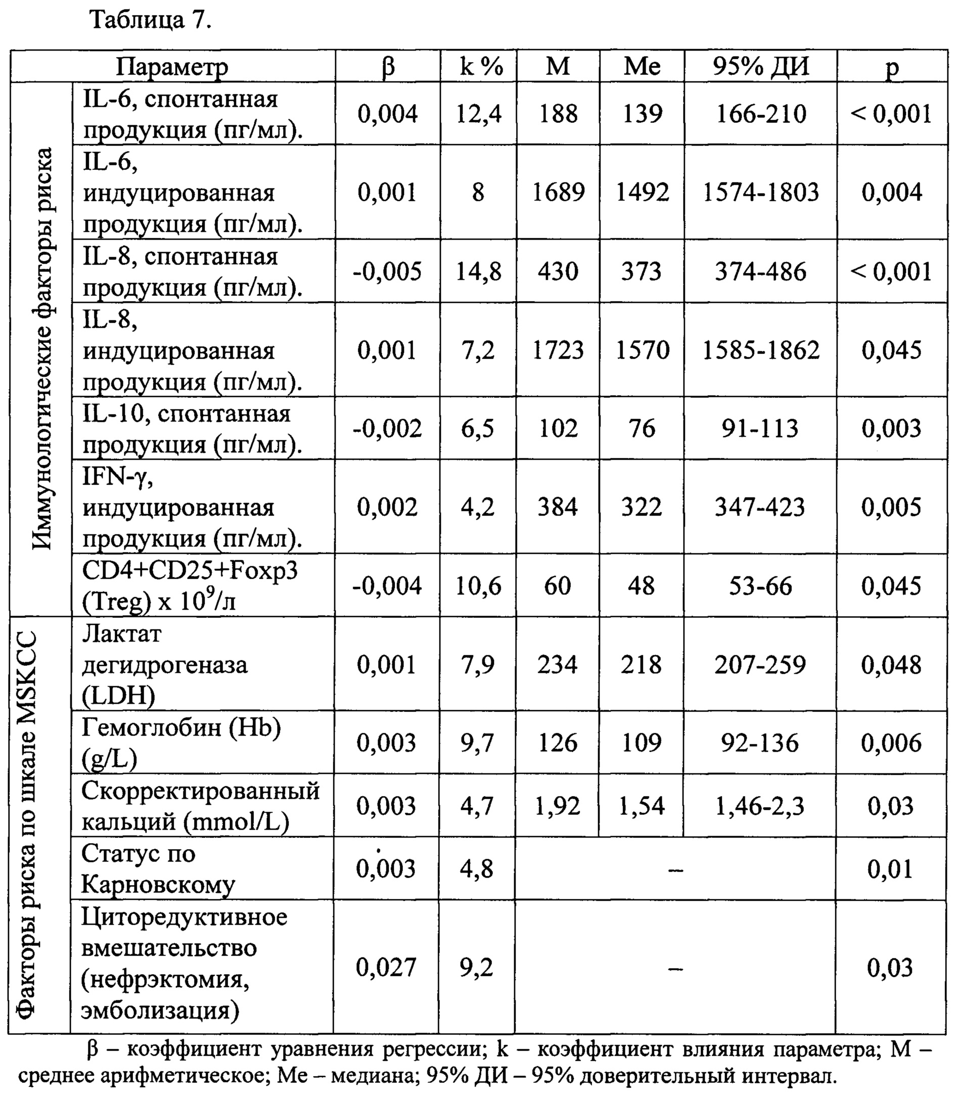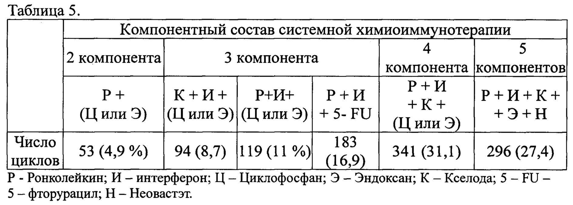 Изобретение относится к области медицины, а именно к онкологии, и предназначено для лечения почечно-клеточного рака. Больному вводят комбинацию препаратов: 3 раза в неделю в количестве 12000000 ME в сутки и Эндоксан. Эндоксан вводят перорально в количестве 50 мг в сутки и дополнительно Рефнот подкожно в количестве 200000 ЕД в сутки два раза в неделю. Каждые 8 недель проводят компьютерно-томографическое исследование. При наличии рентгенологических признаков прогрессирования заболевания определяют уровни спонтанной продукции IL-10 (X1), индуцированной продукции IL-8 (Х2), спонтанной продукции IL-4 (Х3), индуцированной продукции TNF-α (Х4) и абсолютную концентрацию натуральных киллеров с рецепторами Т-лимфоцитов CD3+CD16+56+ (Х5). По полученным значениям рассчитывают дискриминантные функции F1 и F2. При F1>F2 продолжают лечение в прежнем режиме. При F2>F1 больного переводят на терапию сунитинибом. Между 8-недельными циклами сунитиниба делают перерыв по 2 недели. Изобретение позволяет улучшить показатели выживаемости больных почечно-клеточным раком. 13 табл., 1 пр.