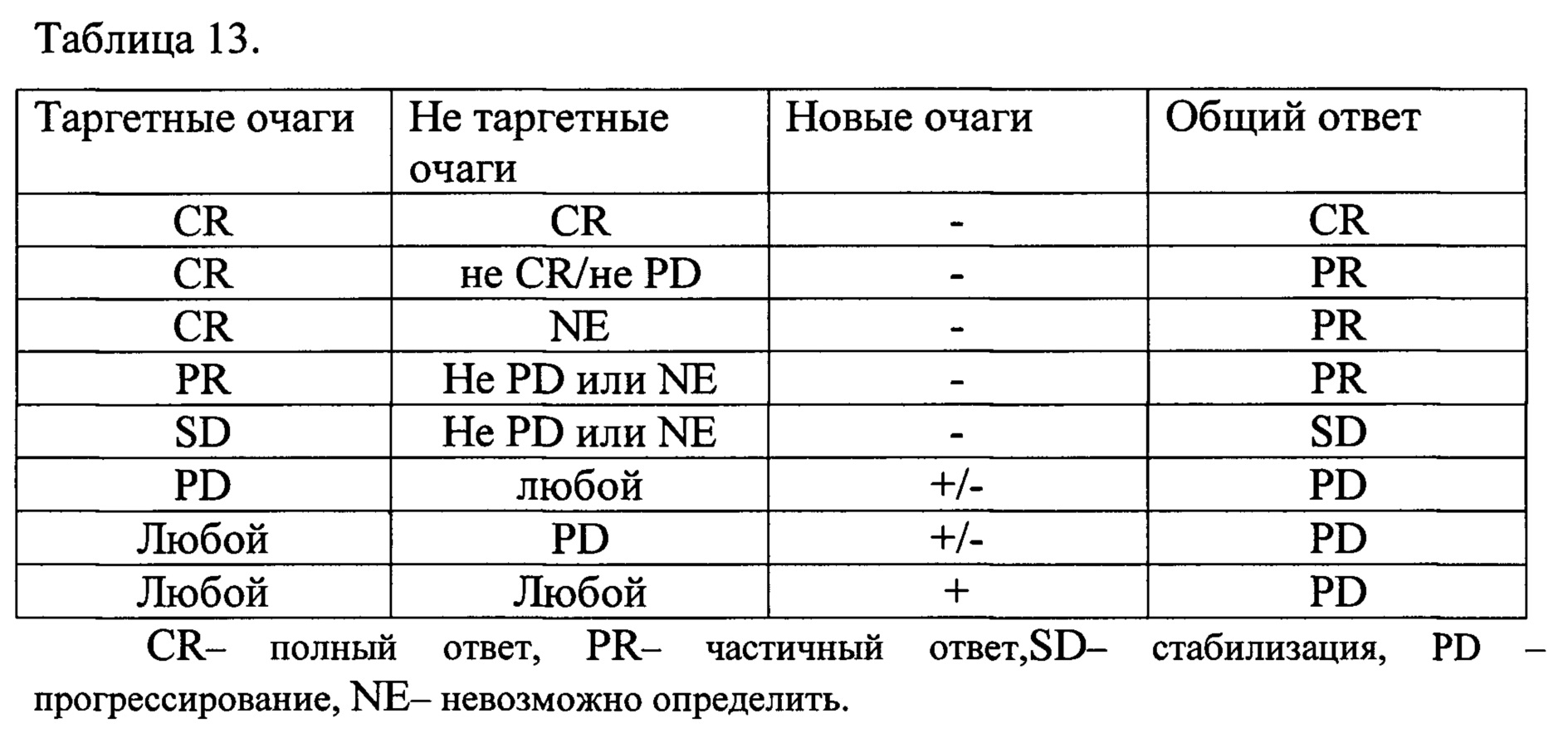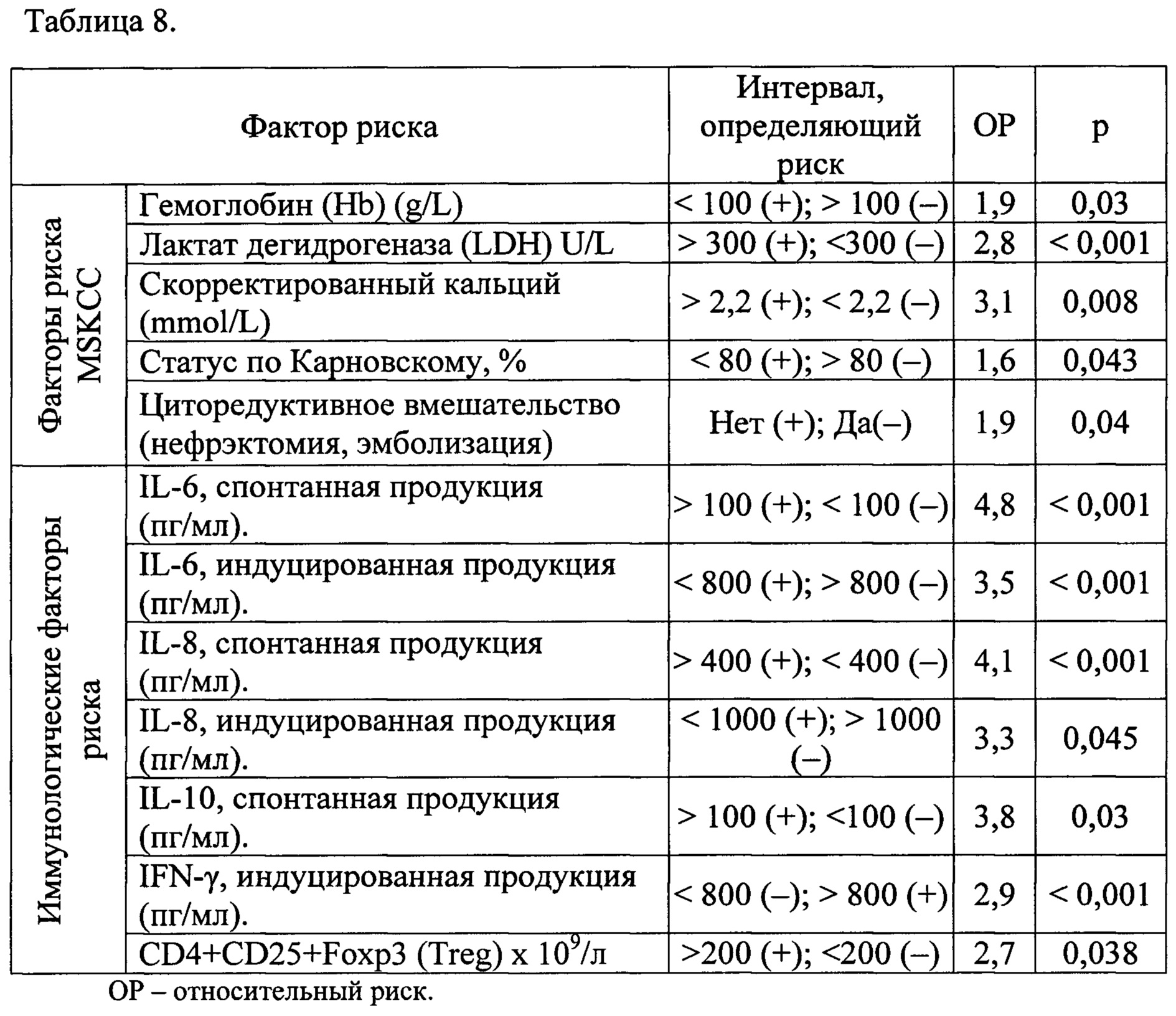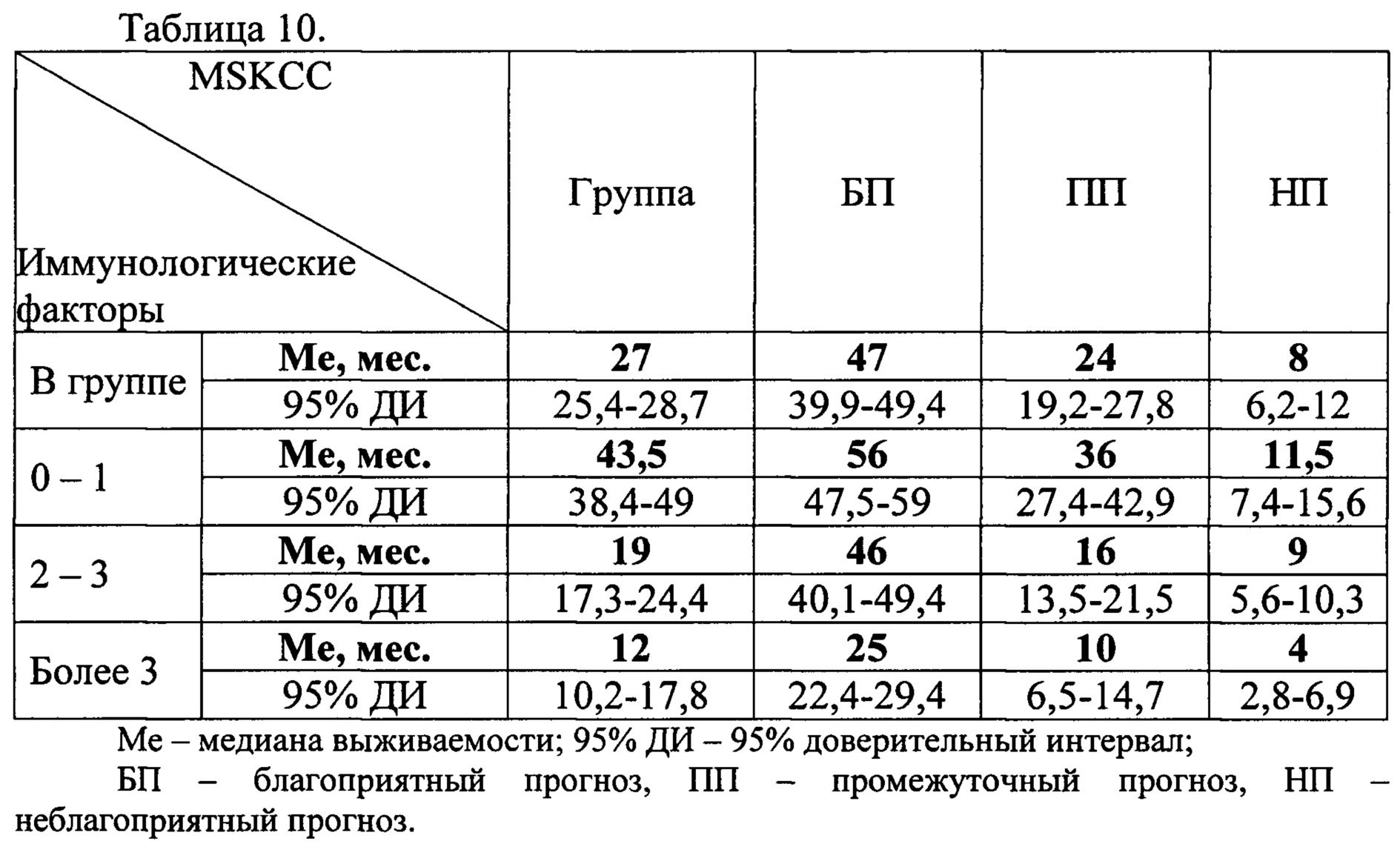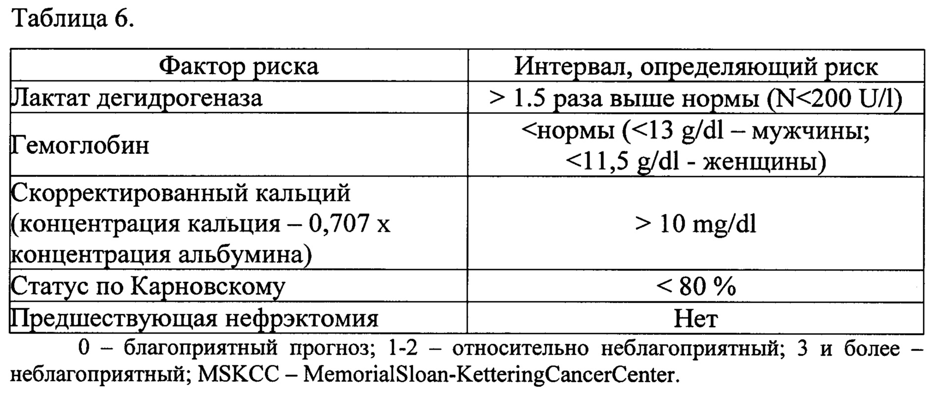 Изобретение относится к медицине, точнее, к онкологии, и может найти применение при лечении злокачественных новообразований. Почечно-клеточный рак составляет (ПКР), по данным различных авторов, 2-4% от всех опухолей взрослых. Ежегодно в мире выявляется 338000 новых случаев, и 114000 больных умирает от этого заболевания. 70-85% опухолей имеют гистологическую структуру светлоклеточного рака. У 30% больных при первичном обращении выявляются отдаленные метастазы. Еще у 30% они возникают в течение первого года после радикальной операции. Метастазы являются причиной смерти в 40% случаев. В общей популяции больных ПКР пятилетняя выживаемость у больных с местно-распространенными формами составляет в среднем 67%, а при наличии отдаленных метастазов - 12%. В специализированных центрах, где есть возможность использовать все доступные варианты хирургического и лекарственного лечения, а также очень четко выдерживаются интервалы инструментальной оценки эффективности, этот показатель достигает 23%. В настоящее время для лечения больных ПКР используются различные варианты хирургического лечения, лучевая, лекарственная и клеточная терапия. Основу лечения больных слокальными и местно-распространенными формами опухолей составляют различные варианты хирургического вмешательства, включая открытые и эндоскопические операции, интервенционно-радиологические процедуры, локальную гипертермию и криоаблацию. Лекарственная терапия используется лишь как вспомогательный метод при наличии противопоказаний к оперативному лечению. У больных с диссеминированными формами хирургический метод лечения имеет значение лишь как способ циторедукции для повышения вероятности достижения клинического эффекта при использовании таргетной и иммунотерапии. Оперативные вмешательства используются также для купирования угрожающих жизни осложнений, возникающих вследствие роста опухолевой массы. В настоящее время известны следующие методы патогенетического лечения больных с диссеминированным ПКР: 1. Таргетная терапия. 1.1. Ингибиторы тирозин-киназ (Сунитиниб, Сорафениб, Пазопаниб). 1.2. Ингибиторы mTOR (Темсиролимус, Эверолимус). 1.3. Ингибиторы ангиогенеза (Бевацизумаб). 2. Иммунотерапия. 2.1. Блокаторы ко-ингибирующих молекул (Ниволумаб). 2.2. Цитокины (IL-2, IFN-α). 2.3. Клеточная терапия. 2.4. Вакцинотерапия. Современная стратегия лечения больных диссеминированным ПКР включает последовательное применение несколько линий препаратов. В первой линии используют те из них, которые продемонстрировали высокую эффективность у ранее не леченых больных, во второй - средства, оказавшиеся более эффективными по сравнению с аналогами у ранее леченых больных. Начиная с третьей линии четких указаний по выбору препарата нет. Здесь применяются либо ранее не использованные, либо находящиеся на разных фазах клинических испытаний препараты. Выбор тактики в этом случае полностью определяется лечащим врачом исходя из клинической ситуации. При этом основной принцип заключается в использовании препарата с другим механизмом действия при смене линии терапии. Дизайн клинических испытаний, определяющих использование препарата в той или иной линии, обязательно включает рандомизацию по прогнозу и гистологическому типу опухоли. Для оценки прогноза у больных диссеминированным ПКР в большинстве иссле