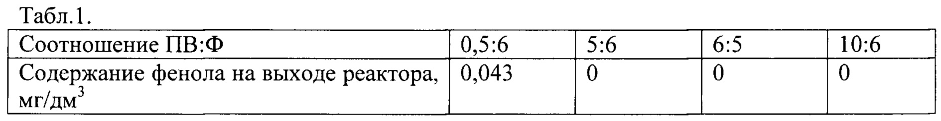 Пример 1. В первом случае проводилась обработка модельного раствора с содержанием фенола 575 мг/дм3 электроразрядными импульсами напряжением 29 кВ и частотой их следования 20 Гц при скорости подачи смеси 2 л/мин с различным массовым соотношением ПВ:Ф (табл. 1).