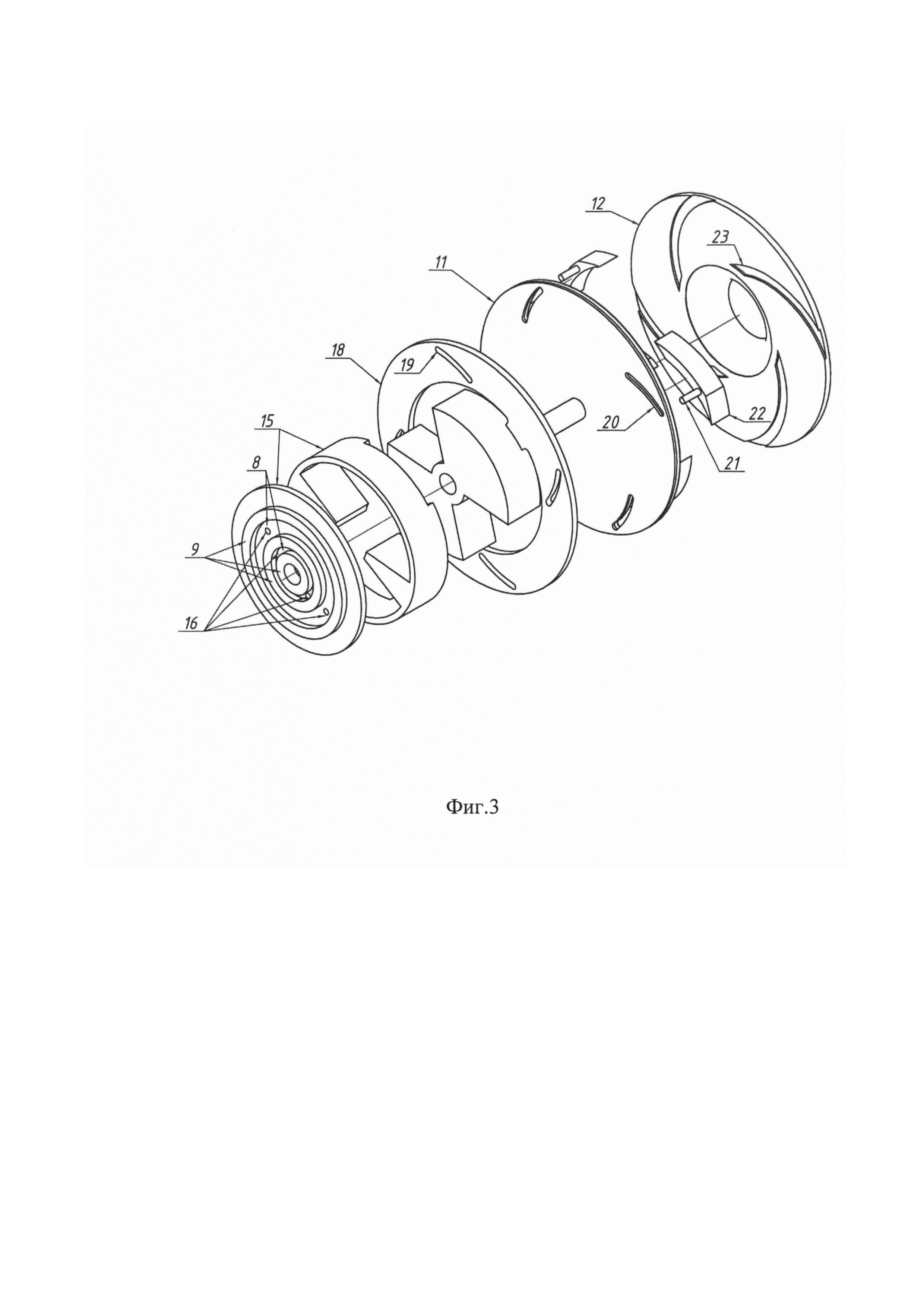 Изобретение относится к насосной технике, в частности к центробежным насосам и может быть использовано в тех областях техники, где требуется оптимизация энергетических затрат при гарантированной подаче перекачиваемой жидкой среды с переменным расходом. Недостатками существующих центробежных насосов с применяемыми в них рабочими колесами является невозможность внутреннего саморегулирования работы насосной установки, т.е. изменение подачи Q и напора Н при отладке их совместной работы с трубопроводной системой. Отладка совместной работы достигается как изменением гидравлических характеристик самого трубопровода, так и изменением характеристик насоса, изменением частоты вращения рабочего колеса внешним устройством. Известны выпускаемые промышленностью насосы с механизмом поворота лопастей для крупных осевых и диагональных насосов, но для центробежных насосов, данных о применении подобных механизмов нет. [Лобачев П.В. Насосы и насосные станции - М.: Стройиздат, - 1990 - С. 108-110]. Известны различные конструкции центробежных насосов, например, насос, описанный в книге [Есьман И.Г. «Насосы», Москва, Гостоптехиздат, 1954 г., 284 с., ил., стр. 17], который состоит из корпуса с патрубками, вала с рабочим колесом, имеющим лопатки. Изобретение направлено на осуществление возможности изменения лопаточной части рабочего колеса, в частности изменения конструкции лопаток рабочего колеса для снижения потребляемой рабочим колесом мощности двигателя, приводящего его в вращение, при изменении потребления жидкости в питаемой насосом сети. Эти лопатки имеют постоянную геометрическую форму и не позволяют изменять передачу энергии вращения рабочего колеса потоку перекачиваемой жидкости в процессе работы. Регулирование производительности такого насоса возможно только изменением числа оборотов вращения. Известны центробежные насосы, в которых изменение подачи перекачиваемой жидкости обеспечивается за счет изменения геометрических параметров лопаток рабочего колеса (патент США №3482523, МПК F04D 15/00, F04D 17/08; патент РФ №2187708, МПК F04D 15/00). В насосах, оборудованных такими рабочими колесами, изменение подачи перекачиваемой жидкости обеспечивается за счет изменения размеров каналов. Однако для обеспечения эффективной подачи от входа насоса к выходу необходимо иметь достаточно широкие каналы для прохода жидкости между лопатками. Сужение этих каналов приводит к увеличению потребления мощности насосом, уменьшению КПД работы насоса за счет увеличения сопротивления потоку жидкости. Известен насос по патенту США №6074167 (1999 г.), МПК F04D 17/143, F04D 15/0038, в котором радиально простирающаяся длина или внешний радиус лопаток выполнены так, чтобы быть длиннее или короче в зависимости от требуемой скорости потока и/или желаемого напора давления, для чего лопатки, выполнены в форме ступеньки. Эффективный диаметр лопаток может меняться при скольжении промежуточного диска вдоль приводного вала, таким образом, что, либо вся лопатка выступает из прорези промежуточного диска, тогда она задействована полностью, т.е. диаметр лопаток максимальный, либо только верхняя часть ступеньки лопатки выступает из прорези промежуточного диска, тогда диаметр лопаток уменьшается на длину нижней ступеньки. Такой насос обеспечивает возможность изменения производительности при неиз