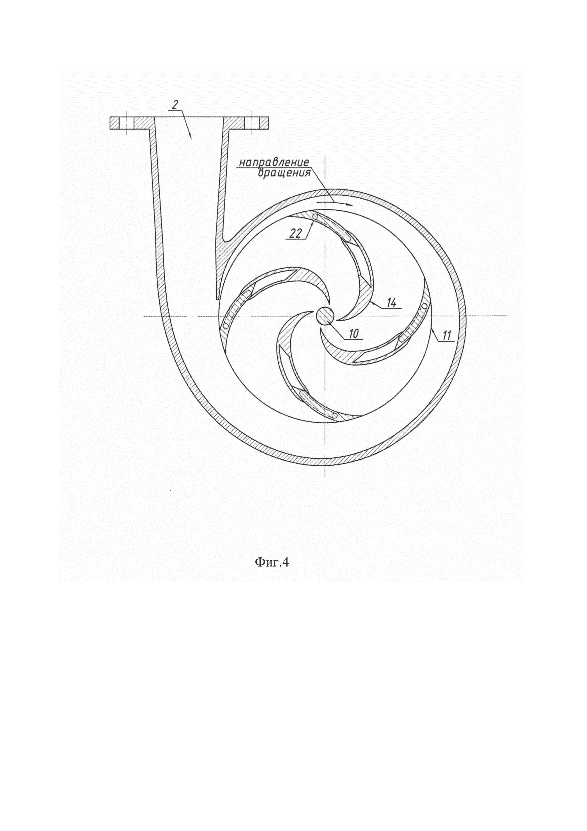 Центробежный насос, содержащий корпус, рабочее колесо, установленное в корпусе на приводном валу и включающее приводной и покрывной диски с установленными между ними лопатками, состоящими из неподвижных частей, расположенных со стороны внутреннего диаметра рабочего колеса и неподвижно связанных с покрывным и приводным дисками, и подвижных частей, расположенных со стороны внешнего диаметра рабочего колеса, и привод подвижных частей лопаток, включающий корпус привода, закрепленный на приводном диске рабочего колеса и имеющий отверстия, параллельные отверстиям, выполненным в приводном диске, которые предусмотрены для пропуска через них штифтов, соединенных с подвижными частями лопаток, отличающийся тем, что привод подвижных частей лопаток выполнен в виде гидропривода, включающего установленный с возможностью углового смещения внутри замкнутых полостей корпуса привода ротор, связанный со штифтами, датчик давления, установленный в зоне нагнетания насоса и связанный с блоком управления гидрораспределителем, подключенным гидролиниями к зонам всасывания и нагнетания насоса и каналами, выполненными в корпусах насоса и привода, - к замкнутым полостям.