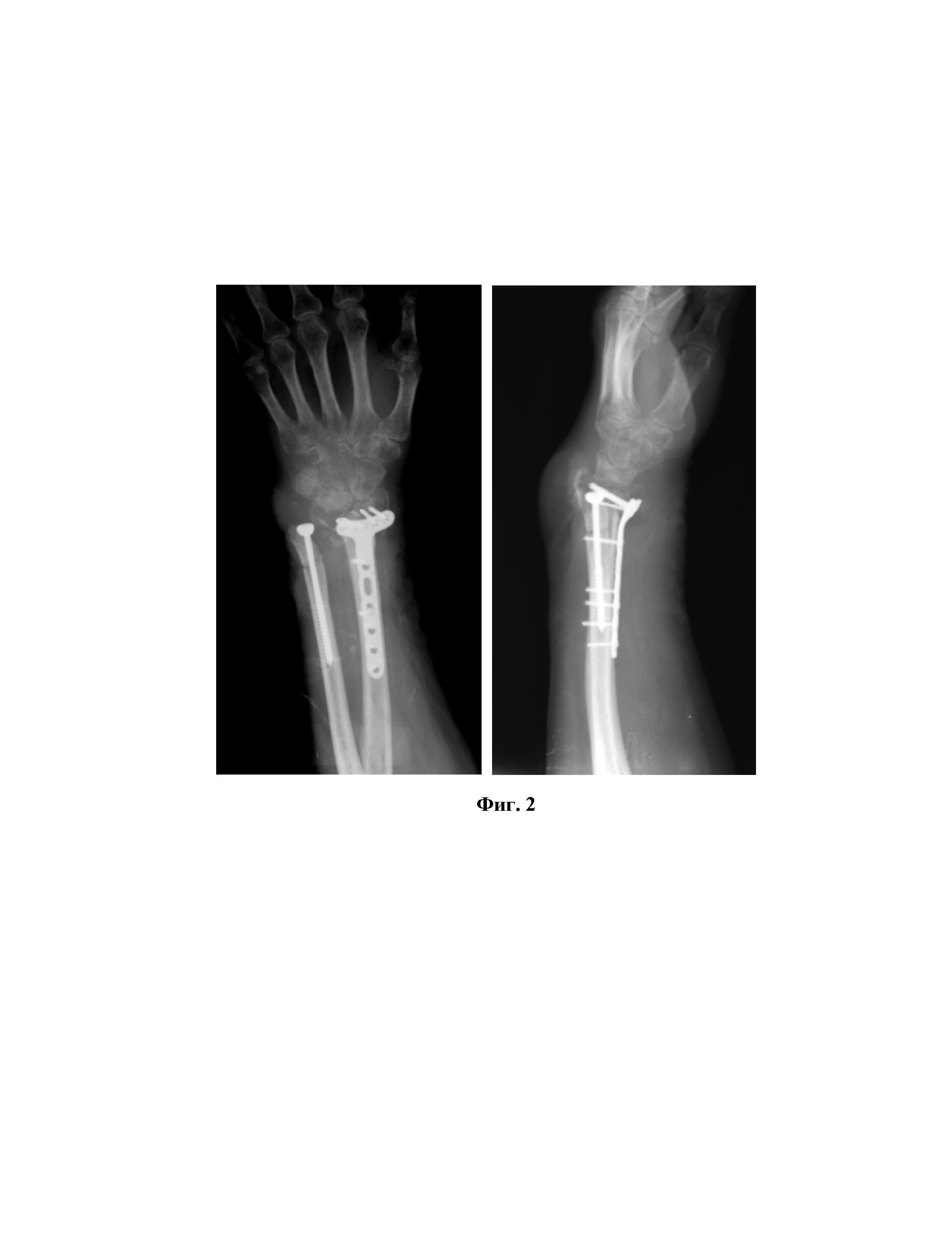 Изобретение относится к области медицины, а именно к травматологии и ортопедии для лечения посттравматической лучевой косорукости у взрослых с целью восстановления функциональных возможностей верхней конечности. При переломах лучевой кости в «типичном» месте, являющихся одним из наиболее встречаемых видов повреждений опорно-двигательного аппарата, часто происходит укорочение лучевой кости с формированием лучевой косорукости, коррекция которой возможна только оперативным путем. В настоящее время, несмотря на определенные успехи в лечении больных с данной патологий, при использовании любых существующих технологий хирургической коррекции лучевой косорукости, сроки лечения длительны, а количество случаев с положительным результатом колеблется в пределах 33,3-53,7%. Все способы коррекции посттравматической лучевой косорукости делятся на две группы, первая из которых ориентирована на восстановление длины лучевой кости и достижения, таким образом, косметического эффекта. Известны методики костно-пластической коррекции данной патологии, направленные на компенсацию укорочения посредством восполнения утраченной длины трансплантатом [Чрескостный остеосинтез при посттравматической лучевой косорукости/Пусева М.Э., Михайлов И.Н., Рудаков А.Н.//Сибирский медицинский журнал. 2009. №7. С. 107-110]. Одним из примеров данных методик является «Способ оперативного лечения приобретенной лучевой косорукости» [авторское свидетельство SU на изобретение №194249], направленный на постепенное растяжение латерального отдела предплечья до полного вправления головки локтевой кости с последующим замещением дефекта ауто- или гомотрансплантатом и фиксированием его компрессионным остеосинтезом. Однако устранение укорочения более 2,5 см методом аутопластики, в большинстве случаев невозможно, т.к. максимально вырастает риск отторжения трансплантата большого объема. При этом их длительная перестройка значительно удлиняет сроки лечения и реабилитации, а также сопровождается необходимостью иммоболизации конечности на долгий срок. Формирование аутотрансплантатов больших объемов затруднительно и сопряжено с дополнительной травматизацией. Известны также способы лечения укорочения лучевой кости методом дистракционного остеосинтеза с использованием различных модификаций аппаратов внешней фиксации [Бородин В.В. Лечение по Илизарову приобретенной лучевой косорукости: Автореф… дис. канд. мед. наук. Пермь. 1992. 23с.]. Однако при использовании данных технологий лечения были отмечены частые рецидивы, развитие контрактур, в том числе «когтеобразной кисти», ишемии мягких тканей, сосудистых и неврологических нарушений, обусловленных длительной дистракцией, и возникновение инфекционных осложнений, в частности в местах введения чрескостных элементов: спиц, стержней и т.д. Ко второй группе методик коррекции посттравматической косорукости относятся способы, направленные на восстановление нормальных анатомических межсегментарных пропорций путем укорочения локтевой кости. Одной из таких методик является проведение корригирующей остеотомии лучевой кости с резекцией дистального конца локтевой кости [Чрескостный остеосинтез при посттравматической лучевой косорукости/Пусева М.Э., Михайлов И.Н., Рудаков А.Н.//Сибирский медицинский журнал. 2009. №7. С. 107