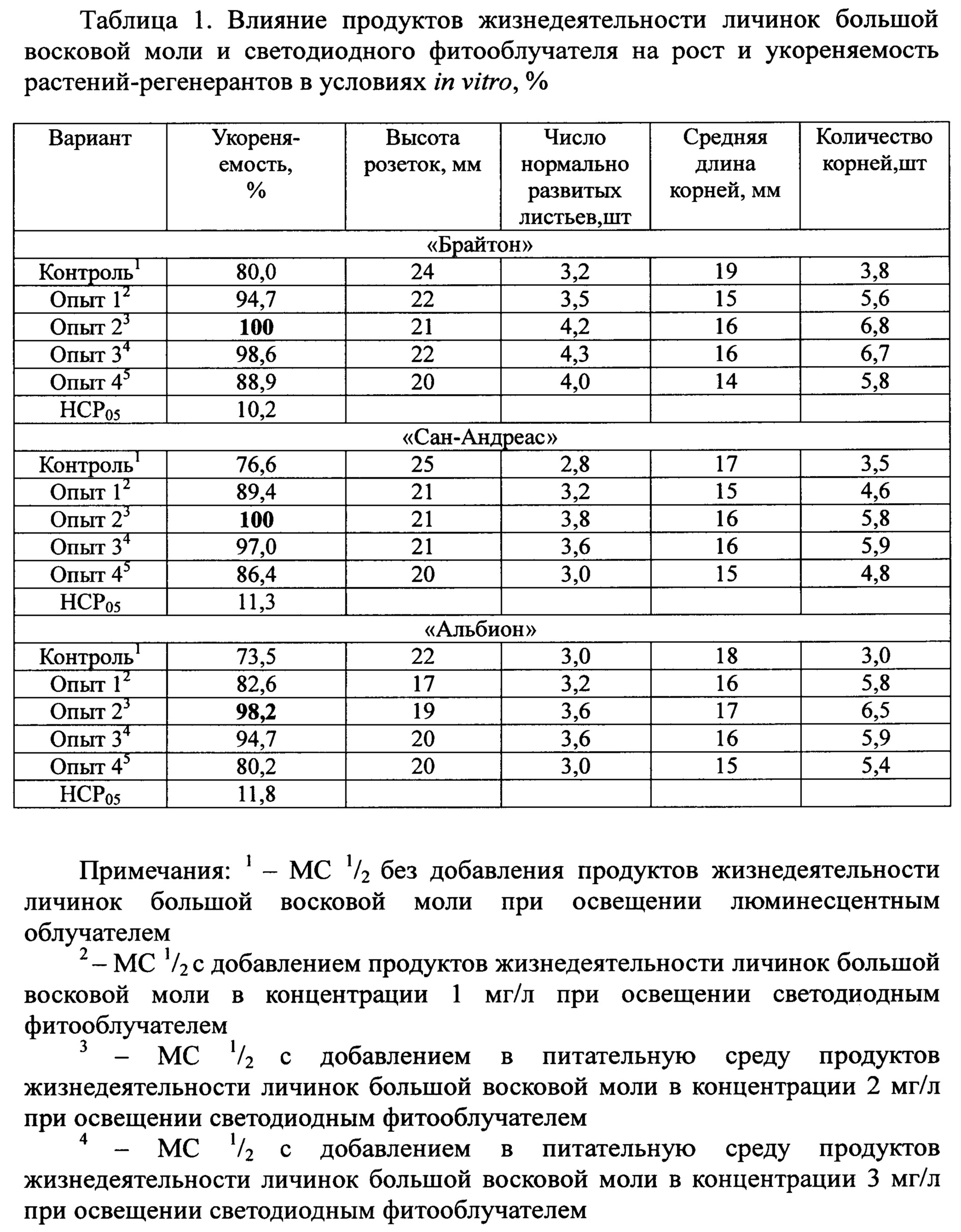 Изобретение относится к сельскому хозяйству, в частности к отрасли биотехнологии в растениеводстве и может применяться в клональном микроразмножении (культура in vitro) для сокращения продолжительности этапа укоренения микрочеренков ягодных культур, улучшения качества их корневой системы и выходу кондиционных микрорастений с высокой адаптационной способностью к нестерильным (in vivo) условиям. Известен Патент на изобретение 2614261 от 24.03.2017 «Способ адаптации растений-регенерантов земляники, включающий увлажнение регенерантов земляники водной суспензией кремнийсодержащего механокомпозита на основе рисовой шелухи и зеленого чая». Изобретение позволяет успешно акклиматизировать землянику благодаря подкормке на стадии адаптации. Недостатком данного изобретения является то, что процесс осуществляется в культуре ex vitro, где условия уже не стерильны. Этап укоренения микрочеренков земляники проходит в стерильных условиях in vitro и применить механокомпозит будет проблематично. Известен Патент на изобретение 2679077 от 05.02.2019 (Прототип) «Способ повышения эффективности ризогенеза растений in vitro с помощью кофеина», заключающийся в том, что экспланты базальной частью высаживают на питательную среду укоренения по прописи Мурасиге-Скуга, содержащую 1,0 мг/л индолил-3-масляной кислоты с добавлением 1-50 мг/л кофеина. Изобретение позволяет повысить эффективность ризогенеза in vitro микрочеренков растений, культивируемых на питательных средах. Недостатками прототипа являются: в данной работе не изучено влияние кофеина в питательной среде для укоренение эксплантов культуры земляника садовая; укореняемость микрочеренков не превышает 82,6%, значит данный показатель может быть приближен к 100% за счет использования других регуляторов роста. Не все виды растений одинаково успешно размножаются и укореняются в условиях культуры in vitro. В зависимости от генотипа, могут проявляться сложности на этапе укоренения растений на питательных средах, в частности укоренения такой культуры, как ремонтантная земляника. В связи с этим, при укоренении растений in vitro используют различные факторы химической и физической природы, стимулирующие ризогенез. В качестве физического фактора в данной работе применяется светодиодный фитооблучатель с соотношением в спектре красного, синего и белого света 2:1:1 (патент на полезную модель №127286 от 27.04.2013 г. «Светодиодная система для облучения меристемных растений»). В качестве фактора химической природы в данной работе применяется продукт жизнедеятельности личинок большой восковой моли (Galleria mellonella L.). Техническим результатом предлагаемого изобретения является 100%-ная укореняемость микрочеренков земляники ремонтантной с применением продуктов жизнедеятельности личинок большой восковой моли в концентрации 2 мл/л при освещении светодиодным фитооблучателем и сокращение этапа до 20 суток после высадки микрочеренков на укоренение. Продукты жизнедеятельности личинок большой восковой моли (Galleria mellonella L.) представляют собой сухой продукт черного цвета с содержанием первоначальной влаги 4-4,5%. По консистенции представляет собой рассыпчатое вещество с размером частиц от 0,1 мм до 3 мм. Запах специфический, приятный, смесь ароматов меда, прополиса, перги и других пчелопродуктов. В соответствии с проведенными испытаниями на изучение с