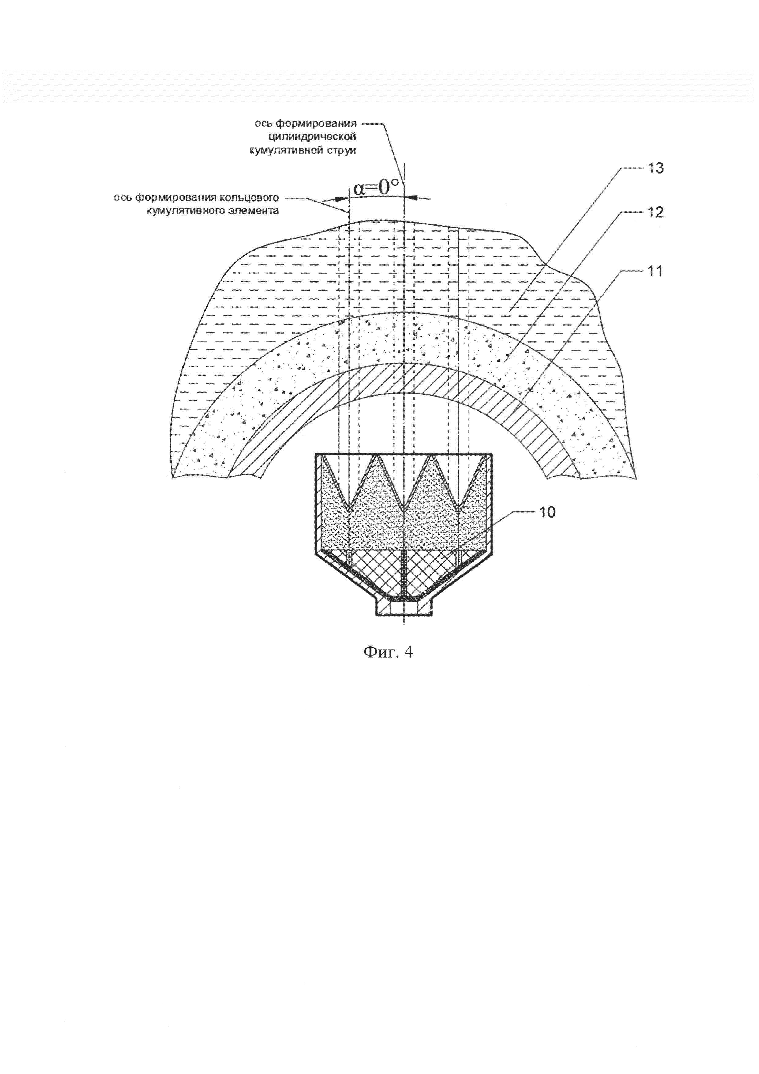 Предлагаемое изобретение относится к области добычи нефти и газа и может быть использовано для перфорирования труб скважин при вскрытии вторичных продуктивных пластов, а также для чистки уже перфорированных ранее каналов. Известен кумулятивный заряд перфоратора (патент RU 2432452, МПК Е21В 43/117, F42B 1/028, 27.10.2011), который содержит корпус, осесимметричную шашку взрывчатого вещества (ВВ) с открытой полостью, при этом к поверхности полости прилегает кумулятивная облицовка, состоящая из конической и сферической или эллиптической кумулятивных частей, сопряженных между собой. Коническая кумулятивная часть является вершиной кумулятивной облицовки, а сферическая или эллиптическая кумулятивная часть имеет продольные кумулятивные канавки. Однако низкое качество стенок перфорационных каналов при применении данного заряда приводит к тому, что площадь сечений каналов ненамного превышает площадь сечения компактного быстролетящего тела. Кроме того, известно устройство (патент RU 2063606, МПК F42B 12/10, 27.07.1996), являющееся прототипом предлагаемого изобретения и содержащее корпус, выполненный в виде двух коаксиально расположенных колец конической формы с образованием зазора прямоугольного профиля с размещенным в нем зарядом взрывчатого вещества, V-образную кольцевую кумулятивную выемку с облицовкой, инициирующее устройство в виде кольцевой втулки, расположенной на оси симметрии V-образной кумулятивной облицовки и пересекающейся с осью симметрии заряда в направлении его действия под углом. Кумулятивный заряд функционирует следующим образом. При срабатывании инициирующего узла происходит инициирование заряда взрывчатого вещества. Образующиеся при этом продукты детонации воздействуют на облицовку, причем это воздействие осуществляется по всей окружности кумулятивной выемки одновременно. С образованием потока высокоскоростных частиц, движущихся вдоль конической образующей, совпадающей с поверхностью, образованной осями симметрии облицовки, и сходящегося в точке, расположенной на оси симметрии заряда на некотором удалении от основания облицовки. При вторичном схлопывании кумулятивной облицовки происходит повторное растяжение материала с формированием в данном случае кумулятивной струи, имеющей высокие массово-энергетические характеристики. Однако при функционировании кумулятивного заряда формирование основной кумулятивной струи происходит при обеспечении определенного фокусного расстояния, то есть необходимого удаления кумулятивного заряда от преграды. В случае использования подобного устройства в условиях нефтедобывающей скважины возникает проблема ограниченности окружающего пространства. Также задачей описанного изобретения является повышение глубины пробития преграды, а не его диаметра, поэтому, несмотря на увеличение диаметра пробития по сравнению с обычными кумулятивными зарядами конических форм облицовок, в данной конструкции возможности повышения диаметра пробития при использовании зарядов с V-образными формами облицовок не реализованы в полной мере. Задачей (техническим результатом) предлагаемого изобретения является увеличение притока нефти и газа за счет формирования в условиях ограниченного пространства в направлении оси заряда как кольцевого кумулятивного элемента - по периметру окружности, 