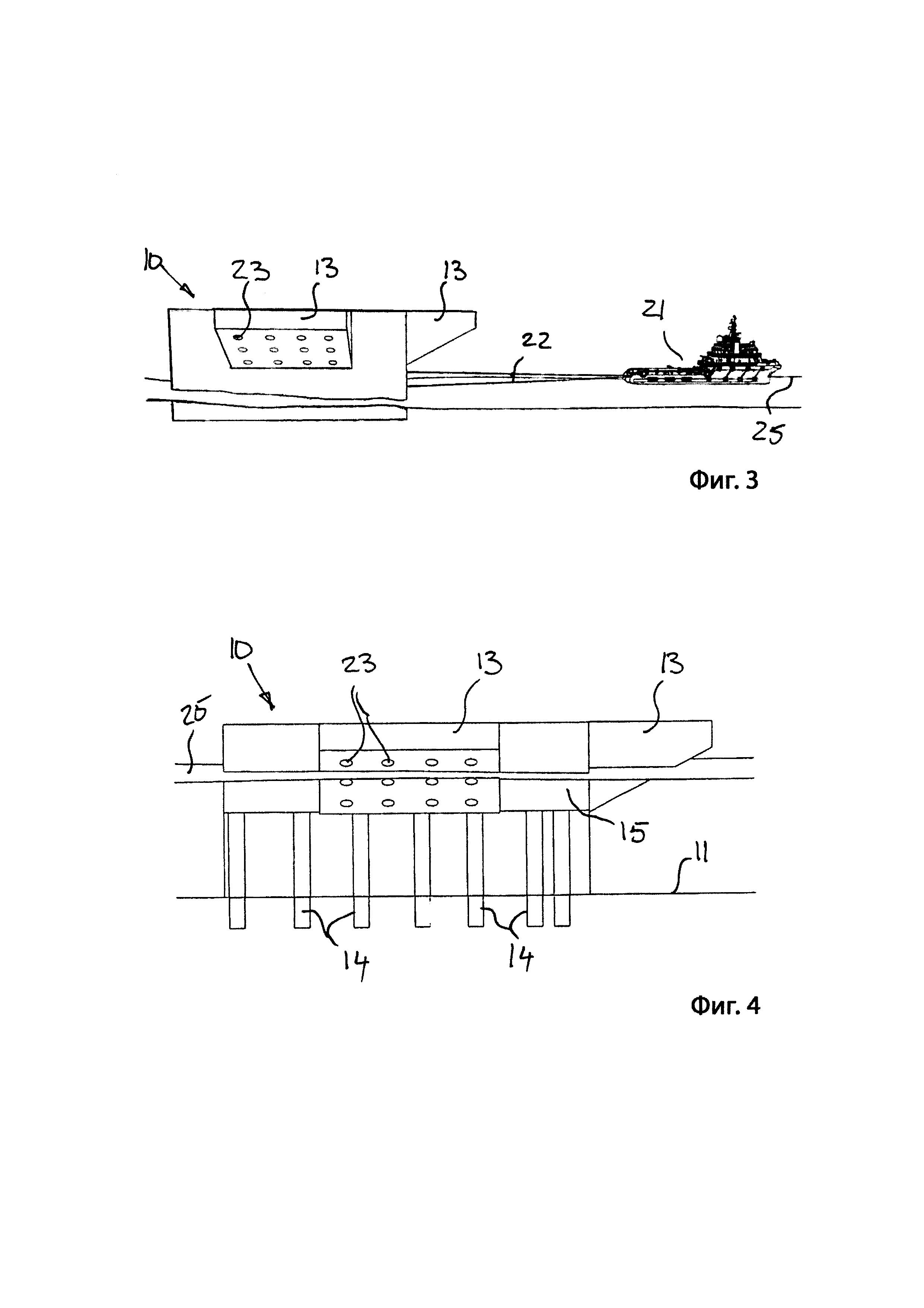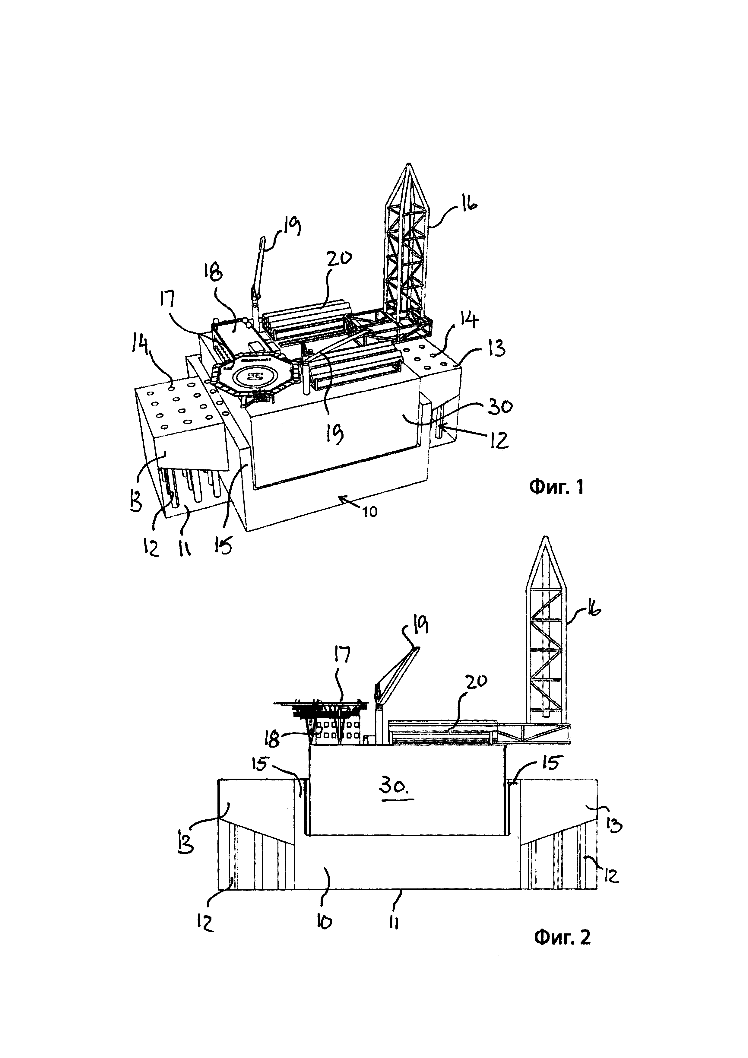 1. Опирающаяся на морское дно платформа для бурения и добычи углеводородов, содержащая опирающееся на морское дно основание (10) платформы, расположенное и неподвижно установленное относительно морского дна (11), образующее опору для буровой установки (30) и/или добывающей установки (50), отличающаяся тем, что основание (10) платформы, предпочтительно, содержит устройства, регулирующие плавучесть, выходящая вверх стеновая конструкция (15), проходящая вокруг основания (10) платформы вдоль трех сторон, а также выполненная с возможностью выступать над уровнем моря при установке на месте проведения работ, при этом одна сторона содержит проем (15') в стеновой конструкции (15) для введения плавучей буровой и/или добывающей установки (30, 50), которую устанавливают с возможностью отведения на верхней части основания (10) платформы и внутри стеновой конструкции (15), причем выходящая вверх стеновая конструкция (15) содержит предварительно установленные секции на внешней стороне стеновой конструкции (15), выполненные с возможностью использования для бурения через них скважин. 2. Опирающаяся на морское дно платформа по п. 1, отличающаяся тем, что придонное основание (10) платформы имеет U-образную форму и содержит отверстия для бурения скважин (12), причем предпочтительно, боковые стенки (15) U-образной формы образуются прямыми боковыми поверхностями. 3. Опирающаяся на морское дно платформа по п. 1 или п. 2, отличающаяся тем, что подготовленные точки для бурения скважин расположены на консольном блоке, выходящем в боковом направлении из внешней стороны боковой стенки (стенок) (15), и заканчиваются над уровнем моря (25), образуя конструкционно-неотъемлемую часть со стеновой конструкцией (15). 4. Опирающаяся на морское дно платформа по п. 2 или п. 3, отличающаяся тем, что отверстия (12) содержат стенки или обсадные трубы, выполненные с возможностью обеспечения бурения через них. 5. Опирающаяся на морское дно платформа по любому из пп. 1-4, отличающаяся тем, что устройство для бурения скважин устанавливают на трех сторонах основания (10) платформы. 6. Опирающаяся на морское дно платформа по любому из пп. 1-5, отличающаяся тем, что придонная опорная часть (10) основания содержит устройство для забивки свай (14) через основание (10) платформы и/или вдоль стеновой конструкции (15), выходящей из верхней части стеновой конструкции (15) через нижнюю часть стеновой конструкции (15). 7. Опирающаяся на морское дно платформа по любому из пп. 1-6, отличающаяся тем, что проем (15') в стеновой конструкции (15) для введения плавучего модуля (20) хранения выполнен с возможностью закрывания с помощью закрывающего механизма, образуя закрытую стеновую конструкцию (15) по периметру основания (10) платформы. 8. Опирающаяся на морское дно платформа по п. 7, отличающаяся тем, что основание (10) платформы разделено на такое же количество отсеков, что и буровой модуль (30), причем вертикальные стенки отсеков образуют несущую балку так, что вертикальные силы, создаваемые модулем (20) хранения, переносятся непосредственно на несущие балки основания (10) платформы. 9. Опирающаяся на морское дно платформа по пп. 1-8, отличающаяся тем, что плавучая буровая установка (30) содержит выносную опору, поддерживающую необходимое буровое оборудование для буровых работ, причем буровое оборудование содержит бурильную установку; при этом поддерживаем