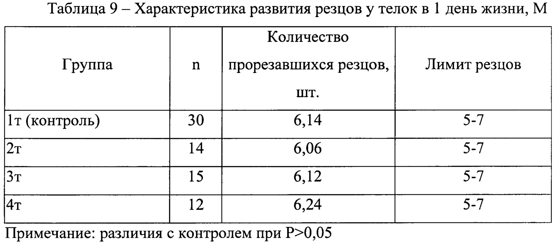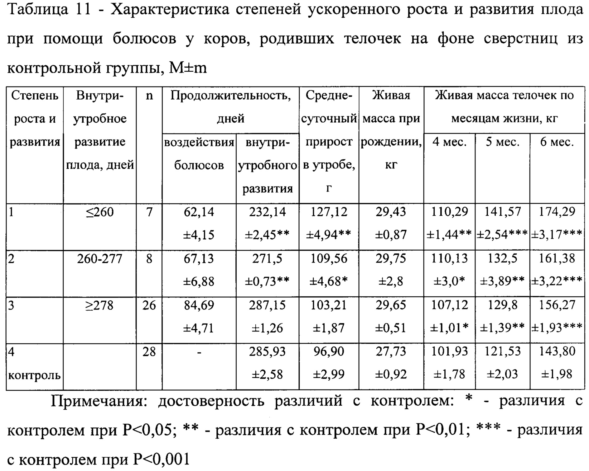 Изобретение относится к сельскому хозяйству, а именно к интенсификации воспроизводства крупного рогатого скота. Способ стимуляции ускорения роста и развития организма плода во внутриутробный период у коров включает выбор желательного генотипа, параметров живой массы, однотипное кормление в течение года. Проводят плодотворное осеменение, запуск и отел с фиксацией календарных дат. Вводят нормы минерально-витаминных болюсов пролонгированного действия для жвачных перорально, проводят контроль развития плода. Введение минерально-витаминных болюсов коровам проводится предпочтительно на 205-220 сутки от плодотворного осеменения, а на 245-260 сутки определяют степень готовности животного к отелу по изменениям родо-половых путей. Проводят отелы с определением количества прорезавшихся резцов у плода и продолжительности его внутриутробного развития. Степень способности к ускоренному росту и развитию организма плода в натальный и постнатальный периоды жизни определяют по комплексу признаков и относят к 1 степени при продолжительности внутриутробного развития плода ≤260 суток, ко 2 степени - от 261 до 270 суток и 3 степени - от 271 до 279 суток при наличии при рождении прорезавшихся резцов 5 и более. Изобретение позволяет повысить скорость и рост плода у коров во внутриутробный период. 3 з.п. ф-лы, 11 табл., 1 пр.