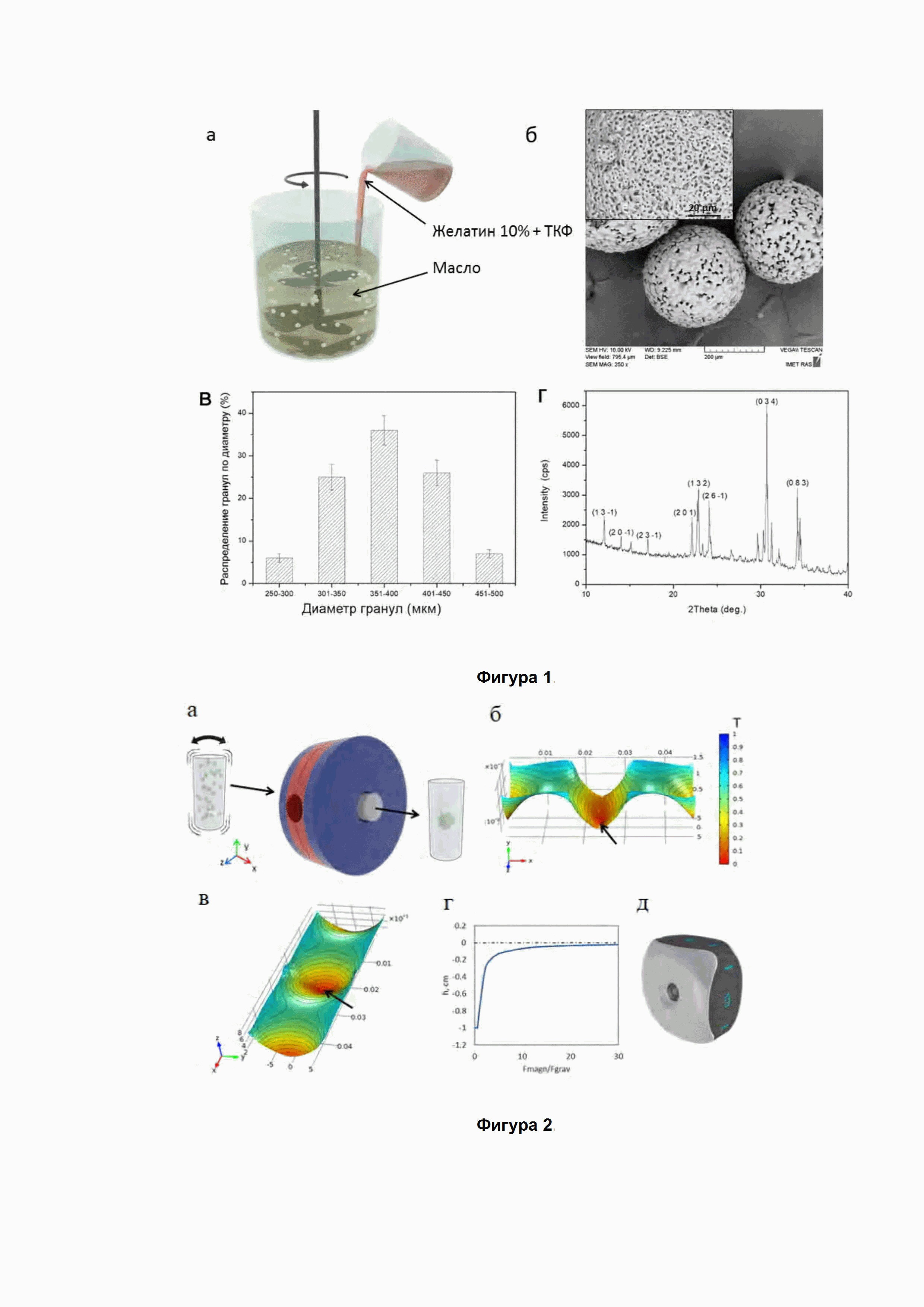 фундамента, насадок и магнитных меток. Более того, согласно данным SEM (сканирующей электронной микроскопии) и рентгеноструктурному анализу, парамагнитные соли, в частности соли гадолиния не остаются в структуре или на поверхности частиц ФК. Кроме того, трехмерный каркас, полученный способом по изобретению, имеет достаточный уровень пористости, который может обеспечить миграцию клеток внутри пористых каналов. Альтернативно, в гранулярное пространство трехмерного каркаса могут быть помещены клетки или тканевые сфероиды. Это делает получаемый трехмерный материал многообещающим кандидатом для использования в тканеинженерных подходах к регенерации кости. Таким образом, способ по изобретению дает возможность быстрой сборки и изготовления материала (или каркаса) на основе ФК. Проектирование и разработка в этом направлении может внести существенный вклад в область инженерии костной ткани.