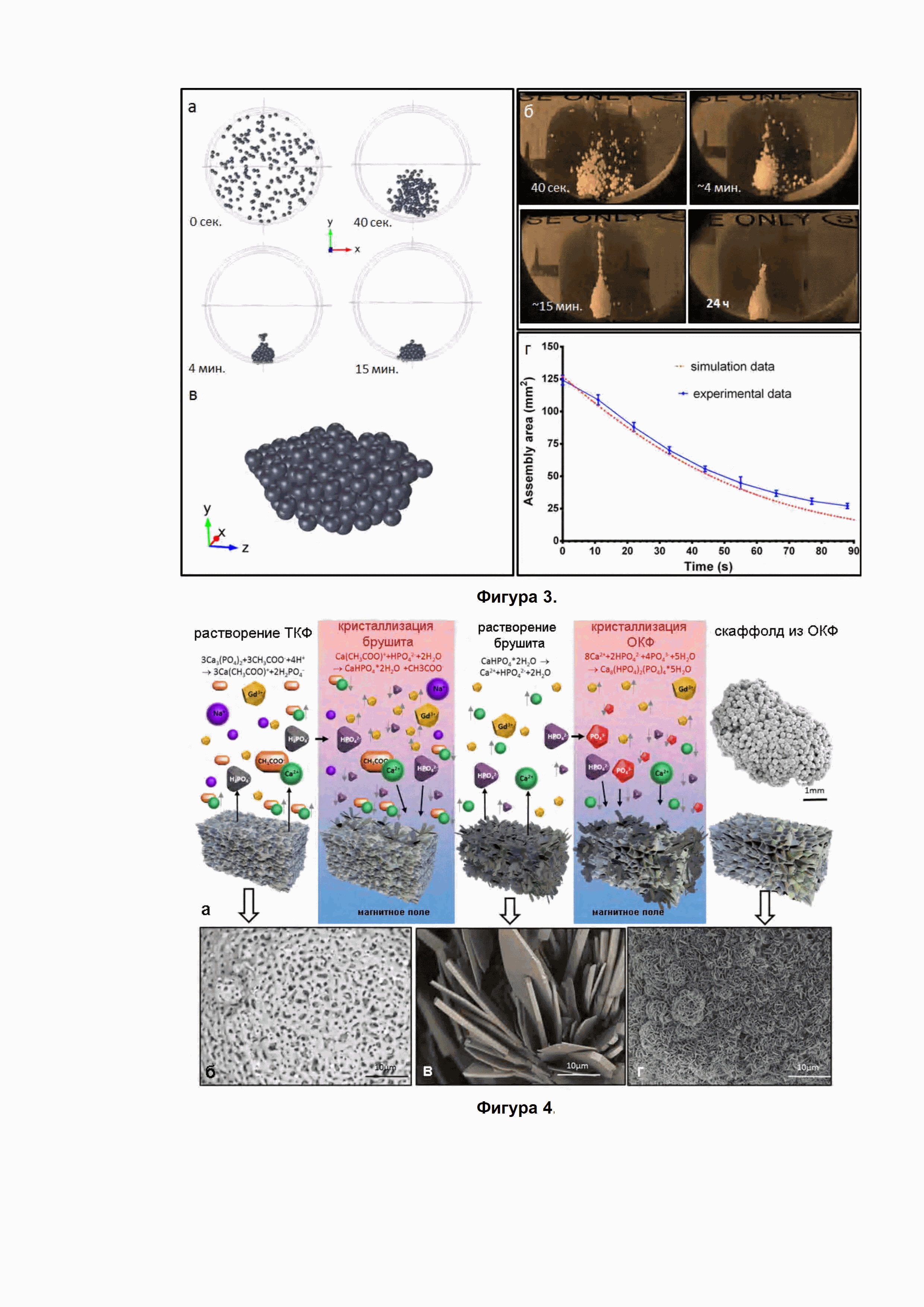 фундамента, насадок и магнитных меток. Авторы настоящего изобретения полагают, что в результате осуществления настоящего изобретения можно изготовить более совершенные биоразлагаемые каркасы с улучшенными свойствами в условиях магнитной левитации. Авторы настоящего изобретения впервые представляют успешное изготовление с помощью формирующей технологии биосовместимого каркаса для замены и регенерации костного дефекта, а именно способ сборки частиц ФК посредством магнитной левитации с использованием солей гадолиния в специальном буферном растворе с последующей перекристаллизацией в условиях левитации. Данный подход позволяет быстро создавать трехмерные каркасы на основе фаз ОКФ, в частности, в течение 40 часов.