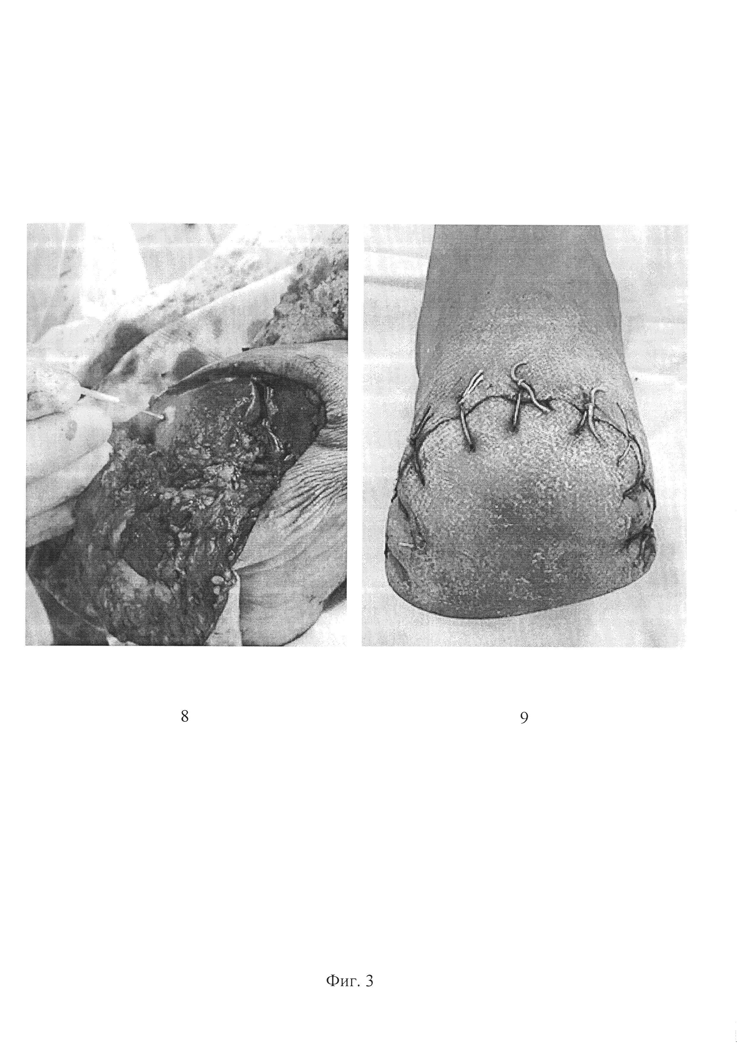 Изобретение относится к медицине, а именно к хирургии, может быть использовано при лечении пациентов с распространенным гнойно-некротическими поражением стопы на фоне диабетической ангионейропатии. В 2016-2018 г.г. распространенность сахарного диабета в Российской Федерации составила 4,348 млн., 4,498 млн., 4,493 млн. - около 3,1% населения. Количество пациентов с синдромом диабетической стопы от общего числа пациентов с установленным сахарным диабетом в Российской Федерации составляет 8,7%. Представленные данные учитывают выявленных пациентов, известно, что диагностируется не более половины случаев сахарного диабета. Прогнозируемая численность пациентов с сахарным диабетом в Российской Федерации не менее 8-9 миллионов, около 6% населения. «Не выявленные» пациенты, проживающие вне крупных населенных пунктов, не получают лечения и имеют высокий риск возникновения инвалидизирующих осложнений сахарного диабета, в том числе гнойно-некротического поражения стопы на фоне диабетической ангионейропатии [6, 10]. Гнойно-некротическое поражение стопы на фоне диабетической ангионейропатии является распространенным показанием для «высоких» ампутаций нижних конечностей. «Высокие» ампутаций нижних конечностей ассоциирующихся с риском смерти в течение 30 дней - от 4% до 48%, риском инфаркта миокарда, инсульта, или инфекцией - от 20% до 37%, смертностью ко 2 году после ампутации - 50%, пятилетней выживаемостью - от 16% до 50% [1, 2, 3, 19, 26, 27, 28, 29]. У пациентов с синдромом диабетической стопы консервативная терапия и показания для ампутации нижней конечности дистальнее голеностопного сустава определяются общепринятыми рекомендациями [5, 9, 19, 21, 25]. Известно множество способов ампутаций нижней конечности дистальнее голеностопного сустава, различающихся по уровню и направлению опила костей стопы: по Гаранжо, по Шарпу, по Лисфранку, по Жоберу, по Бона-Йегеру, по Лабори, по Шопару, по Хею [8, 22, 23, 24]. Определяя общий уровень техники, учитывая назначение заявляемого способа, следует отметить, что методы физико-химической санации ран эффективно используются при лечении пациентов с гнойно-некротическими поражением стопы на фоне диабетической ангионейропатии [12]. Применяется ультразвуковая кавитация ран с использованием приборов, генерирующих ультразвуковые колебания различной резонансной частоты, мощности и амплитуды, регулируется длительность воздействия [4, 16, 22]. Применяется управляемое отрицательное давление с регулируемыми уровнем вакуума, длительностью вакуума и интервалом между воздействиями [7]. Известно применение лазерной остеоперфорация при лечении воспалительных и деструктивных заболеваний костей с использованием приборов, генерирующих лазерное излучение различной длины волны, мощности и различных режимов (импульсный, импульснопериодический, непрерывный), регулируется длительность воздействия [11, 14, 15, 17, 18]. При изучении патентной литературы выявлены следующие способы хирургического лечения пациентов с гнойно-некротическим поражением стопы на фоне диабетической ангионейропатии. «Способ лечения гнойно-некротических поражений нижних конечностей у больных сахарным диабетом» [Лебедьков Е.В., Калинин М.Р., Кривихин В.Т., [и др.], RU 2157207 С1, опубликовано 10.10.2000, Бюл. №28]. Изобретение относится к медицине, конкретно к методам лечения трофических язв и гнойно-