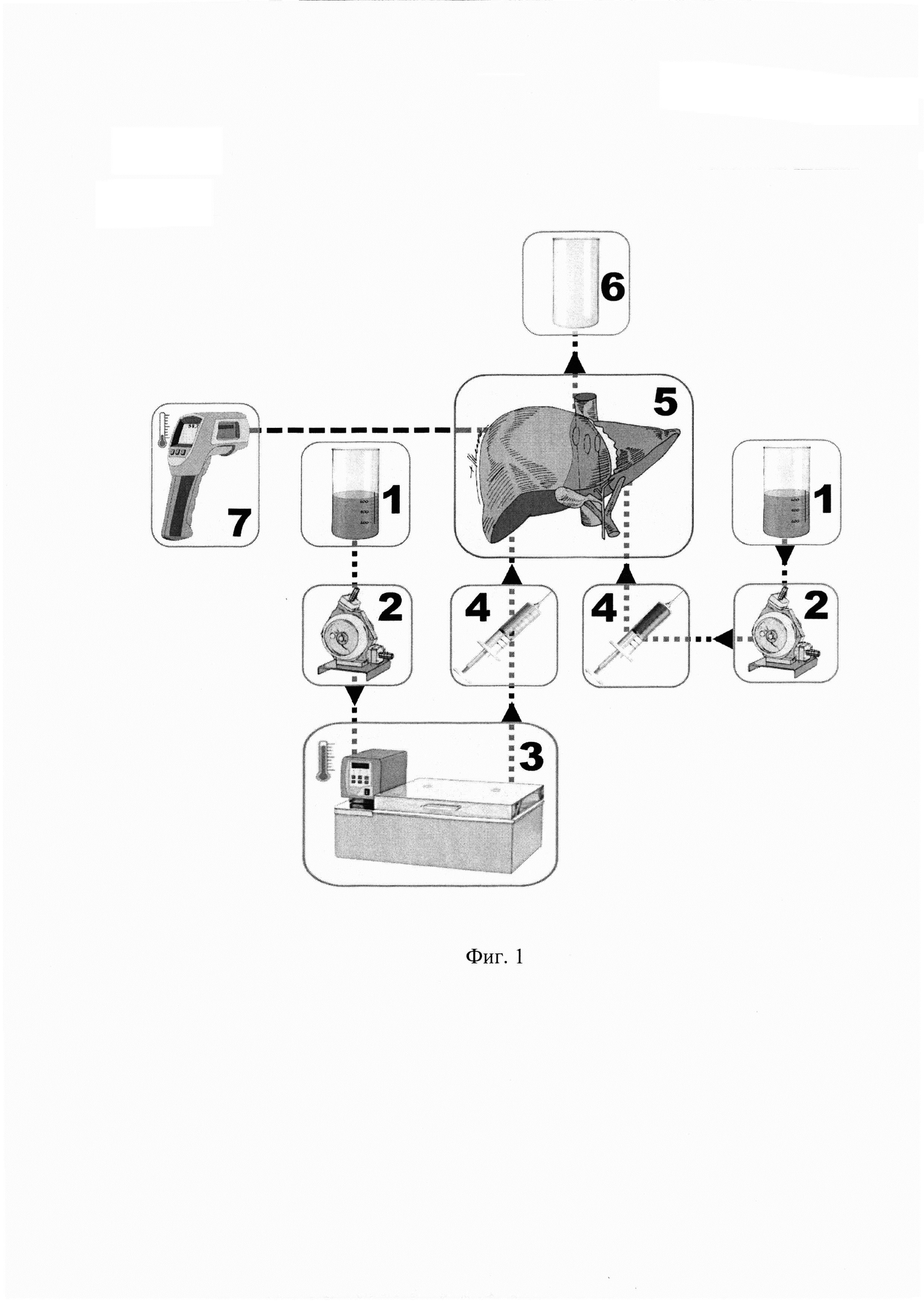 Как показано на фиг. 1, первым этапом выполняют подготовку к перфузии препарата печени 5. Далее формируют разомкнутый перфузионный контур путем присоединения систем притока к артериальным канюлям, оттока - к канюле в PC НПВ - пунктирные линии со стрелками. В состав контура также включают резервуары с перфузатом 1 и резервуар для сбора отработанного перфузата 6. Движение перфузата в контуре создают два перистальтических или центробежных насоса 2 отдельно на ПА и ЛА, направление потока обозначено стрелками. Термостатическая баня устанавливается на пути притока раствора к перфузируемой доле 3. При необходимости, инъекции препаратов выполняют посредством соединителей 4. С целью контроля температуры перфузируемой доли, выполняется контактная (бесконтактная) термометрия 7.