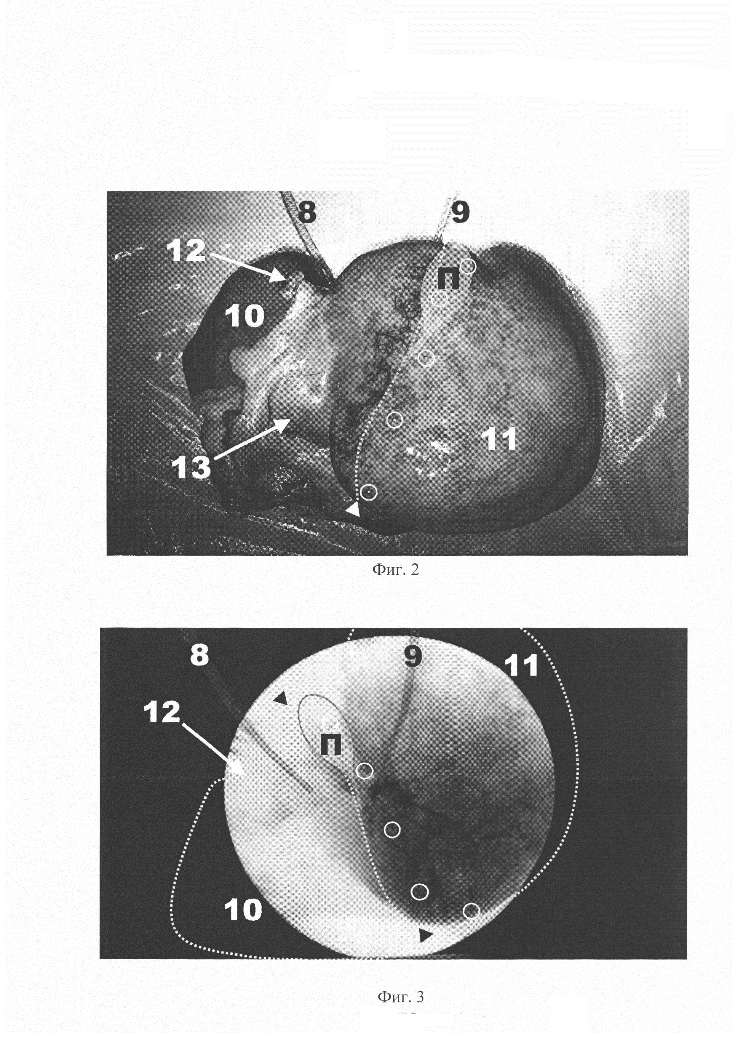Вторым этапом сформировали разомкнутый перфузионный контур как показано на фиг. 1, в состав которого включили резервуар с перфузатом 1 на фиг. 1, насосы перистальтические «LOIP ls-301» (фирмы ОАО «Лабораторное оборудование и приборы», Россия) 2 на фиг. 1, приобретенные при поддержке правительства Санкт-Петербурга (диплом ПСП №18787) и соединители для инъекций 4 на фиг. 1. В состав контура перфузируемой доли дополнительно включили термостатическую баню 3 на фиг. 1. Для сбора отработанного перфузата устанавливали емкость из полимерного материала 6 на фиг. 1 Контроль подъема температуры оценивали в начале и в конце перфузии с помощью контактного термометра 7 на фиг. 1. Затем, с целью определения междолевой границы печени болюсно ввели в ЛА 95 мл 1% раствора сини митиленовой и 100 мл 0,4% фуксина основного в ПА, что привело к окрашиванию левой 10 на фиг. 2, фиг. 3 и правой долей печени 11 на фиг. 2, фиг. 3 в цвета красителей. Междолевая граница - пунктирная линия и треугольники на фиг.2, фиг. 3 - определялась в виде линии проведенной между вырезкой НПВ и вырезкой желчного пузыря, проекция ложа которого указана П на фиг. 2, фиг. 3. При этом, так называемая анатомическая междолевая граница в виде проекции круглой связки 12 на фиг. 2, фиг. 3 и серповидной связки 13 на фиг. 2, оставалась в пределах левой доли 10 на фиг. 2, фиг. 3. Далее с целью сопоставления топографических данных с рентген-картиной выявленную междолевую границу - пунктирная линия и треугольники на фиг.2, фиг. 3 - маркировали рентген-позитивными объектами, обозначенными кругами на фиг. 2, фиг. 3.