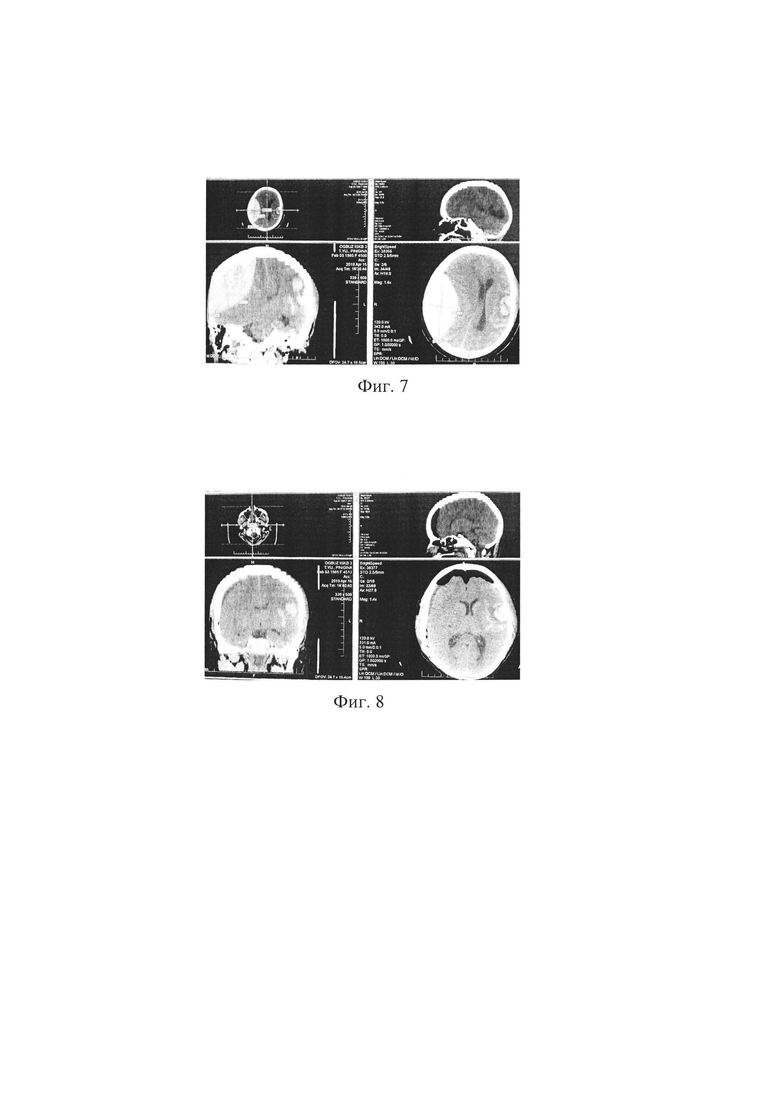 ОВИ=4×100/9=44,4% (т.е. меньше 53,9%) - риск развития гипотензивной реакции головного мозга по типу коллапса. Пациентке по жизненным показаниям выполнена КПТ, удалена ОЭГ. Во время операции ревизия эпи- и субдурального пространств, отмечена «гипотензивная» реакция мозга в виде его «западения». На 2 сутки после КПТ и удаления ОЭГ у пациентки П. отмечена «гипотензивная» реакция мозга по типу коллапса с образованием пневмоцефалии (фиг. 8).