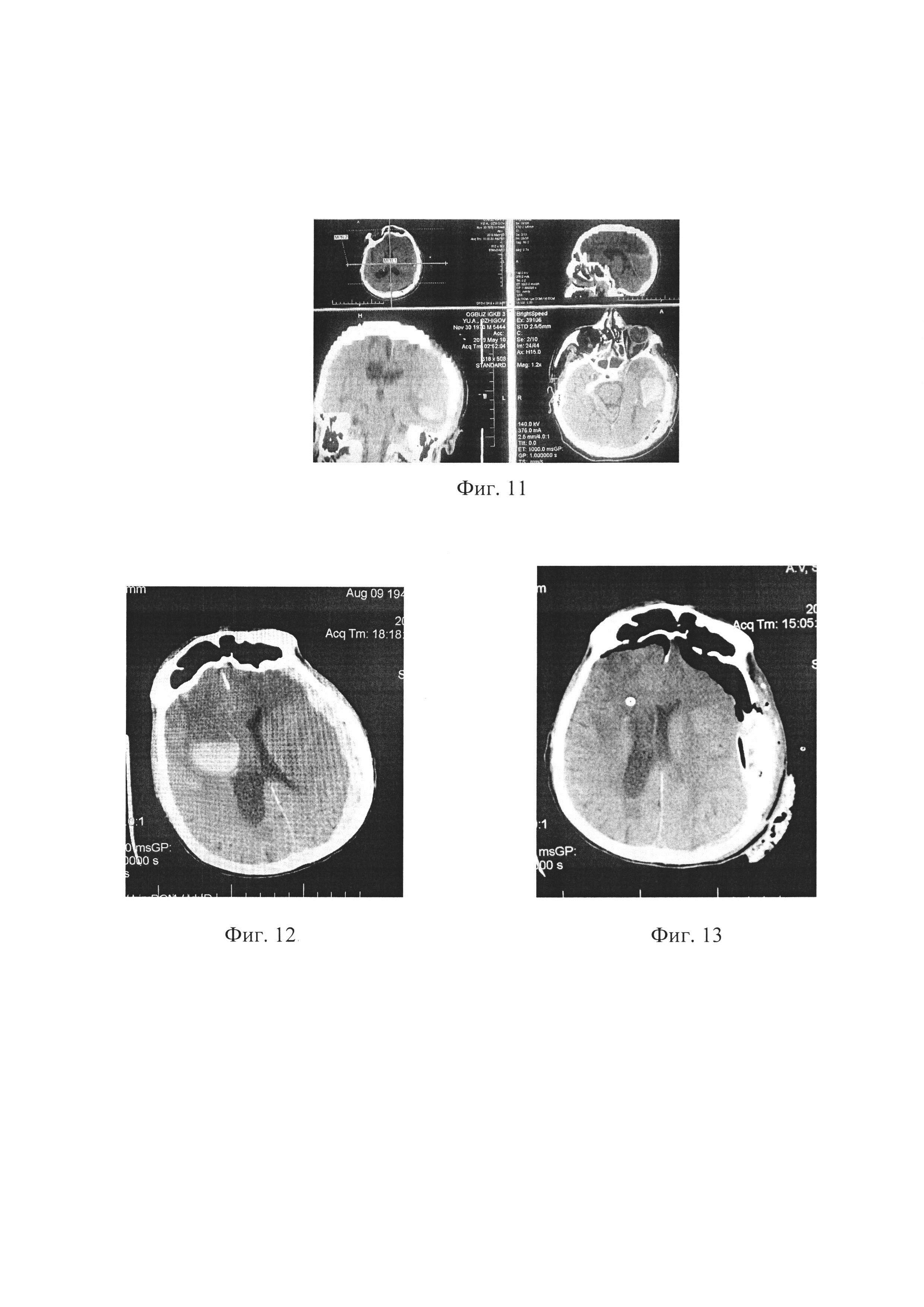 Через 7 часов состояние пациента с отрицательной динамикой, артериальное давление 120/90 мм. рт.ст., пульс 47 в минуту (брадикардия); расстройство сознания - умеренная кома (ШКГ - 8 баллов), зрачки узкие справа шире чем слева, корнеальные рефлексы угнетены, гипертонус разгибателей ног и сгибателей рук, вялая реакция на боль. Экстренно выполнена МСКТ головного мозга (через 7,5 часов после поступления). Заключение: ОЭГ справа и слева в теменно затылочной области 120×115×55 мм (объем около 380 мл); признаки латеральной и аксиальной дислокации; киста правой лобной доли; киста левой височной доли; субарахноидальное кровоизлияние в височной области; двусторонние послеоперационные изменения свода черепа (фиг. 10).