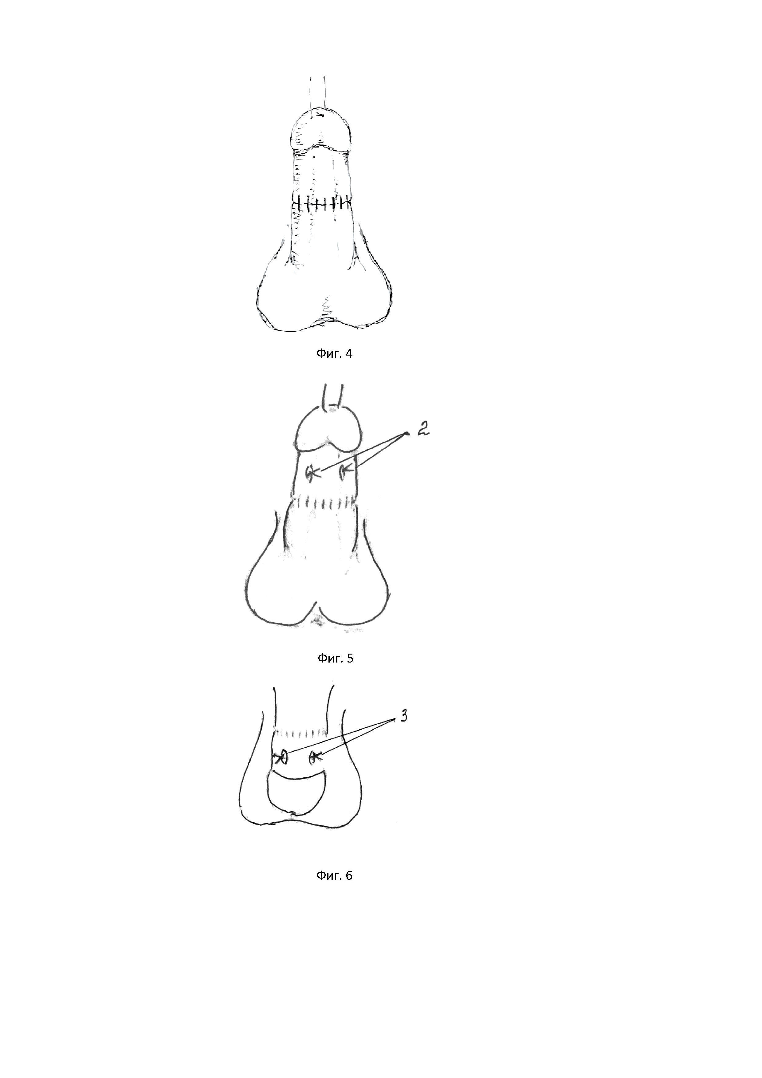 Изобретение относится к области медицины, а именно к детской урологии – андрологии, и может быть использовано для лечения утопленного полового члена у мальчиков и снижения риска развития послеоперационных осложнений. «Скрытый» половой член (СПЧ) представляет собой порок развития полового члена, характеризующийся нормально развитыми, но аномально расположенными кавернозными телами в окружающих тканях лобковой области или мошонки, проявляющийся в визуальном уменьшении ствола полового члена [1]. Различают следующие виды «скрытого» полового члена: - утопленный половой член (УПЧ) – такое состояние, при котором основание полового члена расположено в типичном месте, кавернозные тела скрыты в окружающих тканях мошонки и лона. Причиной данного состояния является нарушение фиксации кожи в стволовой части полового члена, в члено-мошоночном переходе из-за недоразвития пеноабдоминальной связки и связки, поддерживающей половой член, а также избыточное развитие подкожно-жировой клетчатки в области лона; - перепончатый половой член (ППЧ) – форма «скрытого» полового члена, для которой характерен дефицит кожи по вентральной поверхности полового члена с переходом кожи мошонки в крайнюю плоть у уздечки в виде паруса; - члено-мошоночная транспозиция – это редкий порок развития, обусловленный эктопией основания полового члена, когда кавернозные тела расположены в центре или в области основания мошонки. Наиболее часто встречается такой вид «скрытого» полового члена, как утопленный половой член. Центральным методом лечения является оперативный, преимущество которого заключается в полной коррекции анатомических аномалий при СПЧ. Для лечения УПЧ предложены различные способы, одним из осложнений которых является рецидив СПЧ ввиду повторного “соскальзывания” кожи. Известен способ оперативного лечения, который заключается в выведении кавернозных тел из окружающих тканей с формированием механизмов фиксации [2]. Способ осуществляют следующим образом. Производят разрез кожи у основания полового члена в виде буквы W, что позволяет достаточно широко обнажить основание кавернозных тел и семенные канатики. Иссекают дизэмбриогенетические тяжи по дорсальной поверхности полового члена от ствола до головки. Далее формируют пеноабдоминальный угол путём фиксации белочной оболочки у основания максимально выведенного полового члена к надкостнице лона неабсорбируемой нитью. Дополнительно делают два разреза кожи у основания полового члена вентрально на 5 и 7 часах условного циферблата, и фиксируют кожу к белочной оболочке внутрикожными швами нерассасывающейся монофиламентной нитью. Однако, предложенная методика достаточно сложна, так как требует выполнения W-образного разреза и дополнительной фиксации белочной оболочки к надкостнице лона. Известен способ [3], который заключается в проведении кругового разреза на внутренней поверхности крайней плоти, отступив 5 мм от corona glandis penis, вертикального разреза вниз к основанию полового члена. Способ осуществляют следующим образом. Пенис отводят к пенопубическому соединению, дизэмбриогенетические тяжи иссекают, кожу в пенопубическом углу сшивают с фасцией Бака на 2 и 10 часах условного циферблата, а на сформированном пеноскротальном углу - в положениях 5 и 7 часов условного циферблата. Затем ко