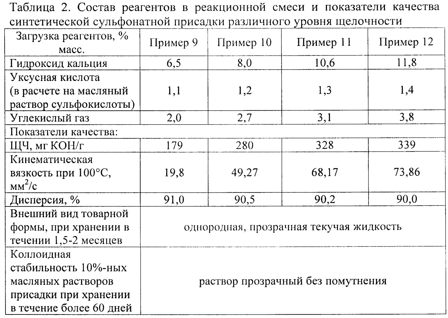 Изобретение относится к нефтехимии и может быть использовано для получения синтетической сульфонатной присадки различного уровня щелочности к моторным маслам. В современных двигателях внутреннего сгорания смазочное масло должно противостоять окислению при высоких температурах, достигающих в дизельных двигателях 250°С и выше, обладать высокими моющими, нейтрализующими, диспергирующими, противоизносными и другими эксплуатационными свойствами, что достигается введением присадок. Одной из основных присадок, входящих в композиции масел и пакеты присадок, является сульфонатная присадка. Сульфонаты с низким щелочным числом (ЩЧ) выполняют функции моющих присадок, поддерживающих чистоту поверхностей двигателя. Сульфонаты с высоким ЩЧ служат для нейтрализации кислот, образующихся в масле в процессе его эксплуатации. Такие сульфонаты способствуют ингибированию коррозии. Использованные для определения сульфонатов термины «низкое щелочное число» и «высокое щелочное число» следует толковать в соответствии со стандартом ASTM D2896 «Standard Test Method for Base Number of Petroleum Products by Potentiometric Perchloric Acid Titration». Этот метод испытания относится к определению дающих щелочную реакцию компонентов нефтепродуктов потенциометрическим титрованием перхлорной кислотой в ледяной уксусной кислоте. Термин «низкое щелочное число» указывает на цифровые значения щелочного числа, которые составляют меньше 50 мг КОН/г, а термин «высокое щелочное число» указывает на цифровые значения щелочного числа, которые превышают 50 мг КОН/г и могут достигать уровня 400-600 мг КОН/г. Важным показателем качества присадок является коллоидная стабильность, которая оценивается следующими фотоколориметрическими методами. 1. Оценка агрегативной устойчивости заключается в определении оптической плотности толуольного раствора присадки при добавлении коагулирующего агента - ацетона. С помощью этого метода определяются пороги коагуляции СА1 и СА2 присадки, где: CA1 - первый порог коагуляции, характеризующий начало коагуляции дисперсной системы присадки; СА2 - второй порог коагуляции, свидетельствующий о полной коагуляции дисперсной системы присадки. Чем выше пороги коагуляции, тем выше коллоидная стабильность присадки, тем больше срок ее действия в составе моторного масла. 2. Оценка дисперсности системы «масло-присадка». Дисперсность определяется отношением величин оптической плотности раствора присадки с концентрацией 10% масс. в масле, измеренной на светофильтрах с длиной волны 490 и 670 нм, выраженное в %. Оценка дисперсности в случае щелочных карбонатированных присадок позволяет характеризовать относительное количество мелких частиц коллоидного карбоната, растворенного в масле, которое непосредственно связано с его стабильностью. Нейтральные сульфонаты представляют собой высоковязкие мыла. Известен способ (Пат. РФ №2152384) получения сульфонатной присадки с низким щелочным числом и относительно низкой вязкостью из синтетических как низко-, так и высокомолекулярных сульфокислот прямой нейтрализацией оксидом или гидроксидом щелочноземельного металла, взятого в избытке от стехиометрического, с использованием хлоридсодержащих солей и карбоновых кислот. Полученная композиция сульфонатной присадки содержит сульфонат кальция, карбоксилат кальция, хлориды и разбавитель. Недо