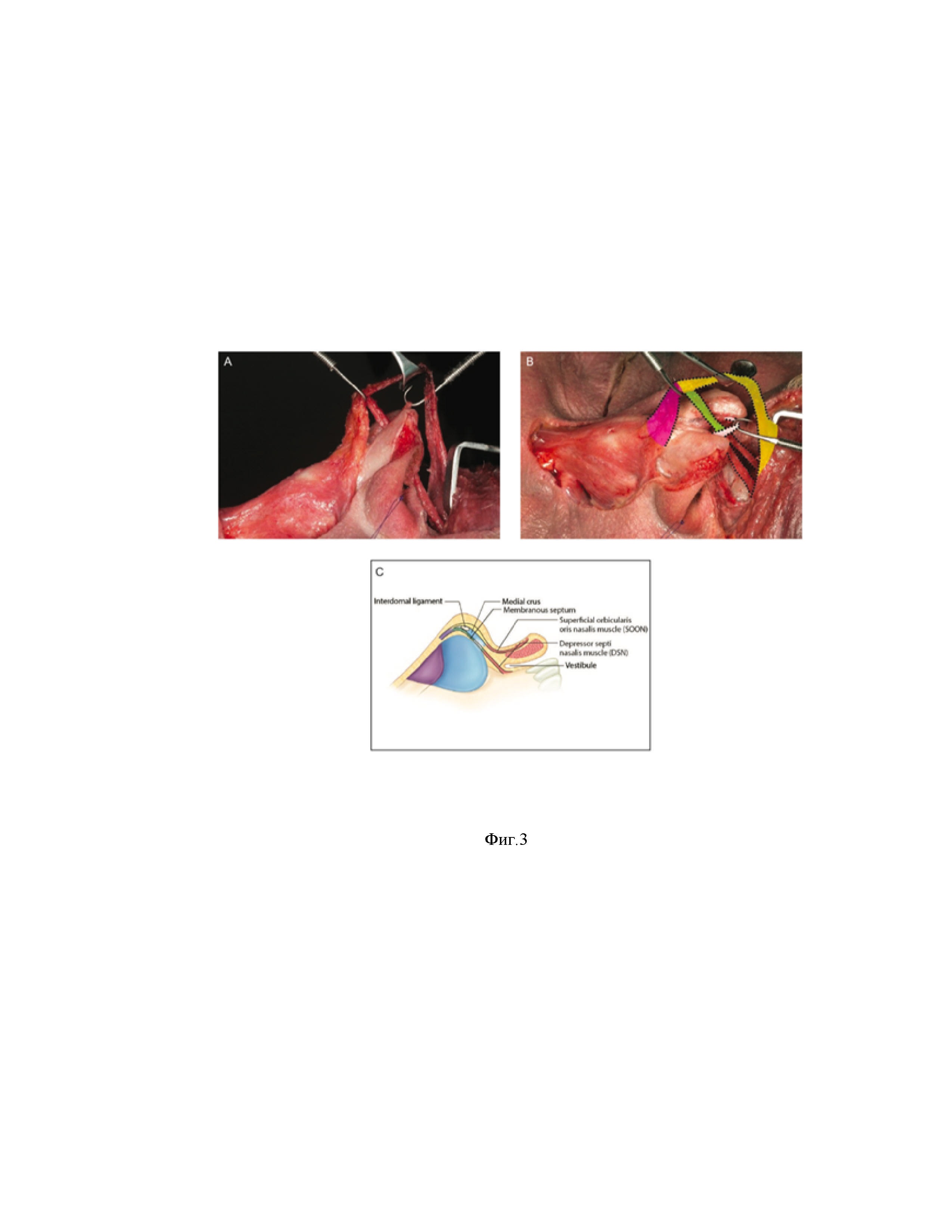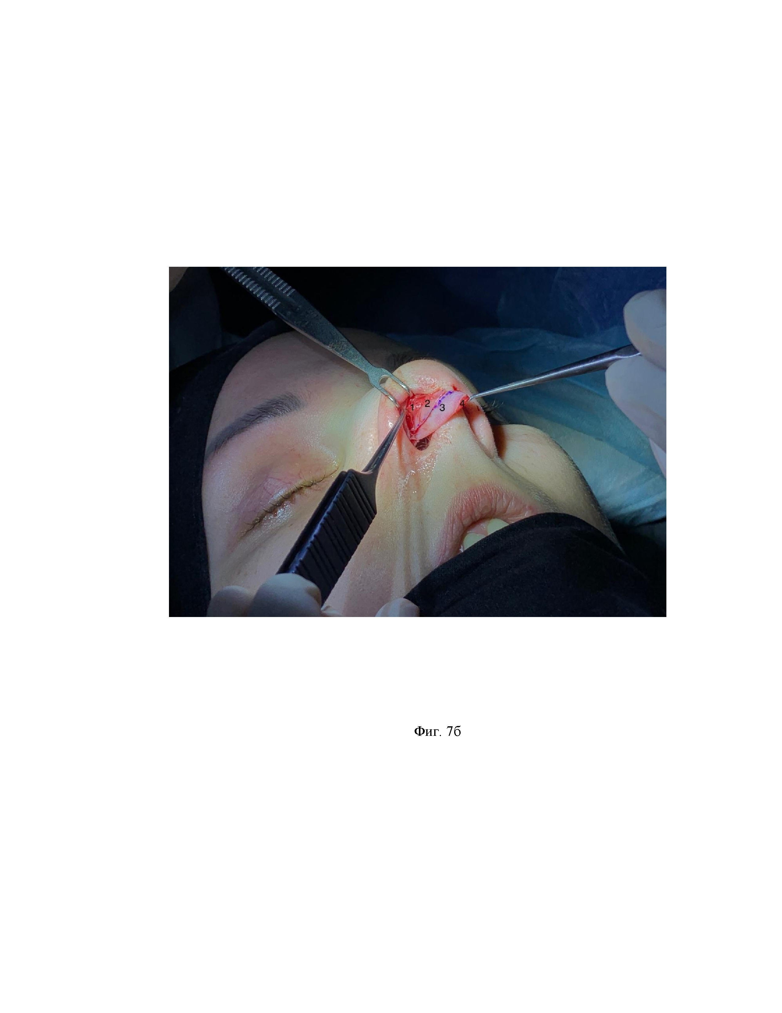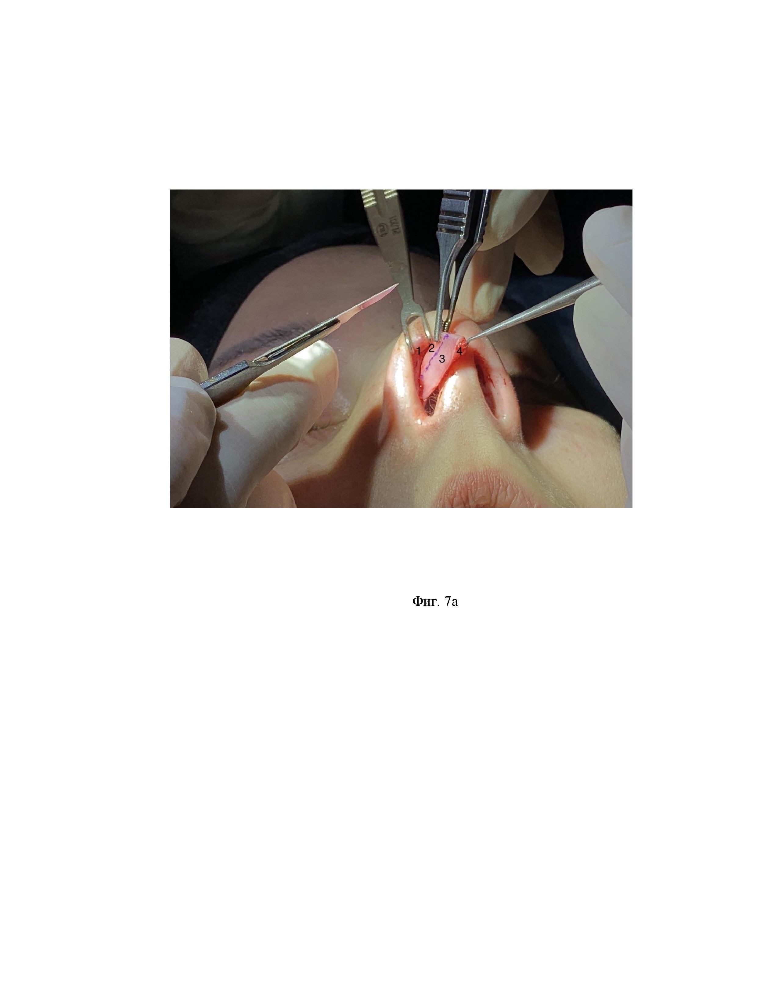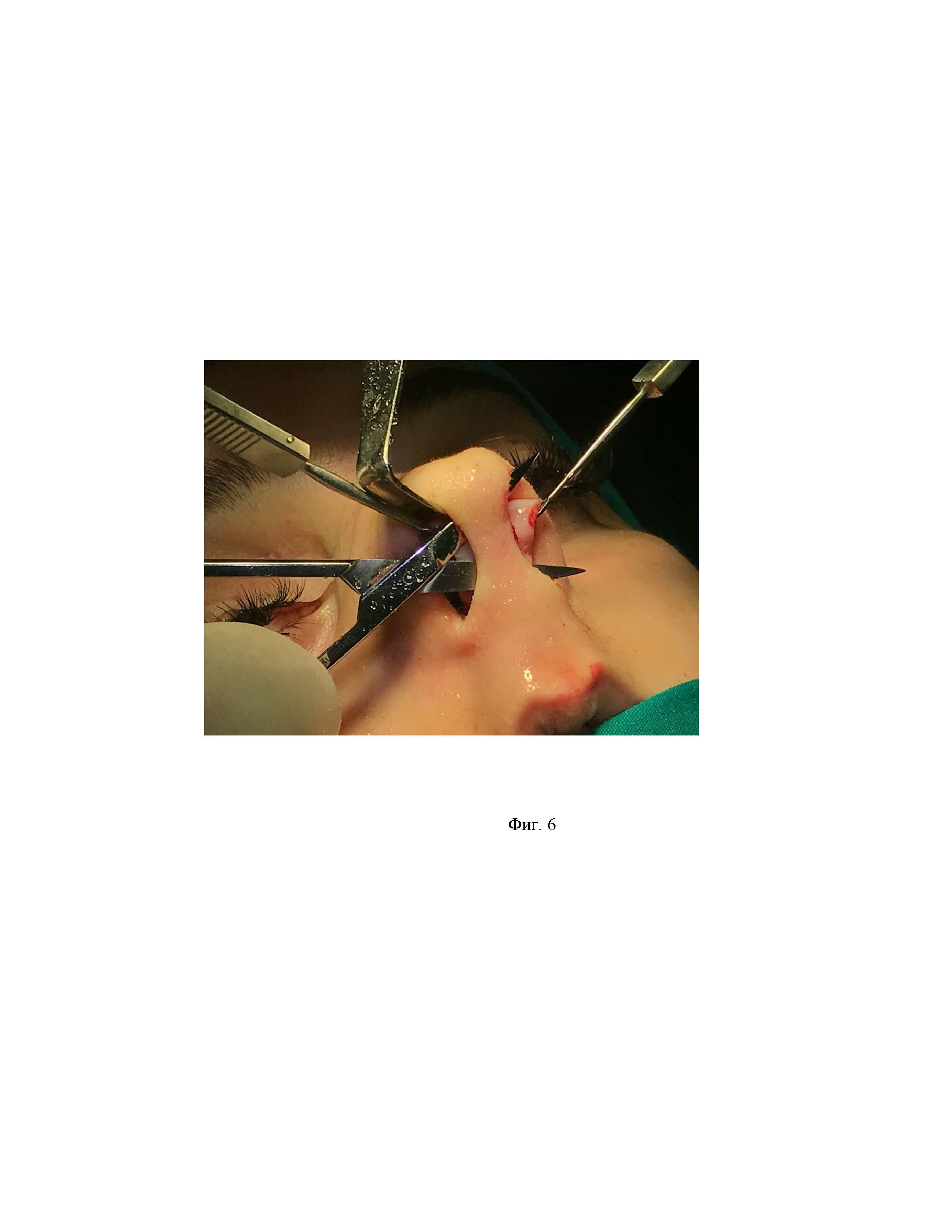Изобретение относится к медицине, а именно - к пластической хирургии, и может быть использовано при проведении ринопластики, конкретнее - коррекции формы кончика носа. Ринопластика является одной из самых сложных процедур в пластической хирургии, а пластика кончика носа - ее ключевой этап, определяющий функцию и эстетику носа. Изменение анатомической структуры носа в погоне за красотой его очертаний может приводить к функциональным нарушениям наружного и внутреннего носовых клапанов, особенно у пациентов с существующей предрасположенностью их дисфункции, что требует тщательного хирургического планирования. Далее в тексте заявителем приведено разъяснение, которое необходимо для облегчения однозначного понимания сущности заявленных материалов и исключения противоречий и/или спорных трактовок при выполнении экспертизы по существу: Пинч-деформация кончика носа – это сужение кончика носа в области куполов хряща крыла носа, переходящее в вогнутую деформацию латеральной ножки (ЛН). Существующие методы коррекции широкого (например, бульбообразного или коробочного) кончика носа сводятся к резекции цефалического и реже каудального края латеральной ножки (далее - ЛН) хряща крыла носа (нижний латеральный хрящ, или хрящ крыла носа, далее - ХКН). В результате чего, с одной стороны, достигается желаемое сужение кончика носа, с другой стороны - ослабляется структурная опора хряща крыла носа. Поэтому при коррекции широкого кончика носа требуется создать условия хорошей поддержки крыльев носа [Helmut Fischer, Wolfgang Gubisch. Nasal Valves—Importance and Surgical Procedures// Facial plastic surgery. – 2006. - Volume 22, number 4. - Pages 266-280]. Хрящ крыла носа является основным компонентом кончика носа. Конфигурация и стабильность ХКН обеспечивает как внешние очертания кончика носа [Douglas Sidle, Katherine Hicks. Nasal Obstruction Considerations in Cosmetic Rhinoplasty// Journal Otolaryngologic Clinics of North America. - 2018 - Issue number 5. - Pages 987-1002]. https://doi.org/10.1016/j.otc.2018.05.011], так и функцию носовых клапанов, и ослабление латеральной ножки приводит к нежелательным последствиям клапанной дисфункции [Rod J., Joseph Raniere, Richard Y.Ha. The Alar Contour Graft: Correction and Prevention of Alar Rim Deformities in Rhinoplasty// From the university of Texas Southwestern Medical Center. - Received for publication 2001, - March 27. - Pages 2495-2505], [C. Spencer Cochran, David A. Sieber. Extended Alar Contour Grafts: An Evolution of the Lateral Crural Strut Graft Technique in Rhinoplasty// Plastic and Reconstructive Surgery. – 2017. – October. - Pages 559-567], [Amir A. Sazgar, Charles Woodard, Sam P. Most. Preservation of the Nasal Valve Area With a Lateral Crural Hinged Flap: A Cadaveric Study// Aesth Plast Surgery – 2012. – 36. - Pages 244–247]. Слабые латеральные ножки даже при избыточной их ширине не способны обеспечить адекватную поддержку зоны носовых клапанов и способствуют коллапсу внутреннего и наружного носовых клапанов [Henry P. Barham, Anna Knisely, Jenna Christensen, Raymond Sacks, George N. Marcells, Richard J. Harvey. Costal Cartilage Lateral Crural Strut Graft vs Cephalic Crural Turn-in for Correction of External Valve Dysfunction// JAMA Facial Plastic Surgery. - Published online. – 2015. - August 6. - Pages Е1-Е6]. При цефалической резекции ХКН возможным неблагоприятным функциональным и эстетическим последствием является не только ослабление латеральной ножки, но и повреждение зоны связки скролл, которая соединяет ХКН и верхний латеральный хрящ (далее - ВЛХ) и является как главным механизмом поддержки кончика носа [Douglas Sidle, Katherine Hicks. Nasal Obstruction Considerations in Cosmetic Rhinoplasty// Journal Otolaryngologic Clinics of North America. - 2018 - Issue number 5. - Pages 987-1002. https://doi.org/10.1016/j.otc.2018.05.011], так и важным элементом функции носовых клапанов. Разрушение зоны связки скролл способствует ослаблению поддержки кончика н
