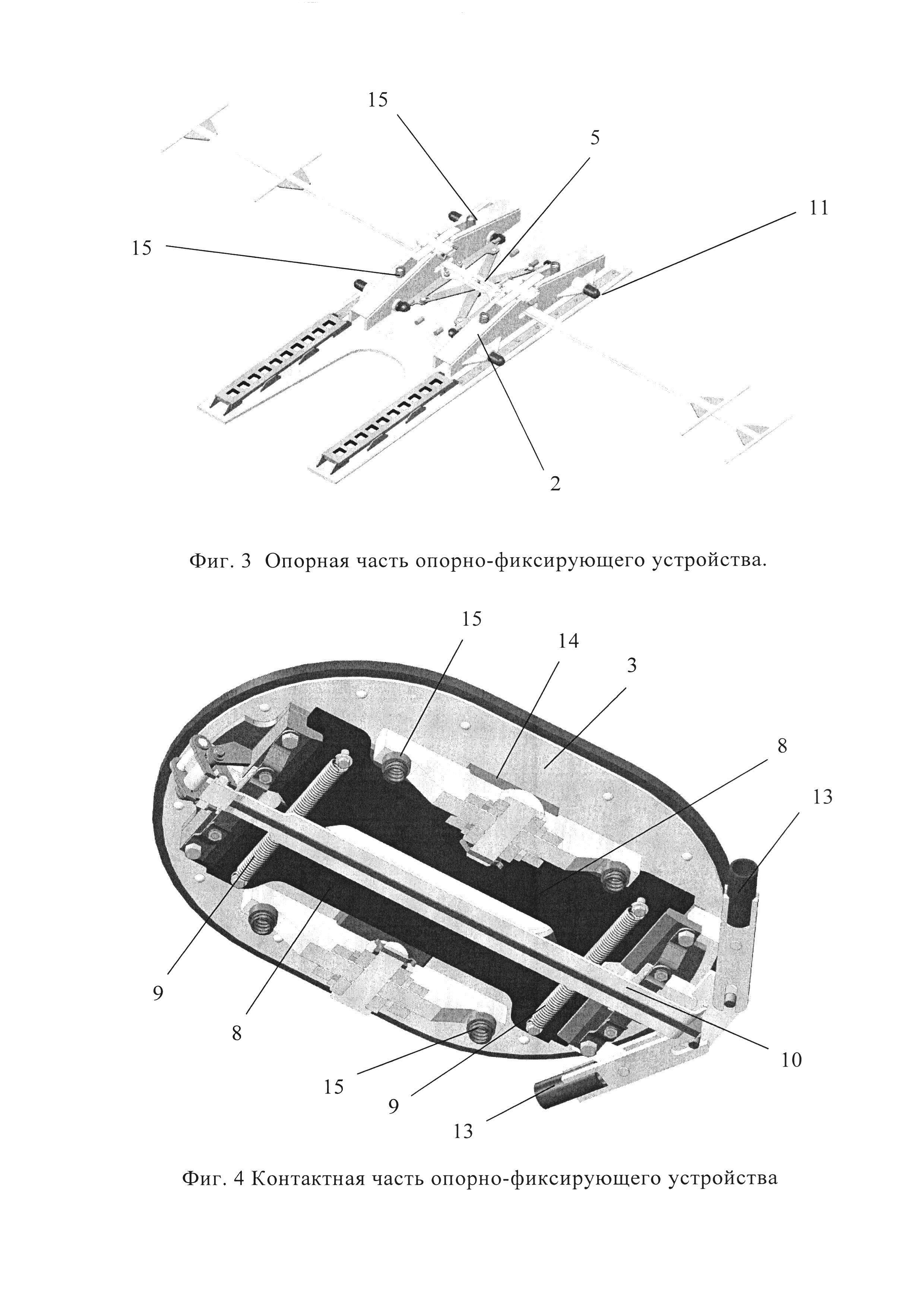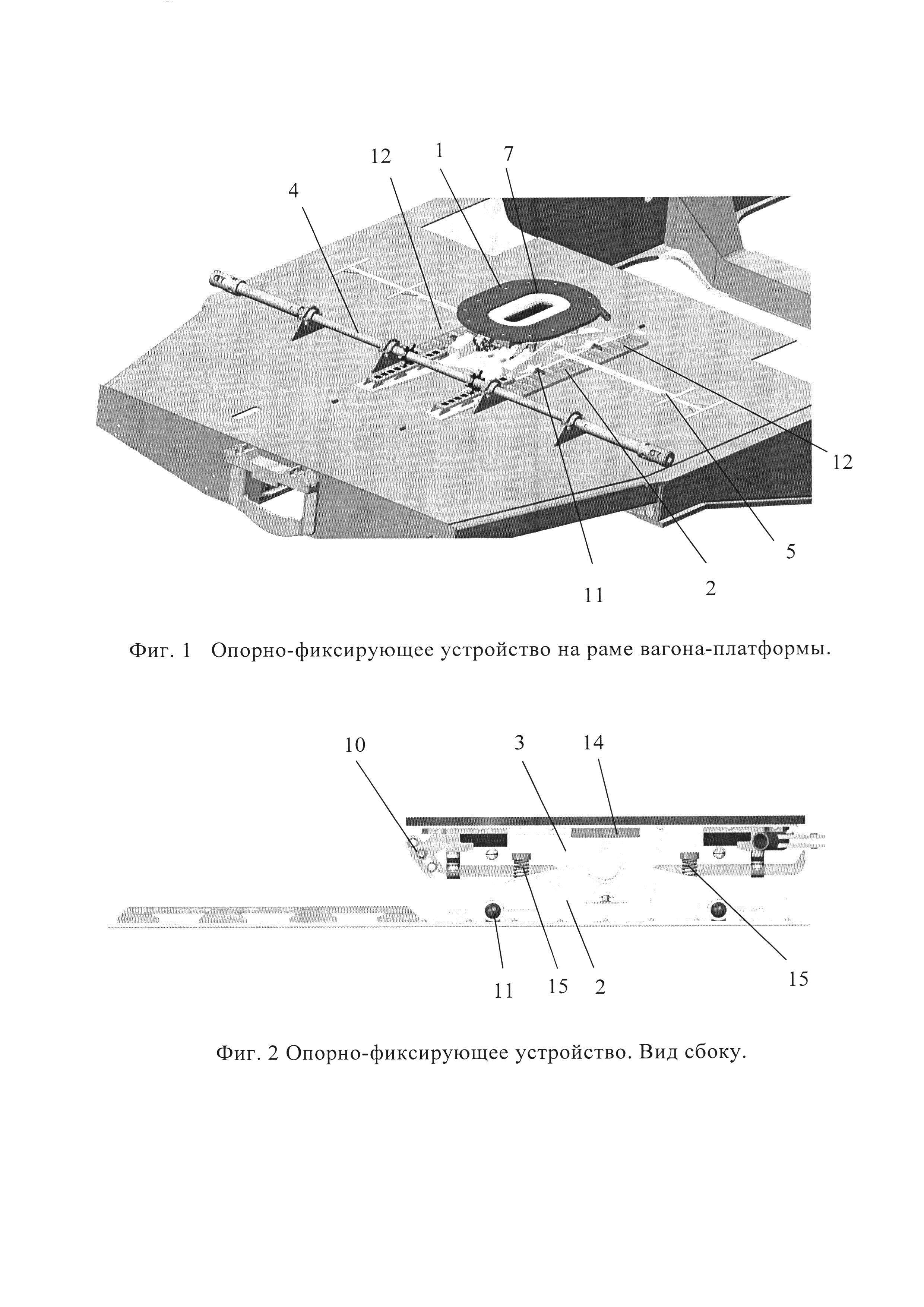 Изобретение относится к области железнодорожного транспорта, в частности к конструкции опорно-фиксирующего устройства шкворневого узла полуприцепа на вагоне-платформе. Опорно-фиксирующее устройство состоит из двух шарнирно соединенных между собой частей и жестко закреплено на раме вагона. В контактной части устройства выполнен продольный паз. Шкворень, установленный в паз, может совершать продольное перемещение в пределах ±100…150мм. Повышается надежность автоматической фиксации полуприцепа на платформе. 2 з.п. ф-лы, 5 ил.