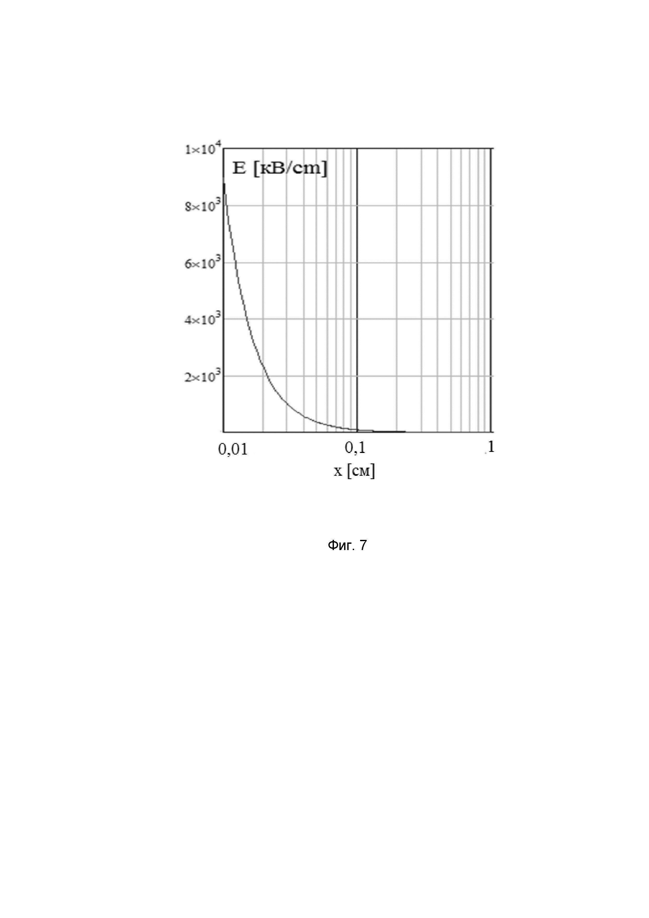 10-8 Кл. Расчет электрического поля (фиг. 7) от такого заряда показывает, что экранировка практически отсутствует при расстоянии 3 мм от этого заряда до вершины соседнего полуэллипсоида. Таким образом, можно распологать инициаторы 3 импульсных стримерных коронных разрядов в форме полуэллипсоидов вращения на расстоянии S > 3 мм между их вершинами.