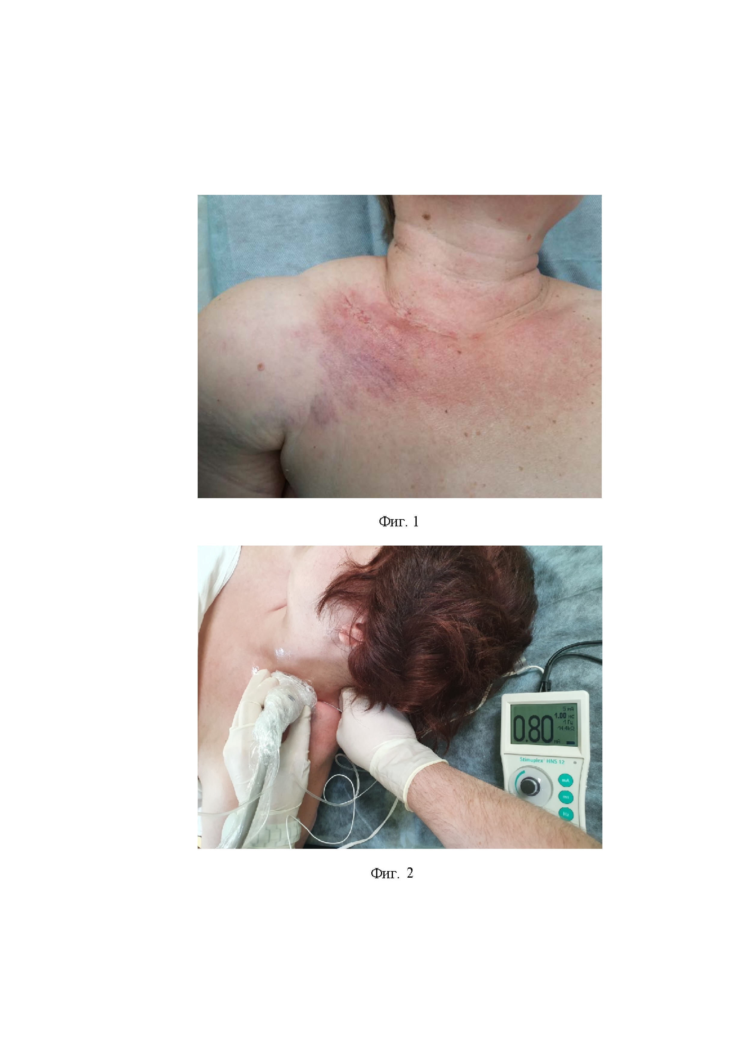 Изобретение относится к медицине, а именно к анестезиологическому обеспечению хирургических вмешательств на верхней конечности у пациентов с поздними лучевыми повреждениями. Лучевая терапия является одним из методов адъювантного лечения рака молочной железы после ранее перенесенного этапа хирургического лечения. Ее последствием является развитие у части пациенток (10-15%) (Трофимова, О.П Радиационно-индуцированные повреждения легких у больных раком молочной железы после органосохраняющего лечения / О.П. Трофимова, С.И. Ткачев, С.М. Иванов и др. // Современная онкология. - 2015. - Т. 17. - №1. - С. 39-43) поздних лучевых повреждений мягких тканей облучаемой области, в том числе шеи до 37-41% при добавлении в зону облучения шейно над, -подключичной области со стороны поражения (Dunne-DalyC. F. Potential long-term and late affects from radiation therapy // Cancer Nurs. - 1995. - Vol. 18, № 1. - P. 67 - 78). (Dunne-DalyC. F. Potential long-term and late affects from radiation therapy // Cancer Nurs. - 1995. - Vol. 18, № 1. - P. 67 - 78). Последствия ранее перенесенной подмышечной лимфаденэктомии и прогрессирующего фиброза в зоне облучения могут приводить к развитию лимфостаза верхней конечности у 10-30% пациентов, лечение которого также является хирургическим (отдаленные результаты реконструктивно-пластических операций о больных вторичным лимфостазом верхних конечностей Пасов В.В. Червякова А.Е. Сибирский онкологический журнал. 2013, № 2, стр. 72-76). Корригирующие операции при лимфостазе верхней конечности являются травматичными и требуют комплексного подхода к анестезиологическому обеспечению, одним из компонентов которого является межлестничная анестезия плечевого сплетения. В настоящее время межлестничная блокада плечевого сплетения с УЗИ-навигацией и электронейростимуляцией широко применяется в анестезиологии при операциях на плечевом, локтевом, лучезапястном суставах, плече, предплечье, кисти (Выбор метода использования регионарной анестезии плечевого сплетения межлестничным доступом при артроскопических операциях на плечевом суставе. Крылов С.В., Пасечник И.Н., Капырина М.В., Уколов К.Ю. Уральский медицинский журнал. 2019. №7 (175). С. 138-144). Неоспоримым преимуществом данного вида анестезии является отказ от общей анестезии и искусственной вентиляции легких, минимизация применения седативных средств во время операции и анальгетиков в послеоперационном периоде, адекватный эффективный уровень сенсорного и моторного блока, позволяющего безопасно выполнить хирургическое вмешательство на верхней конечности. Известны способы межлестничной анестезии плечевого сплетения (Гаврилин С.В., Тихонов Л.Г. Блокада плечевого сплетения из надключичного доступа. Вестник хирургии им. Грекова. 1984. № 132 (12). C.75-77; Winnie A.P. Interscalene brachial plexus block. Anest.Analg.1970.V.49.P.455-466.), в том числе с применением для повышения ее эффективности ультразвуковой (УЗ) навигации, электронейростимуляциии уточненных анатомических ориентиров (Проводниковая анестезия плечевого сплетения под ультразвуковым контролем С.В. Свистунов, A.M. Юрковский Проблемы здоровья и экологии 2011. № 1 (27), стр. 26-29; Блокада плечевого сплетения межлестничным доступом у пациентов с переломами ключицы: рандомизированное сравнение техник с ультразвуковым контролем и нейростимулятором. Ю.Л. Кучин. Новости хирургии. Том 21, № 6, 2013, стр. 105-108; Использование ультразвуковой визуализации при выполнении надключичного блока плечевог