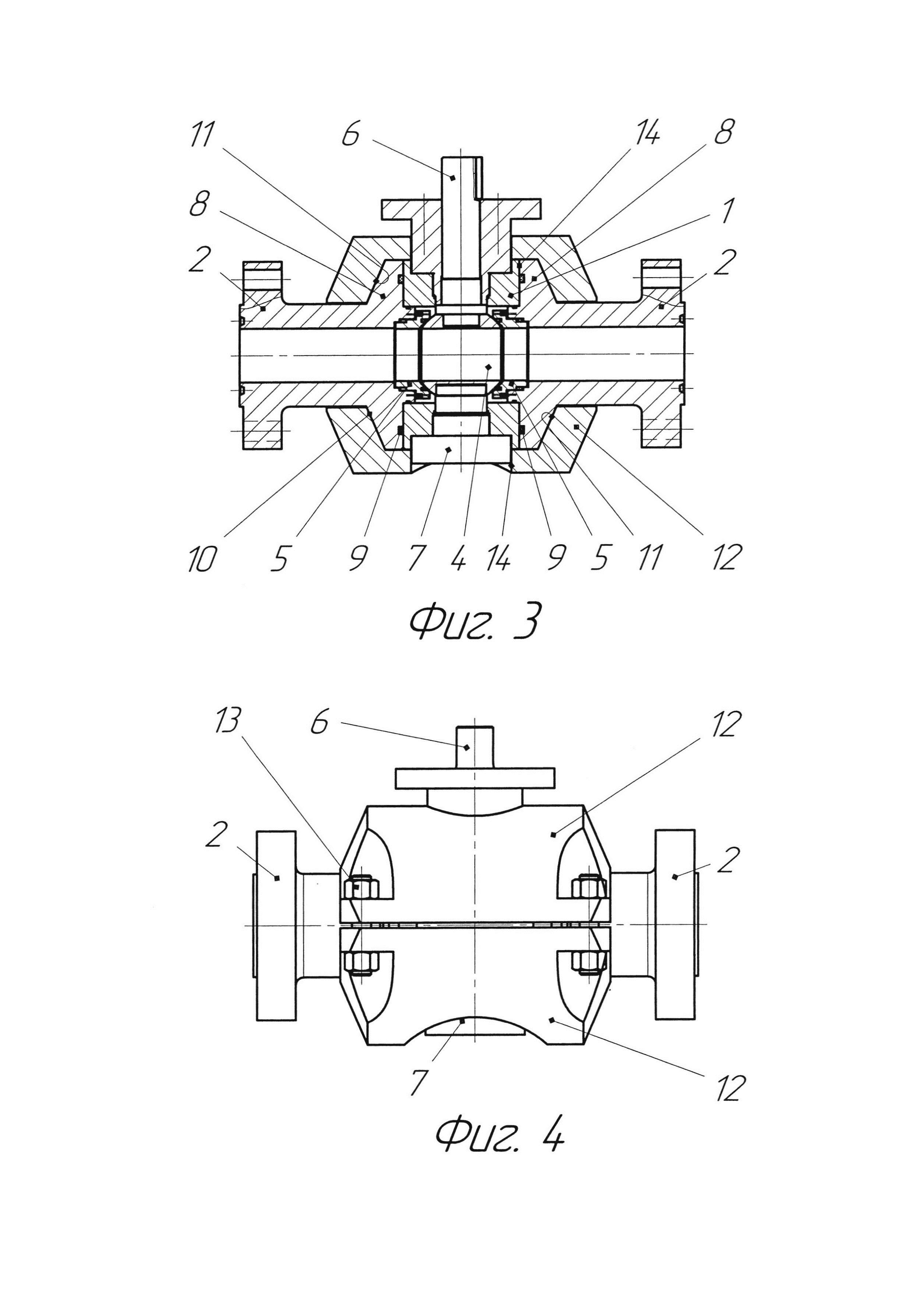 1. Шаровой кран, содержащий кольцевой корпус с размещенным в центре его внутренней полости с проточным каналом пробку, взаимодействующую с двух сторон с уплотнительными элементами седел, установленных в расточках патрубков, соединенных с кольцевым корпусом, отличающийся тем, что фланцы патрубков, сопрягаемые с кольцевым корпусом, выполнены с конусной наружной стенкой, взаимодействующей с ответными конусными поверхностями разъемной, охватывающей оба фланца рубашкой, состоящей из двух равных снабженных выемками половин, соединяемых друг с другом посредством крепежа. 2. Шаровой кран по п. 1, отличающийся тем, что разъем рубашки может быть расположен как в вертикальной, так и в горизонтальной плоскостях. 3. Шаровой кран по п. 1, отличающийся тем, что отверстия для соединения половин рубашек посредством крепежа расположены в углах половинок.