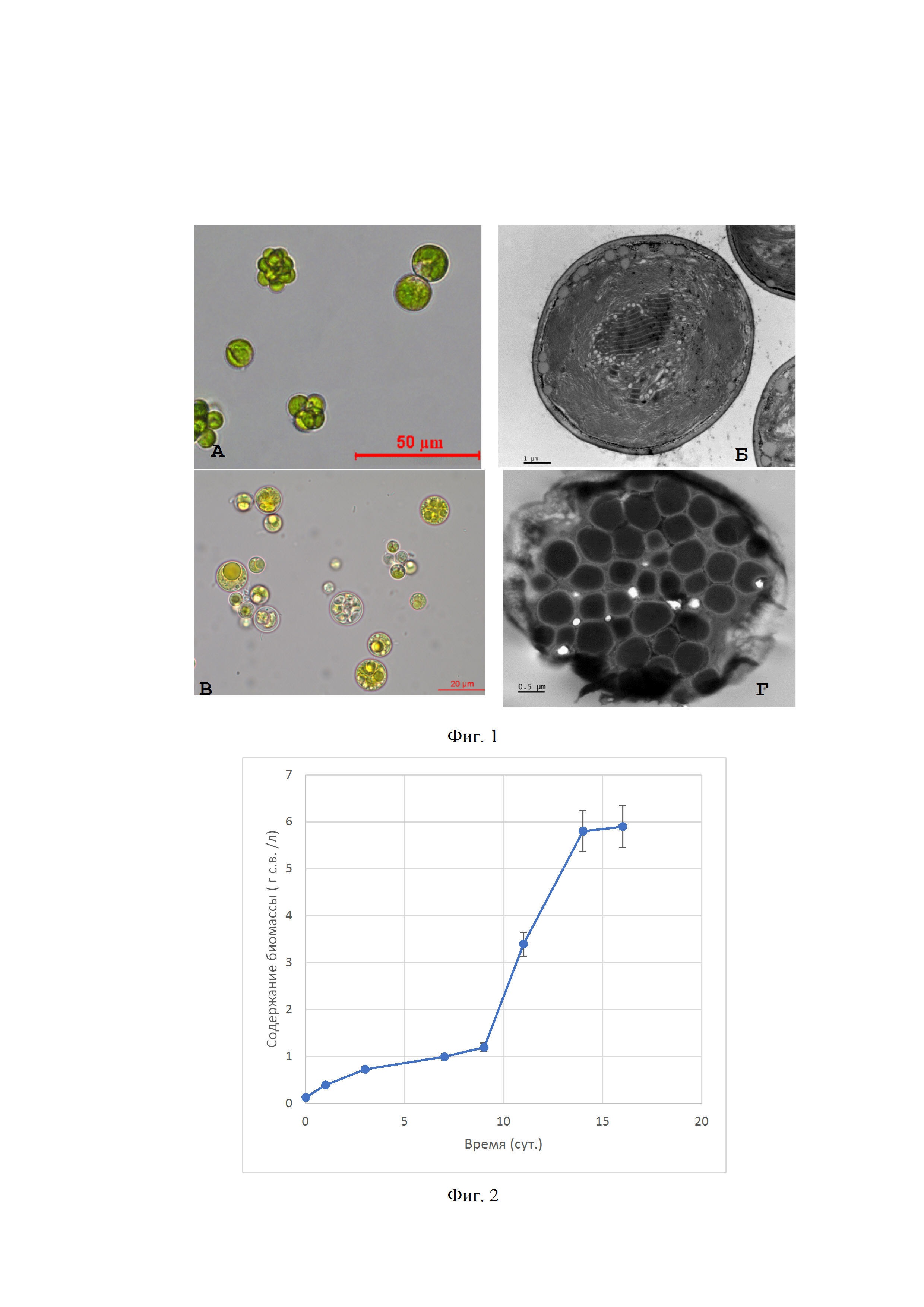 [13]Техническим результатом заявляемого изобретения является получение штамма микроводоросли с высоким уровнем накопления арахидоновой кислоты (не менее 31 масс.% от суммы жирных кислот липидов клеток) и сохранении высокой продуктивности культуры по арахидоновой кислоте (не менее 0,15 г/л культуры/сут. или 1,42 г сухой биомассы/л культуры/сут. (при расчете по логарифмической фазе роста; фиг. 1, 2), содержащей не менее 34% суммы жирных кислот от веса сухой биомассы за 7 суток культивирования и поглощение не менее 3,5 мг фосфора в сутки (фиг. 3) при культивировании на полной минеральной среде, обеспечивающей высокую скорость накопления биомассы.