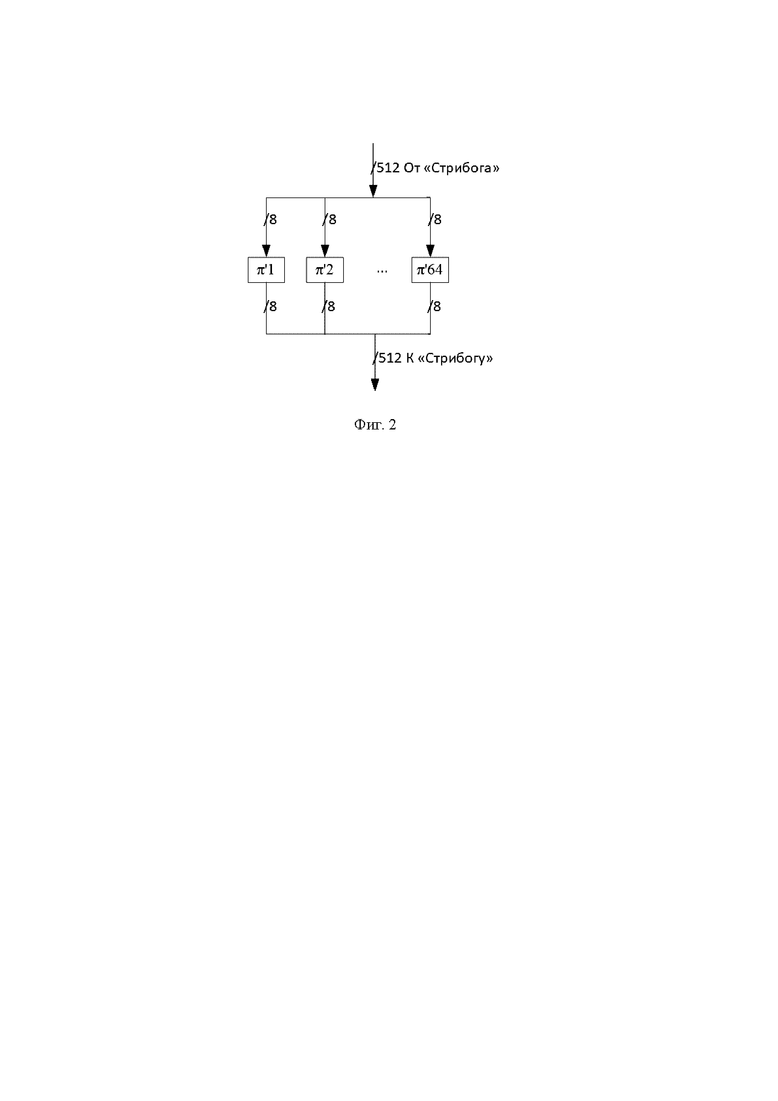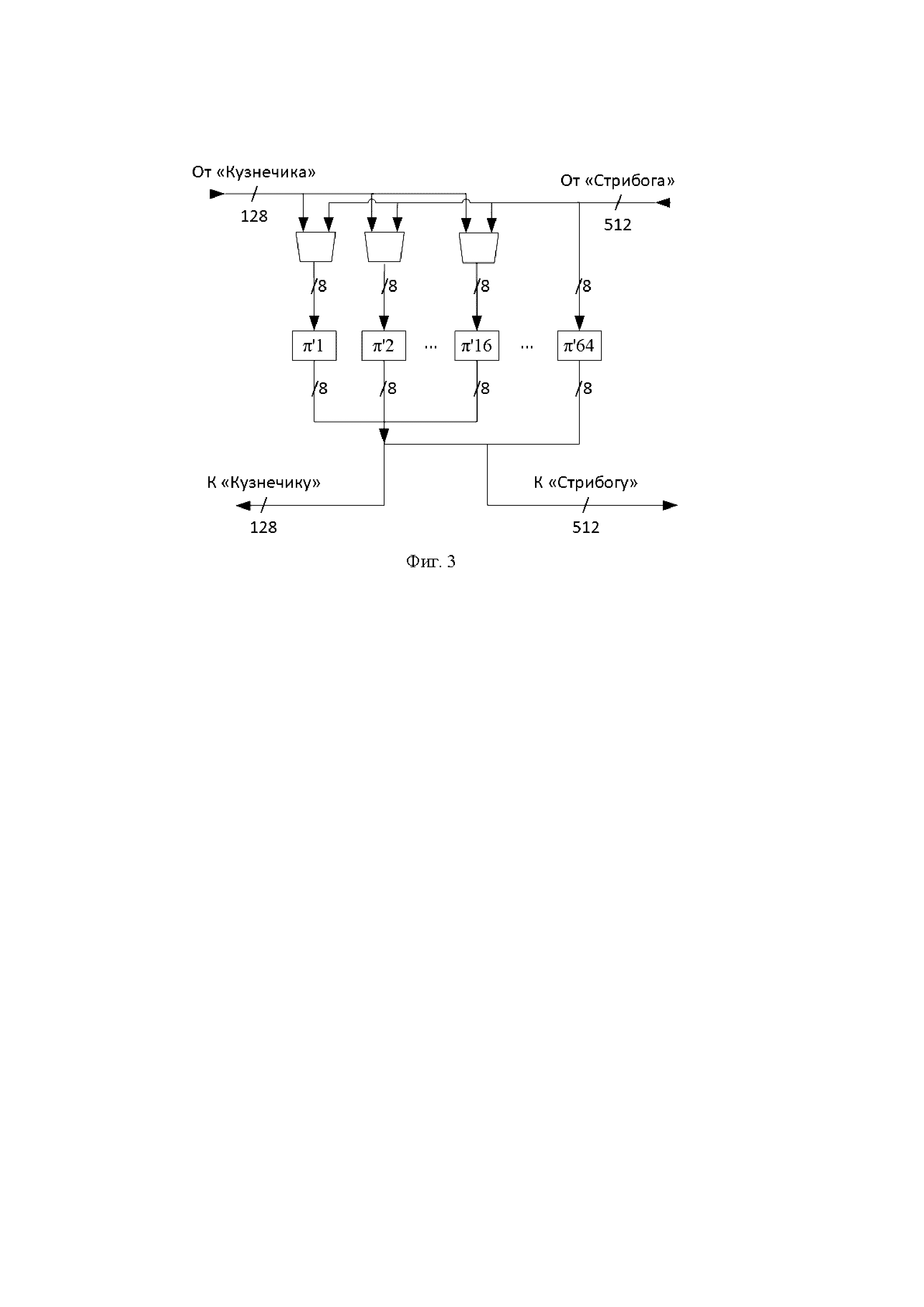 1. Устройство для реализации алгоритма шифрования «Кузнечик» стандарта ГОСТ Р 34.12-2015 и алгоритма хэш-функции «Стрибог» стандарта ГОСТ Р 34.11-2012, содержащее шестнадцать мультиплексоров и шестьдесят четыре блока замены байт, причем первый вход устройства выполнен с возможностью получения входных данных, в виде блоков размера 128 бит, алгоритма шифрования «Кузнечик» и соединен с первыми входами шестнадцати мультиплексоров, выходы которых соединены со входами шестнадцати блоков замены байт, а второй вход устройства выполнен с возможностью получения входных данных, в виде блоков размера 512 бит, алгоритма хэш-функции «Стрибог» и соединен с вторыми входами шестнадцати мультиплексоров, а также с входами сорока восьми блоков замены байт, при этом выходы всех блоков замены байт соединены с выходом устройства, выполненным с возможностью передачи выходных данных, в виде блоков размера 128 бит, алгоритма шифрования «Кузнечик» и выходных данных, в виде блоков размера 512 бит, алгоритма хэш-функции «Стрибог», причем мультиплексоры выполнены с возможностью определения активного алгоритма, при этом соединения первого входа устройства с входами шестнадцати блоков замены байт при осуществлении алгоритма шифрования «Кузнечик», и с возможностью соединения второго входа устройства с входами шестнадцати блоков замены байт при осуществлении алгоритма хэш-функции «Стрибог», а блоки замены байт выполнены с возможностью осуществления нелинейного биективного преобразования данных в соответствии с подстановкой π = Vec8π'Int8: V8 → V8, где π': 2. Устройство для реализации алгоритма шифрования «Кузнечик» стандарта ГОСТ Р 34.12-2015 и алгоритма хэш-функции «Стрибог» стандарта ГОСТ Р 34.11-2012, содержащее тридцать два мультиплексора и шестьдесят четыре блока замены байт, причем первый вход устройства выполнен с возможностью получения входных данных для шифрования, в виде блоков размера 128 бит, алгоритма шифрования «Кузнечик» и соединен с первыми входами шестнадцати мультиплексоров, выходы которых соединены со входами шестнадцати блоков замены байт, второй вход устройства выполнен с возможностью получения входных данных для имитовставки, в виде блоков размера 128 бит, алгоритма шифрования «Кузнечик» и соединен с первыми входами шестнадцати мультиплексоров, выходы которых соединены со входами шестнадцати блоков замены байт, а третий вход устройства выполнен с возможностью получения входных данных, в виде блоков размера 512 бит, алгоритма хэш-функции «Стрибог» и соединен с вторыми входами тридцати двух мультиплексоров, а также с входами тридцати двух блоков замены байт, при этом выходы первых шестнадцати блоков замены байт соединены с первым выходом устройства, а выходы вторых шестнадцати блоков замены байт соединены с вторым выходом устройства, при этом первый и второй выходы выполненным с возможностью передачи выходных данных, в виде блоков размера 128 бит, алгоритма шифрования «Кузнечик» и выходных данных, в виде блоков размера 512 бит, алгоритма хэш-функции «Стрибог», причем мультиплексоры выполнены с возможностью определения активного алгоритма, при этом соединения первого входа устройства с входами тридцати двух блоков замены байт при осуществлении алгоритма шифрования «Кузнечик», и с возможностью соединения второго входа устройства с входами тр