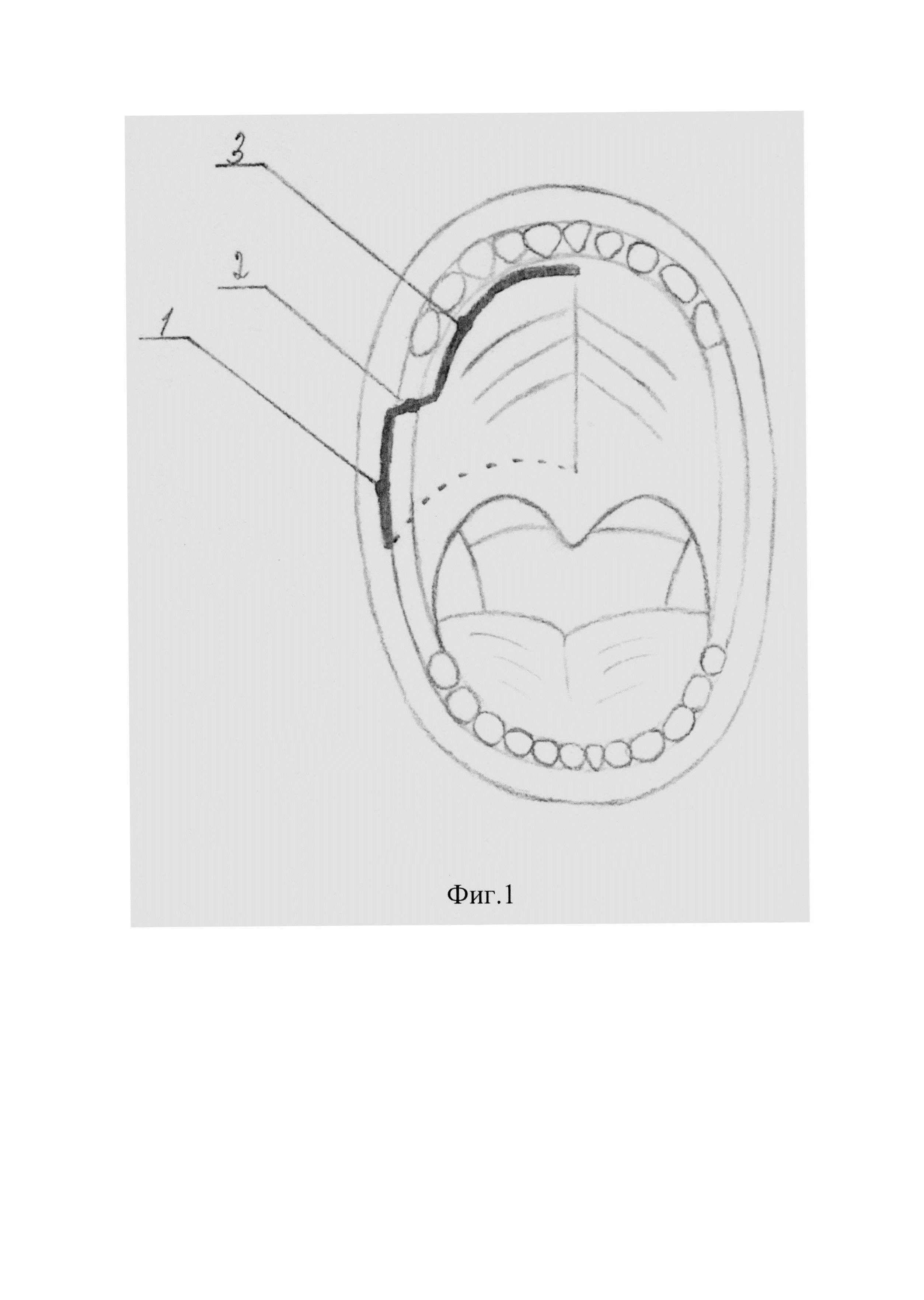 На фиг. 1 - показана схема разреза слизисто - надкостничного небного лоскута.