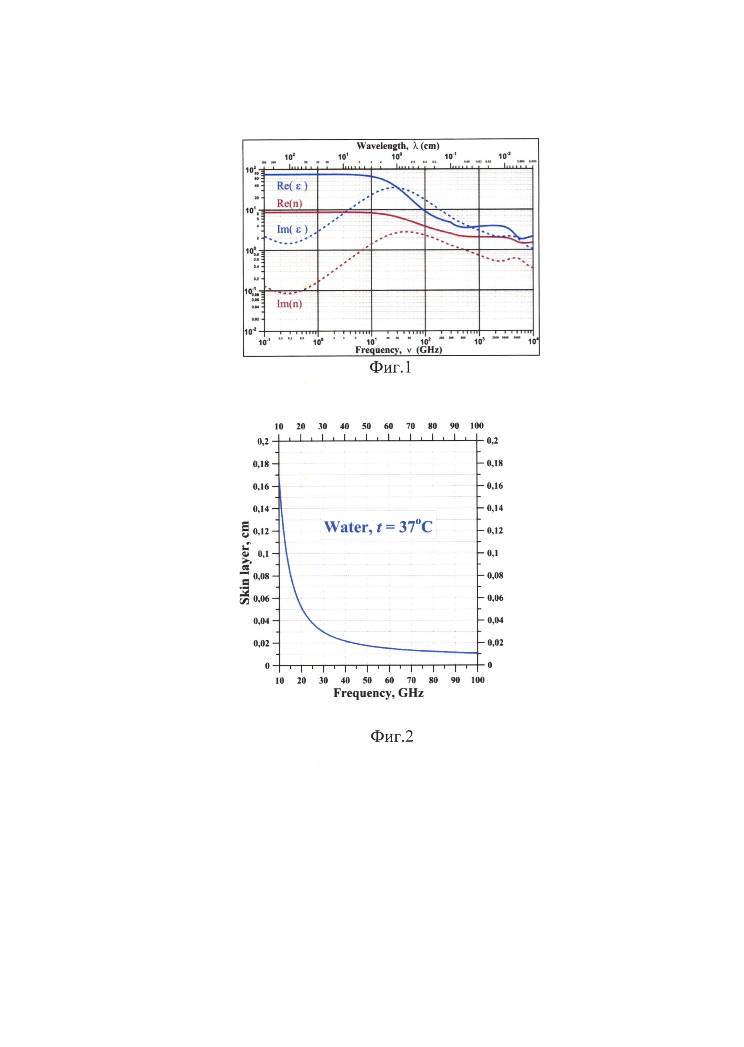Изобретение относится к медицине, а именно к офтальмологии, к способам оценки процентного содержания воды в роговице с помощью терагерцового излучения в диапазоне частот 70-120 ГТц. Способ может быть использован в диагностике заболеваний глаз, связанных с нарушением водного баланса (степени гидратации) роговицы. Адекватный контроль гидратации корнеосклеральной оболочки глаза очень важен для ранней диагностики и мониторинга прогрессирования различных офтальмологических патологий (дистрофии роговицы, кератоконуса, прогрессирующей близорукости, первичной открытоугольной глаукомы), выявления показаний и противопоказаний к кераторефракционной хирургии, выбора эффективных и безопасных методов местного медикаментозного лечения, включая слезозаместительную и гипотензивную терапию, и разработке алгоритма коррекции зрения с помощью контактных линз. В настоящее время отек роговицы или ее дистрофия, предположительно, связанная со снижением гидратации, может быть диагностирована только косвенно - путем измерения толщины роговицы (топографическая пахиметрия), определения формы ее внешней поверхности (компьютерная видео-кератография и картирование роговицы (авторское свидетельство на изобретения, RU 1143418, 22.10.1982), путем измерения биомеханических параметров роговицы, с использованием анализатора OR А (Ocular Response Analyzer; ORA Reichert, США). Отек роговицы косвенным путем можно определить и по степени прозрачности роговицы с помощью оптического Шеймпфлюг сканирования роговицы инфракрасным излучением с оценкой денситометрического эпителиального пика и оптической плотности в слоях стромы роговицы (патент RU 2604711, 10.12.16 г.). Однако изменения толщины, формы и прозрачности роговицы могут быть связаны не только с нарушением ее гидратации, но и с другими факторами, поэтому существующие косвенные методы оценки процентного содержания воды в ткани роговицы недостаточно информативны. В настоящее время в арсенале клинического офтальмолога не существует прямого бесконтактного метода определения гидратации роговицы. Использование электромагнитного излучения терагерцового (ТГц) диапазона частот для этой цели представляется весьма перспективным, поскольку в диапазоне частот 10-300 ГГц мнимая часть комплексного показателя преломления воды принимает максимальные значения (Фиг. 1 - Частотные зависимости действительной и мнимой части комплексной диэлектрической проницаемости и комплексного показателя преломления воды в диапазоне 0.1 МГц - 10 ТГц, при температуре 37°С, рассчитанные по аппроксимационной модели (Ray P. S. Broadband complex refractive indices of ice and water. // Applied Optics. 1972. V. 11. №. 8. P. 1836-1844). Поэтому в данном диапазоне отражательная способность воды будет достаточно высокой, а поглощение в слое воды будет очень большим. Следовательно, даже небольшое изменение количества воды в роговице будет оказывать существенное влияние на отражательные и пропускательные характеристики роговицы глаза в терагерцовом диапазоне. В настоящее время только несколько исследовательских групп в мире занимаются разработкой системы для сканирования гидратации биологических тканей в терагерцовом диапазоне частот. Для этой цели в основном используются импульсные ТГц источники. Известны способы ТГц-визуализации при диагностике рака кожи, меланомы и анализе ожогов кожи на основе из
