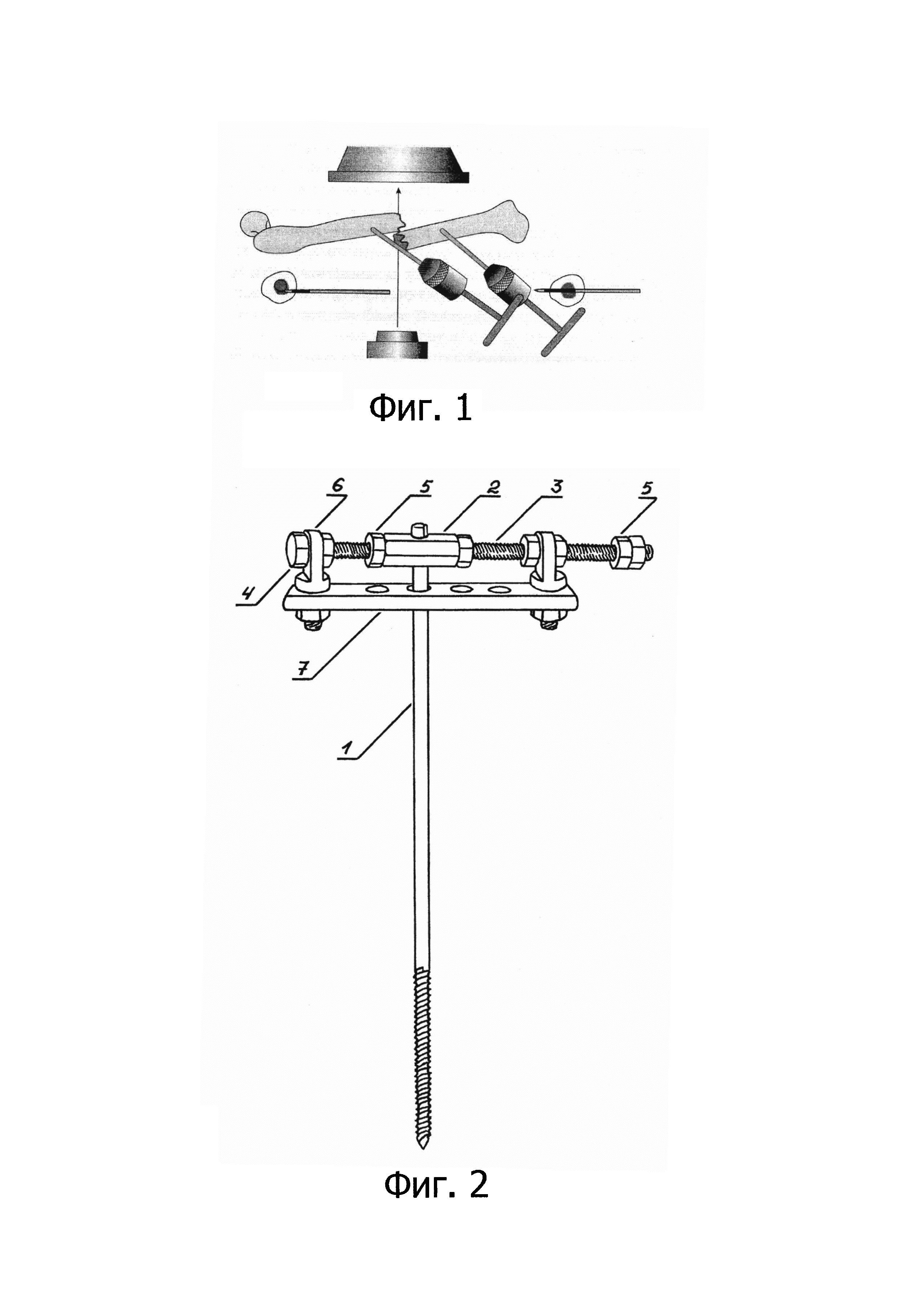 Устройство относится к медицинской технике, а именно к инструментам, применяемым в оперативной ортопедии и травматологии. Актуальность. При лечении переломов и ложных суставов костей выполняют остео-синтез - операцию для достижения репозиции и фиксации костных отломков. При этом в роли провизорной костной мозоли выступают соответствующие металлоконструкции, выполняющие функцию периостальной и эндостальной костной мозоли. Отсутствие или утрата стабильности остеосинтеза - следствие как несовершенства металлоконструкций и техники операции, так и отсутствия адекватных условий нормального течения репаративного остео-генеза. Поэтому при остеосинтезе должно быть соблюдено равновесие между механическими и биологическими условиями заживления перелома, что напрямую зависит от инструментария, качества применяемых металлоконструкций и атравматичности хирургической техники вмешательства. Аналоги В современной оперативной травматологии и ортопедии применяют широкий ассортимент имплантатов для атравматичного малоинвазивного остеосинтеза и необходимых для их применения инструментов. В качестве внутрикостных имплантатов для фиксации переломов применяют винты, пластины, спицы, стержни, гвозди, аппараты внешней фиксации (АВФ) и проволочный серкляж. Для репозиции костных отломков во время операции используют АВФ, дистракторы, репозиционные щипцы, джойстики - винты Шанца со специальными съемными ручками. Критика аналогов Общим недостатком всех приведенных аналогов является узкая направленность и специфичность каждого из них с необходимостью в наличии широкого инвентаря вспомогательного инструментария. Прототип В качестве устройства-прототипа нами выбрана ручка управления или джойстик для репозиции костных отломков (Анкин Л.Н., Анкин Н.Л. Практическая травматология. Европейские стандарты диагностики и лечения - М.: Книга-плюс, 2002. - 480 с; - С. 58 - 74; - устройство-прототип), применяемая при закрытом интрамедуллярном остеосинтезе длинных трубчатых костей, например, бедренной кости. Сущность и применение данного устройства-прототипа заключаются в следующем. Пациент лежит на операционном столе на здоровом боку с согнутой в коленном суставе под углом 100 градусов поврежденной конечностью. Репозицию костных отломков выполняют с помощью приспособлений ортопедического стола, дистрактора, АВФ или стержней Шанца, которые вводят в костные отломки и используют как ручки управления - джойстики (фиг. 1). При репозиции костных отломков стержни Шанца следует размещать как можно ближе к перелому: в проксимальный фрагмент стержень Шанца вводят монокортикально, а в дистальный - бикортикально. Затем, с помощью двух Т-образных рукояток костные фрагменты репонируют под контролем ЭОПа (электронно-оптического преобразователя). После репозиции выполняют закрытый интрамедуллярный остеосинтез стержнями с блокированием, а стержни Шанца с джойстиками извлекают. Критика прототипа Используемые в качестве джойстиков Т-образные рукоятки для стержней Шанца имеют следующие недостатки: - проблематичность поиска и сложность изготовления данного устройства, не входящего в реестр традиционно применяемого инструментария в оперативной ортопедии и травматологии; - массивность джойстика с относительно небольшой Т-образной рукояткой для стержня Ш
