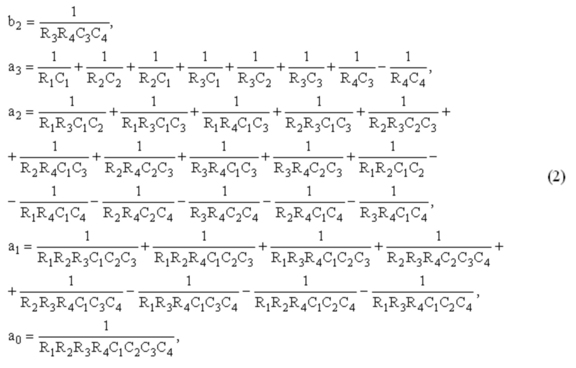 передаточной функции (1). В свою очередь эти коэффициенты определяются топологией схемы и параметрами пассивных элементов - сопротивлений резисторов и емкостей конденсаторов. Так, для схемы, приведенной на фиг. 2, коэффициенты передаточной функции определяются соотношениями