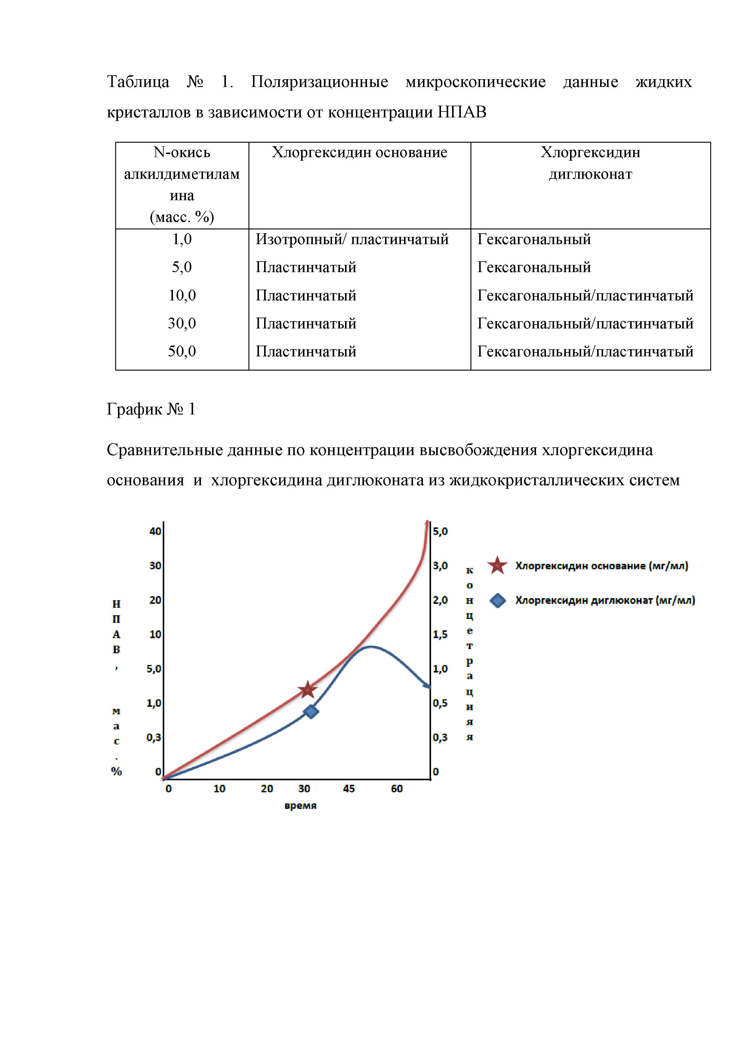 Настоящая группа изобретений относится к новому лиотропному жидкому кристаллу хлоргексидина основания, образующемуся в водной жидкокристаллической системе неионогенного поверхностно-активного вещества или смеси неионогенного и катионного поверхностно-активных веществ, в присутствии стабилизатора и регулятора кислотности, при последовательном смешении компонентов в порядке - деионизированная вода, неионогенное поверхностно-активное вещество или смеси неионогенного и катионного поверхностно-активных веществ, стабилизатор, регулятор кислотности и хлоргексидин основание, характеризующиеся пластинчатой структурой и характеристической вязкостью (η) от 5,099 до 10,197 Па⋅с, способу его получения и применению лиотропного жидкого кристалла хлоргексидина основания по в качестве действующего вещества для получения дезинфицирующих или антисептических средств. Уровень техники. Хлоргексидин основание (N,N''-бис(4-хлорфенил)-3,12-диимино-2,4,11,13-тетраазатетрадекандиимидамид), относящийся к классу бигуанидов, является сильным основанием. Обладает крайне плохой растворимостью в воде. При этом, обладает высокими биоцидными свойствами, намного превышающими, такие свойства у водорастворимых солей хлогексидина основания, например, такие как диглюконата, диацетата хлоргексидина. Наиболее широкое применение медицинской практике имеет хлоргексидин диглюконат, являющийся солью хлоргексидина и глюконовой кислоты, который нельзя выделить в чистом твердом виде, в связи с чем на рынке он представлен в виде 20% водного раствора. Использование хлоргексидина в виде солей приводит к снижению биоцидной активности исходного основания. Данное обстоятельство требует осуществлять поиск новых физиологически приемлемых форм, в том числе нано-форм для доставки и/или биодоступности активных веществ через клеточные липофильные мембраны, которые, при этом, сохраняли бы высокую биоцидную активность, присущую хлоргексидин основанию. С целью сохранения исходных биоцидных свойств хлоргексидина основания были предприняты попытки получить его активные водорастворимые формы, которые описаны в патентах: В патенте US 5008038 (GAF Chemicals Corporation, Wayne, N.J., приоритет 10.10.1989, США) была показана попытка получить водорастворимый комплекс хлоргексидина основания путем растворения свободного основания хлоргексидина в лактаме и последующего смешивания полученного раствора с водой; В патенте IL133395 (DEGUSSA AG, приоритет от 09.12.1999, Израиль) описаны составы хлоргексидина в виде порошкообразной водорастворимой смеси, состоящей из хлоргексидина основания, одной или нескольких сахарных кислот или лактонов из набора глюконовая кислота или глюконолактон, лактобионовая кислота; В патенте WO 2002051464 (The Trustees of Columbia University, New York, приоритет от 22.12.2000, США), указан состав, где для усиления биоцидного действия описана комбинация свободного хлоргексидина основания и водорастворимой соли хлоргексидина, в одном из воплощений диацетат хлоргексидина, в весовом соотношении примерно от 1:1 до 1:5 в присутствии различных растворителей. В отрытой печати описаны пути получения водорастворимых солюбилизатов хлоргексидина основания. В докладе «Ассоциаты на основе хлоргексидина и синергетический эффект», Кардаш Г.Г и др. // Материалы VIII Всероссийского съезда эпидемиологов, микробиологов и паразитоло