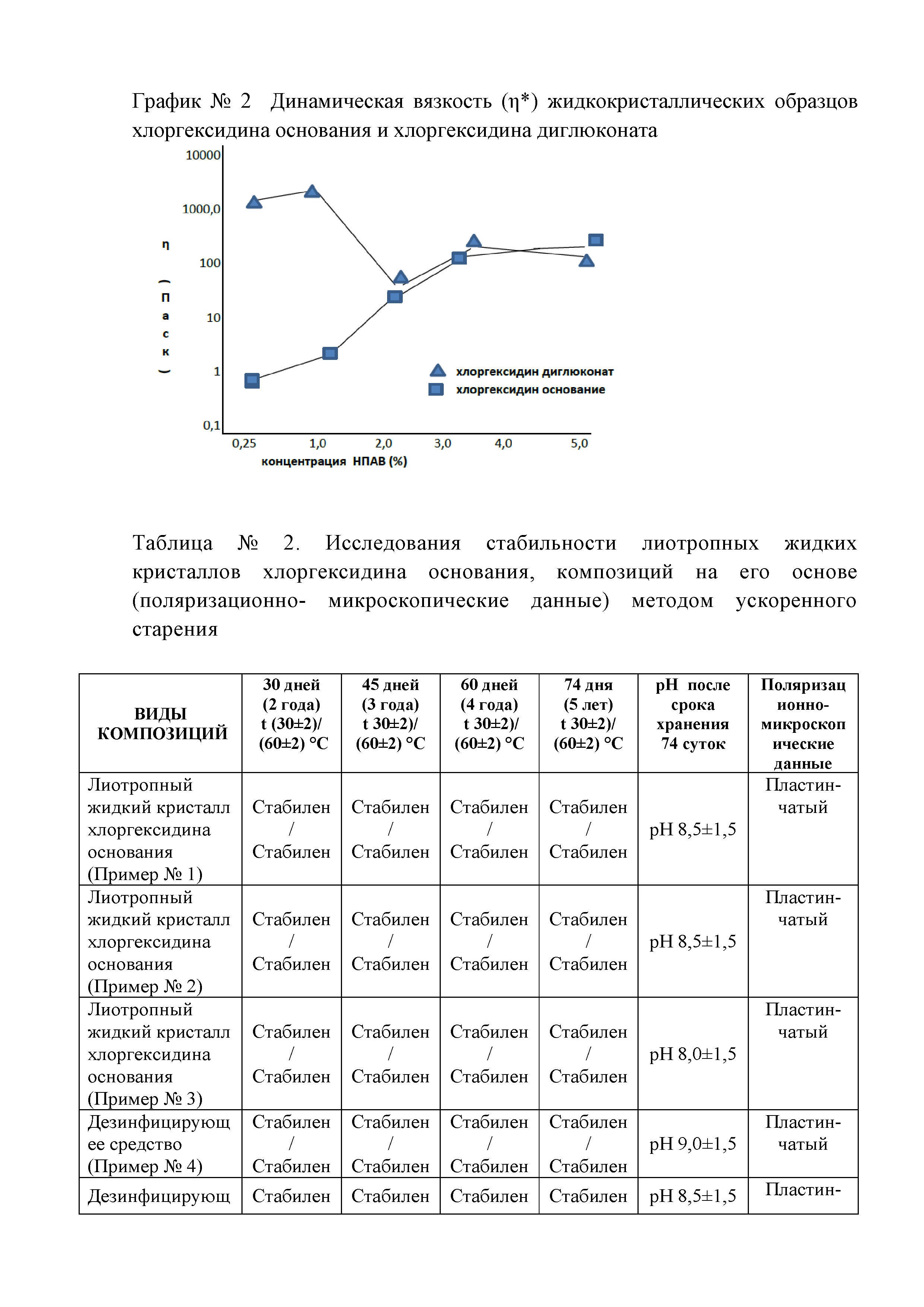 (Трилон ВД), 0,375 г хлоргексидина основания, 4,0 г изопропилового спирта. Перемешивание продолжают еще 15 мин до полного его растворения, добавляют 0,005 г триарилметановый краситель (Е133), 0,02 г загустителя (Натросол 250 HR), 0,02 г ароматизатор. Приготовление композиции проводят при комнатной температуре. Расчетная характеристическая вязкость лиотропного жидкого кристалла как действующего вещества 7,850 Па⋅с. Полученная композиция имеет рН - 5,94-6,0.
