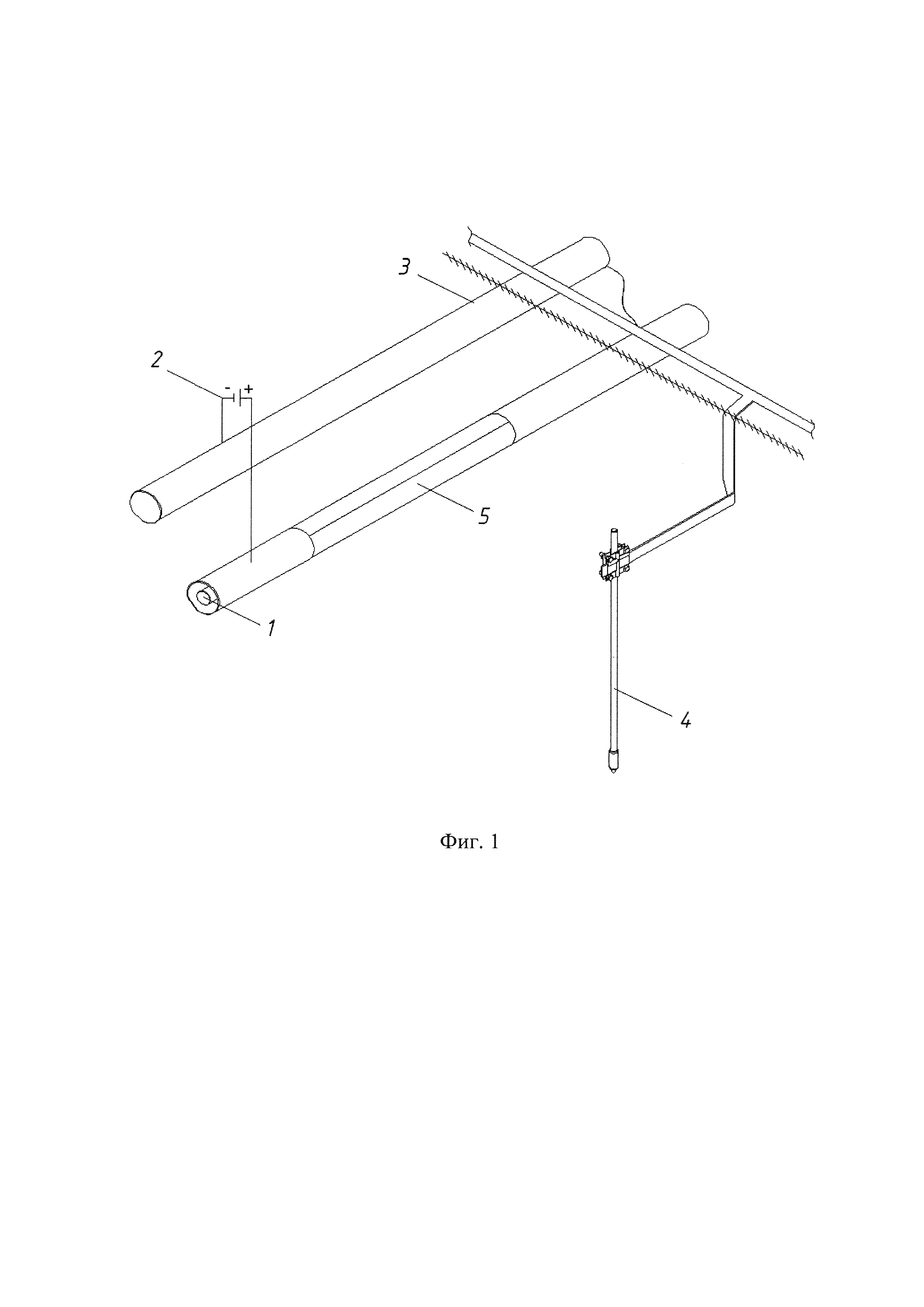 На фиг. 1 представлена схема установки протяженного анодного заземления 1, входящего в состав станции катодной защиты 2, подключенной к участку подземного трубопровода 3, электрически соединенного с вертикальным стержневым заземляющим электродом 4. В зоне сближения протяженного анодного заземления 1 с вертикальным заземляющим электродом 4 располагается вставка 5 в виде двух полуобечаек, соединенных между собой посредством сварки: одна полуобечайка выполнена из токопроводящего материала с удельным электрическим сопротивлением ρ1, Ом⋅м, вторая полуобечайка выполнена из токопроводящего материала с удельным электрическим сопротивлением ρ2, Ом⋅м, причем ρ21.
