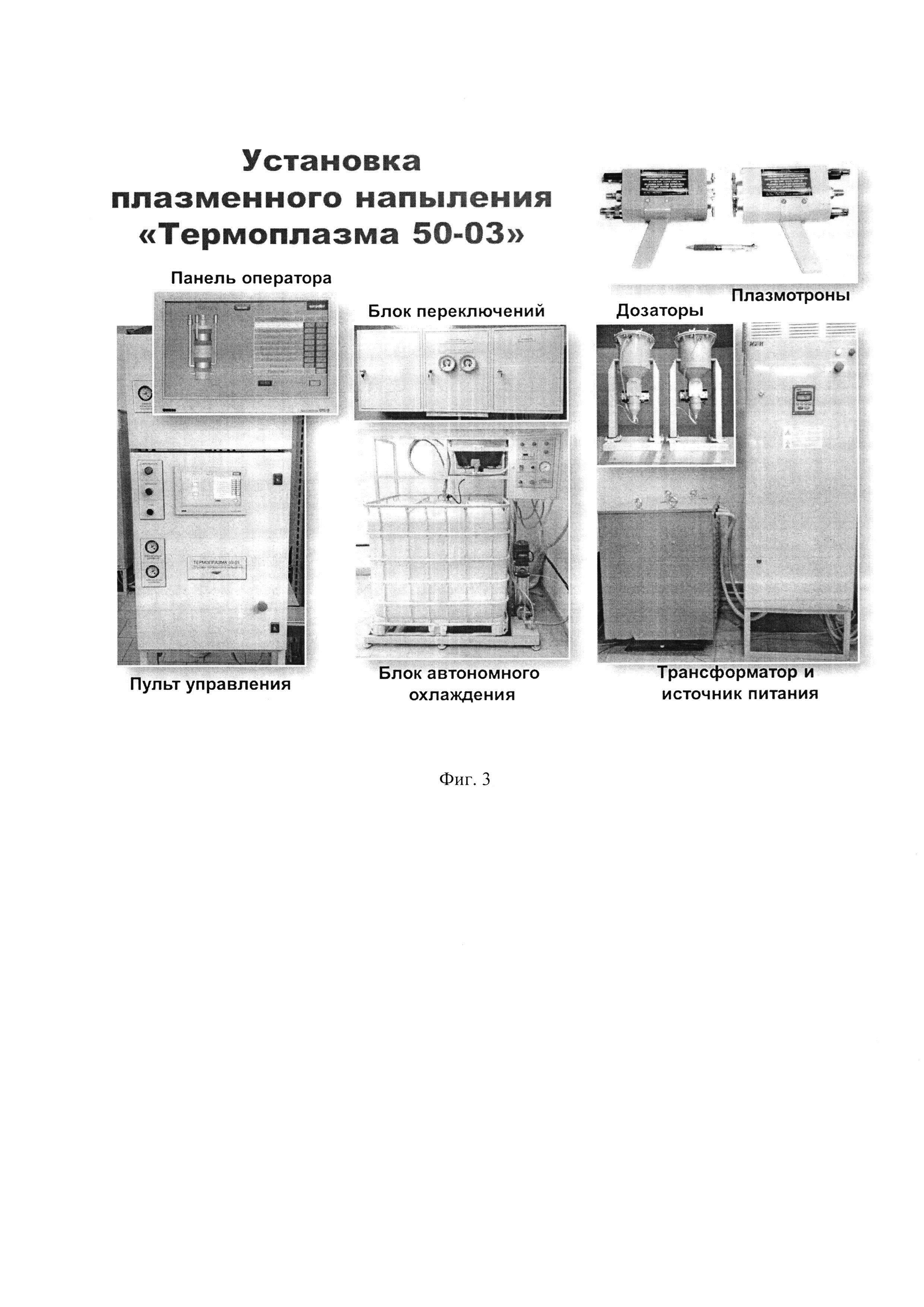1. Установка плазменного напыления покрытий, содержащая плазмотрон, устройство подачи напыляемого материала - дозатор в генерируемый плазмотроном поток термической плазмы, источник постоянного тока для электропитания дугового разряда плазмотрона, систему охлаждения плазменной установки - блок автономного охлаждения, пульт управления плазменной установкой, соединенный с плазмотроном, с устройством подачи напыляемого материала - дозатором, с источником постоянного тока электропитания дугового разряда плазмотрона, с блоком запуска плазмотрона, с системой охлаждения плазменной установки - блоком автономного охлаждения, при этом плазмотрон содержит устройство ввода порошковых материалов в поток термической плазмы, два электрода - катод и анод, сопло и межэлектродную вставку в виде секционированного канала, секции которого электрически изолированы друг от друга и от электродов, отличающаяся тем, что установка состоит из двух плазмотронов, каждый из которых снабжен узлом кольцевого ввода порошковых материалов с газодинамической фокусировкой, при этом один плазмотрон выполнен с возможностью работы в высокоскоростном дозвуковом или сверхзвуковом турбулентном режиме истечения плазменной струи для нанесения покрытий из металлических материалов, а другой - в низкоскоростном дозвуковом ламинарном режиме истечения плазменной струи для нанесения покрытий из керамических материалов, причем газоразрядная камера каждого плазмотрона, выполненная в виде секционированного канала, расширяющегося от катода к аноду, имеет количество секций в зависимости от требуемого режима истечения плазменной струи, и содержит пульт управления плазменной установкой через блок переключений плазмотронов для переключения плазмотронов и порошковых дозаторов. 2. Установка плазменного напыления покрытий по п. 1, отличающаяся тем, что секционированный канал газоразрядной камеры плазмотрона с турбулентным режимом работы выполнен длиной пять калибров при среднем диаметре канала 9 мм. 3. Установка плазменного напыления покрытий по п. 1, отличающаяся тем, что секционированный канал газоразрядной камеры плазмотрона с ламинарным режимом работы выполнен длиной восемь калибров при среднем диаметре канала 8 мм.