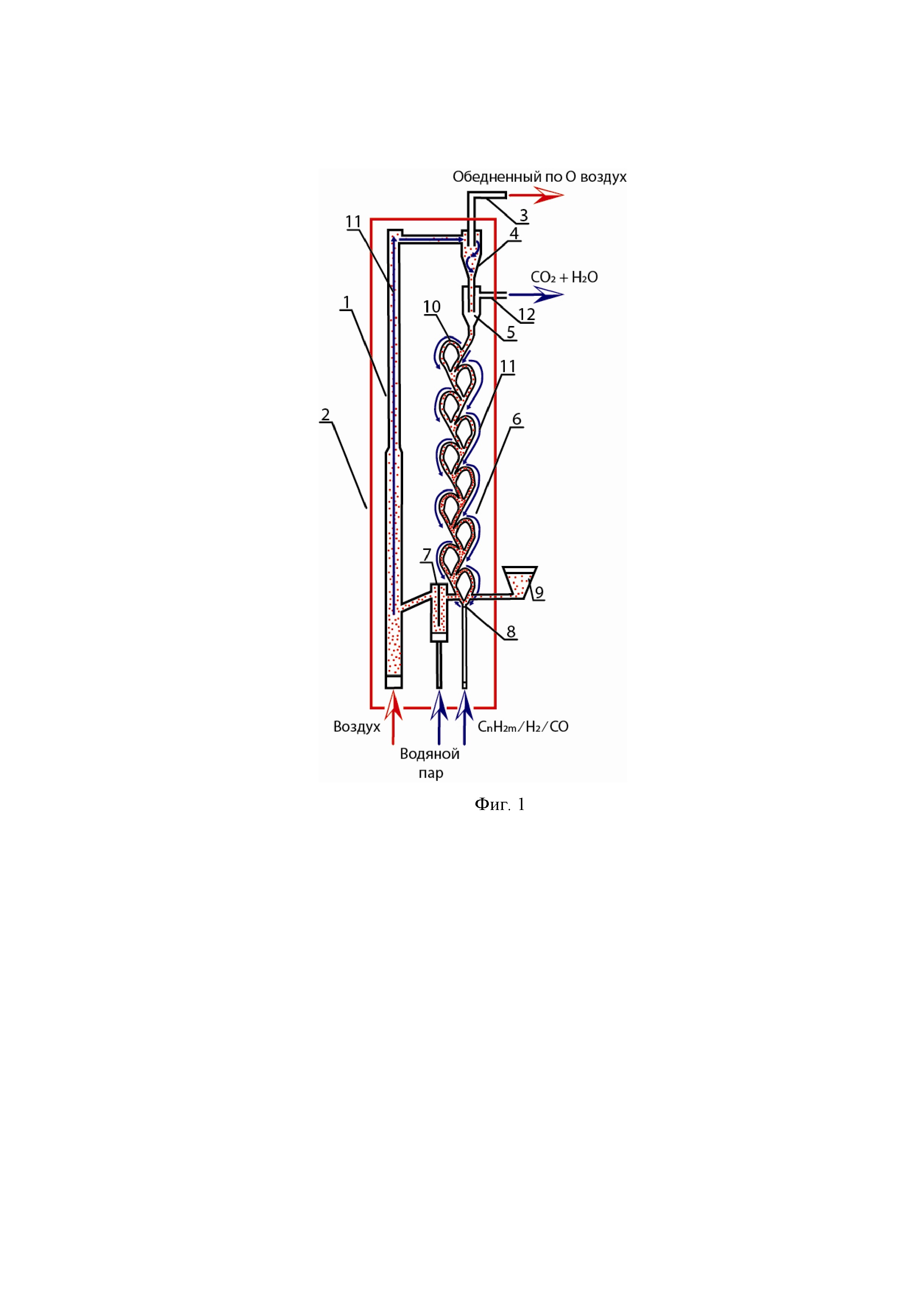 Реактор с псевдоожиженным слоем для сжигания топлива в химической петле, содержащий воздушный реактор (1) в виде цилиндрической колонки с входным отверстием для подачи воздуха, расположенным в днище, соединенной с трубопроводом (12), который, в свою очередь, связан с циклоном (4) для сепарации частиц от обедненного по кислороду воздуха, который выводится через газопровод (3), при этом воздушный реактор (1) посредством патрубка соединен с устройством химической петли (7), снабженным входным отверстием для подачи пара, и топливный реактор (6), имеющий входное отверстие для подачи топлива, расположенное в днище, и связанный посредством патрубков с устройством подачи кислородного аккумулятора (9) и устройством химической петли (7), причем воздушный реактор (1) и топливный реактор (6) помещены в печь (2), отличающийся тем, что топливный реактор представляет собой трубу из кварца, снабженную ответвлениями в форме петлеобразных патрубков (11), расположенных в шахматном порядке по всей длине трубы в количестве не менее 10, при этом угол между внешней стенкой патрубка и внешней стенкой прямолинейного участка трубы равен 15-46°, а отношение длины l трубы к внешнему диаметру d петлеобразного патрубка (11) составляет l/d =85…380, причем в верхней части топливного реактора (6) расположен циклон (5) для сепарации частиц кислородного аккумулятора от продуктов сгорания, сбрасываемых через газопровод (3), и соединенный посредством патрубка с циклоном (4) для сепарации частиц от обедненного по кислороду воздуха, а патрубок, соединяющий топливный реактор (6) и устройство химической петли (7), снабжен кварцевым фильтром (8).