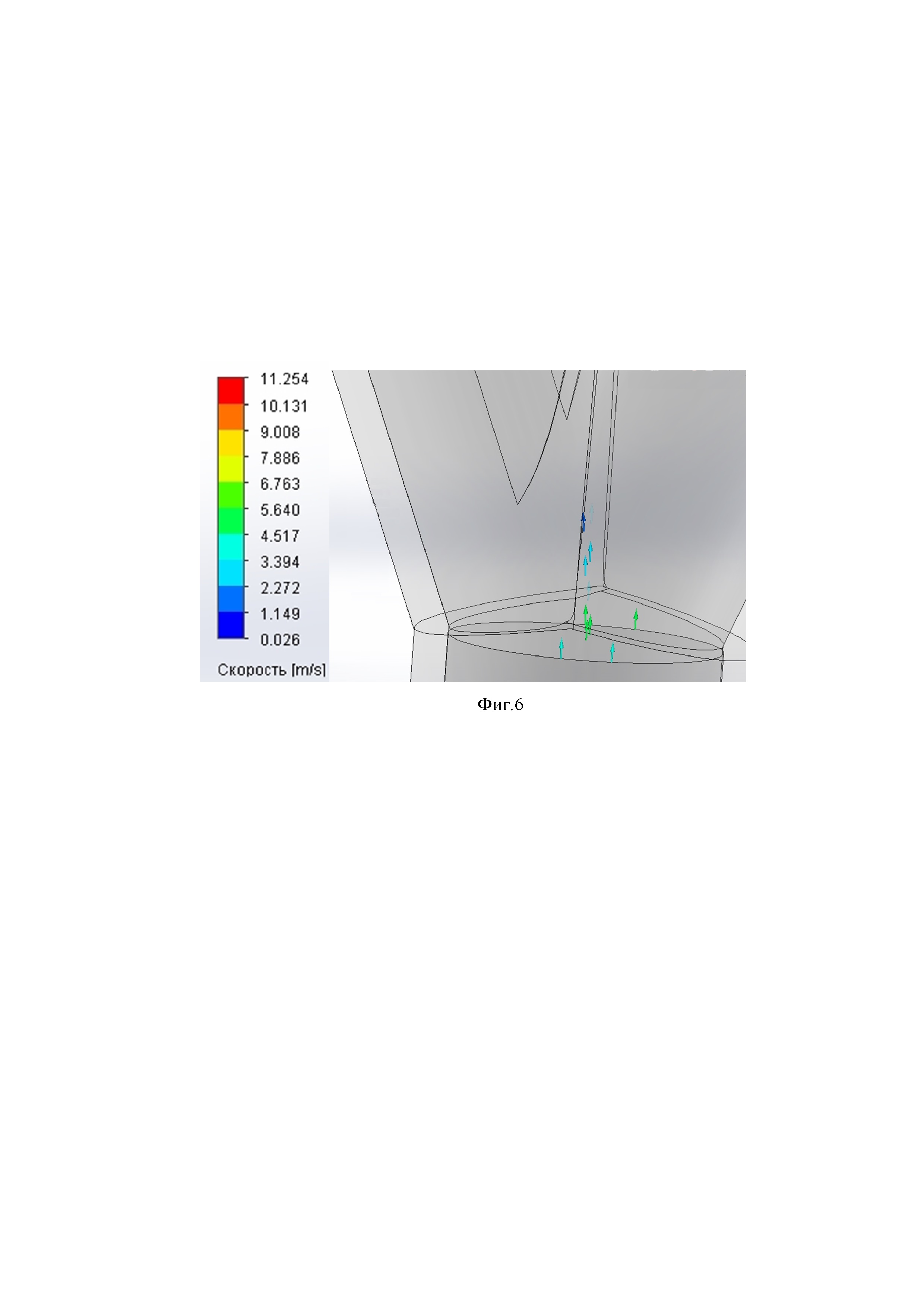 На фиг. 5 изображены результаты моделирования распределения скорости газообразного метана в первом петлеобразном патрубке топливного реактора.