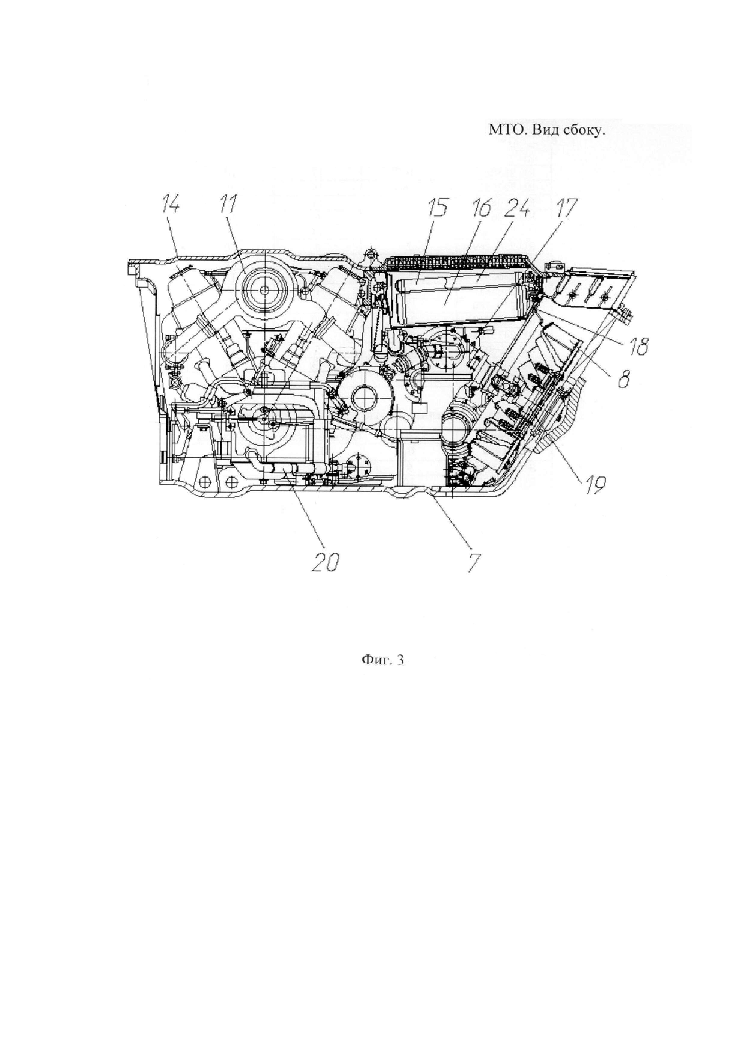 Изобретение относится к транспортным средствам, в частности, гусеничной машине типа танк, включающей в себя шасси и оснащенной моторно-трансмиссионной установкой, и может быть использовано для модернизации танков, в том числе устаревших образцов семейства Т-72, с целью повышения характеристик подвижности. Сущность способа модернизации моторно-трансмиссионной установки (МТУ) гусеничной машины заключается в комплексном изменении с доработкой корпуса в районе моторно-трансмиссионного отделения (МТО), с сохранением габаритных размеров, и замене основных компонентов МТУ: двигателя на таковой с более высокими удельными показателями мощности и расхода топлива, входного редуктора трансмиссии на редуктор, обеспечивающий повышение оборотов вентилятора, расширительного бачка системы охлаждения с паровоздушным клапаном (ПВК) на бачок с ПВК, имеющий более высокий порог срабатывания парового клапана для поддержания более высокой температуры теплоносителя, установка воздухоочистителя, адаптированного для обеспечения очистки и подачи большего количества воздуха в двигатель, установка системы удаления пыли, включающей трассу отсоса пыли, оснащение выпускного тракта отработавших газов выпускным патрубком оригинальной конструкции, замена бортовых коробок передач на коробки с повышенной несущей способностью, установка радиаторов с более высокими теплотехническими показателями. Технический результат применения способа модернизации силовой установки заключается в повышении тактико-технических характеристик (маневренности и подвижности) танка за счет повышения удельных габаритных показателей моторно-трансмиссионной установки при сохранении запаса хода, обеспечении надежной эксплуатации гусеничной машины с минимальными затратами на обслуживание в условиях высоких температур окружающего воздуха и запыленности, характерных, в частности, для пустынной и степной местности. Патентный поиск по теме модернизации оборудования, узлов и агрегатов, в целом транспортного средства выявил технические решения, защищенные патентами РФ и описывающие получение технического результата заменой отдельных элементов оборудования. Известно техническое решение, защищенное патентом [1, 2204033], техническим результатом которого является повышение удельных габаритных показателей силовой установки за счет снабжения существующего двигателя внутреннего сгорания турбокомпрессором. При этом получены положительные результаты от упомянутой модернизации, мотивированно потребовавшие внесения изменений в обеспечивающие двигатель системы. Так, защищена патентом [2, 2223412] система питания воздухом. Изменена конструкция рабочего колеса [3, 2184877] центробежного вентилятора с повышенным КПД, обеспечивающего, увеличение расхода воздуха через радиаторы. Для дополнительного увеличения расхода воздуха предназначено изобретение [4, 2187024]. С увеличением мощности двигателя мотивировано совершенствование трансмиссии транспортного средства, в частности, коробки передач [5, 2177416] и выхлопного устройства ДВС [6, 2180044], изменения системы дымопуска [7, 2199077]. Представленные технические решения имеют узкое специальное назначение и поэтому имеют ограниченное применение. Так, [1, 2204033] «Силовая установка» защищает только, собственно, модернизированный двигатель 