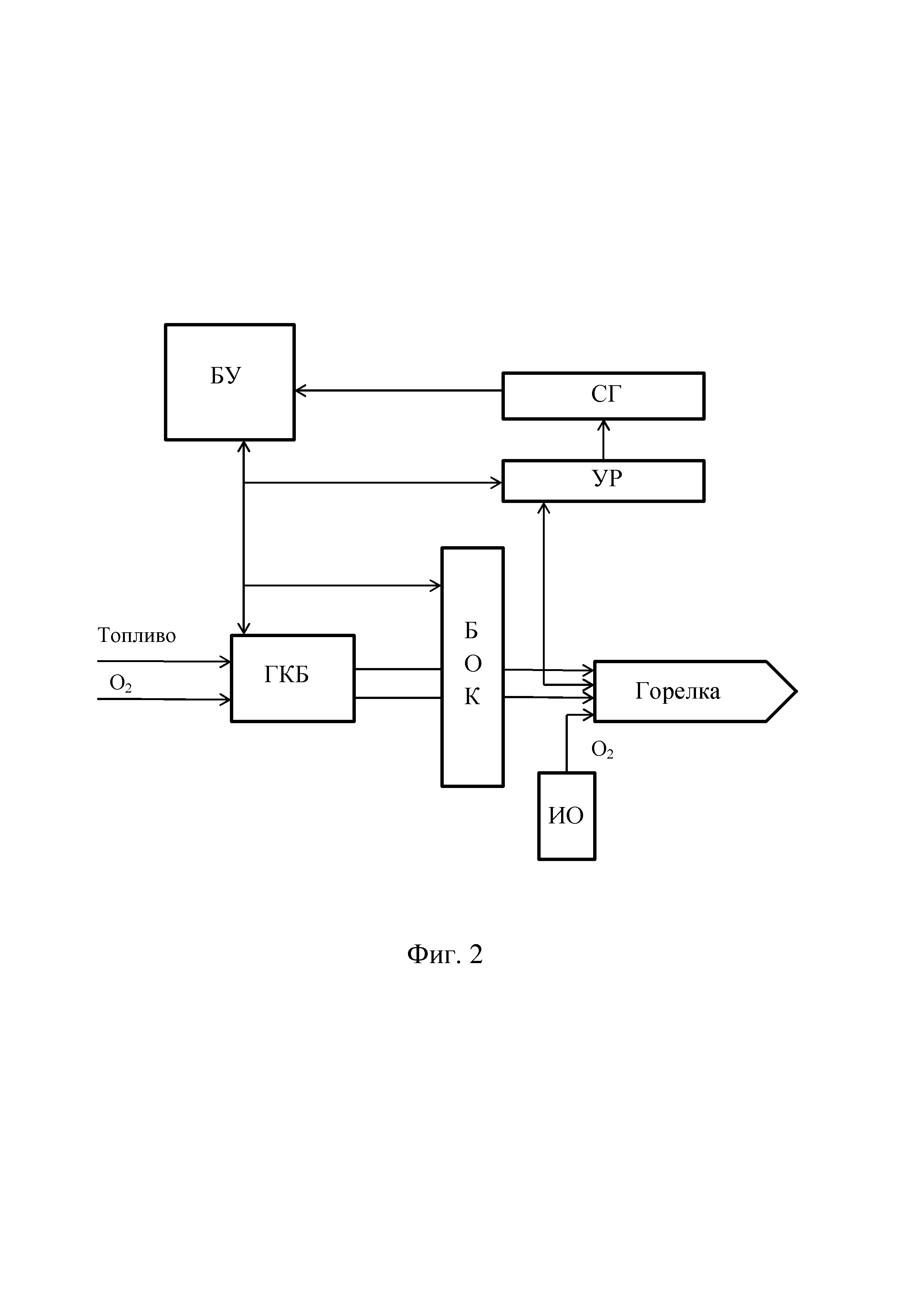 Область техники, к которой относится изобретение Изобретение относится к топливно-кислородной горелке для плавильной печи, в частности к топливно-кислородной горелке шахтной печи для производства минеральной ваты. Изобретение также относится к системе и способу управления розжигом и контролем пламени такой горелки. Уровень техники Производство минеральной ваты включает в себя получение расплава сырьевого материала (например, базальта или доломита) с последующим превращением его в волокна, из которых затем формируют минераловатное полотно. Расплав получают путем плавления сырья в специальных шахтных печах (вагранках). В качестве топлива шахтных печей используют кокс, который смешивают с шихтой и загружают в печь. Окислителем, необходимым для процесса горения, является кислород, находящийся в воздухе и подаваемый через фурмы, размещенные на боковых стенках печи. Стоимость кокса относительно велика. Кроме того, российский кокс не всегда имеет требуемое качество, что вынуждает производителей минеральной ваты закупать кокс за рубежом. Учитывая тот факт, что существенная часть кокса в настоящее время поставляется из-за рубежа, затраты на этот вид топлива составляют значительную часть затрат на производство минеральной ваты. Одним из известных способов снижения затрат на производство минеральной ваты с использованием вагранок является повышение содержания кислорода в потоке подаваемого в печь воздуха - технология кислородного обогащения. Указанная технология предусматривает подачу кислорода либо в общий поток воздуха, подаваемый в печь, либо непосредственно в каждую фурму и позволяет, в частности, повысить скорость плавления сырья, уменьшить расход кокса и объем отходящих газов. Технология кислородного обогащения описана, например, в документе /1/ «Oxygen-enhanced combustion»/Edited by Charles E.Baukal, Jr., CRC Press, 1998 (Усиленное кислородом сжигание/под. ред. Чарльза Е. Бокала, мл.). Вместе с тем, при использовании такой технологии основным топливом, применяемым в ходе производства минеральной ваты, остается дорогостоящий кокс. Другое решение, применяемое для экономии кокса, состоит в его частичной замене на более дешевое топливо, например, природный газ. Так, в вагранках на горячем дутье при производстве чугуна успешно применяют технологию, согласно которой непосредственно в фурму или выше фурмы устанавливают газокислородную горелку «природный газ-кислород» для замещения части энергии, получаемой от сгорания кокса, на энергию от сгорания смеси природного газа с кислородом. В общем случае такой подход обеспечивает уменьшение расхода кокса до 10%, увеличивает скорость плавления и процент водорода в отходящих газах. В то же время, в случае установки горелки выше фурмы возникает необходимость сложной модернизации конструкции печи. Конструкция газокислородной горелки, которая может быть установлена в стенке железоплавильной печи, известна, например, из документа /2/ US 6089858, опубликованного 18.07.2000. Такая горелка имеет верхний по потоку конец и нижний по потоку конец и содержит корпус, проходящий в продольном направлении и определяющий канал подачи окислителя, проходящий до нижнего по потоку конца горелки и открывающийся в выпускное отверстие окислителя на нижнем по потоку конце, а также несколько каналов подачи топлива, проходящих в указан