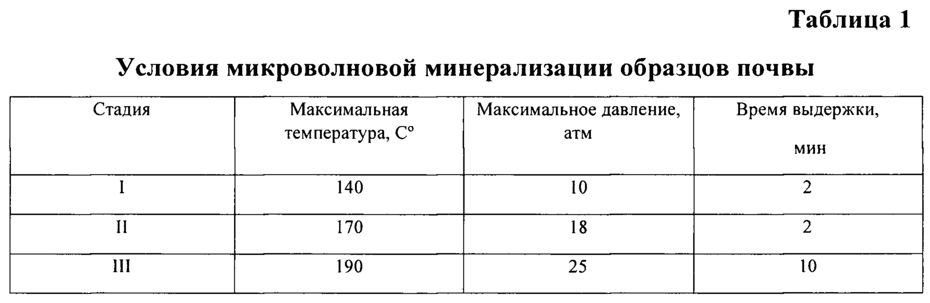 Образец гомогенизированной пробы почвы массой 0,2 г помещают во фторопластовый реакционный сосуд установки для микроволновой минерализации, вносят 4 см3 концентрированной азотной кислоты. Емкость с пробой помещают и выдерживают в течение 15 минут на ультразвуковой бане. После этого добавляют 4 см3 концентрированной соляной кислоты, закрывают сосуд и устанавливают его в камеру микроволновой установки в соответствии с техническим описанием системы.