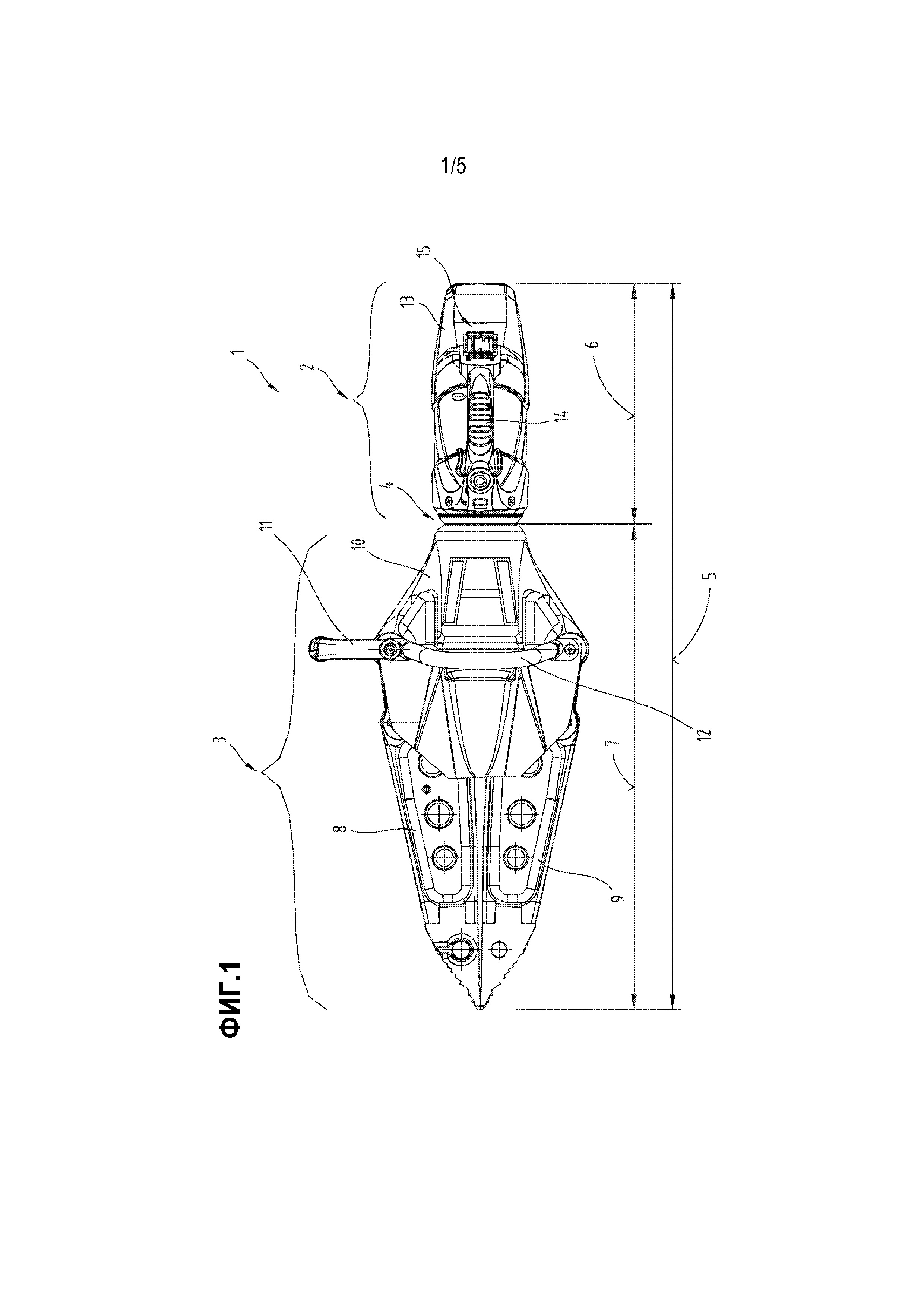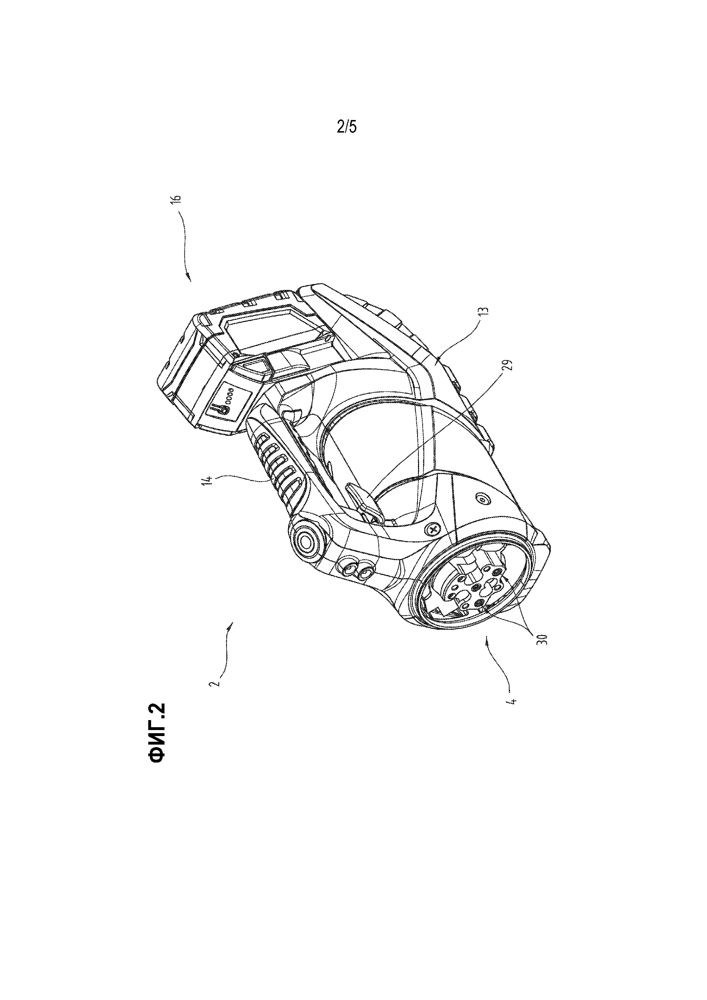 Изобретение касается переносного, работающего от аккумулятора гидравлического агрегата для гидравлического спасательного инструмента, в частности для разжимных или режущих инструментов, а также снабженного таким гидравлическим агрегатом спасательного инструмента, как это указано в пунктах формулы изобретения. Гидравлические спасательные инструменты, в частности, в виде разжимных или режущих (ножничных) инструментов, известны и обычно используются спасательными организациями, как например, пожарными командами или техническими вспомогательными службами, а также спецназом. Чтобы добиться быстрой эксплуатационной готовности таких спасательных, соответственно, рабочих инструментов, стремятся к тому, чтобы изготовить эти технические вспомогательные средства портативными, соответственно, переносными и таким образом по возможности легко перемещать. Чтобы обеспечить автономную от электрогенераторов, соответственно, электросетей эксплуатацию, гидравлические агрегаты для активации гидравлических спасательных инструментов увеличены с возможностью работы за счет электрохимических энергоаккумуляторов, в частности, за счет аккумуляторов. Соответствующие роду работающие от аккумулятора гидравлические агрегаты для гидравлических спасательных инструментов, переносные, соответственно, эксплуатируемые только одним человеком, могут иметься в распоряжении от заявителя во множестве вариантах осуществления. При этом, на переносном, работающем от аккумулятора гидравлическом агрегате длительно смонтированы, соответственно, закреплены соответствующие гидравлически приводимые в действие инструменты. При этом, соответствующий спасательный инструмент посредством по возможности эргономично прикрепленных рукояток, соответственно, захватных участков может обслуживаться и предпочтительно использоваться только одним человеком. Также, принципиальная техническая структура соответствующего роду, ранее известного спасательного инструмента раскрыта, например, в WO 2016/119819 А1. В основе настоящего изобретения лежит задача создать усовершенствованный гидравлический спасательный инструмент, в частности, далее оптимизировать его использование и вместе с этим достичь по возможности высокой производительной способности. Эта задача изобретения решается посредством соответствующего роду гидравлического агрегата с отличительными признаками пункта 1 формулы изобретения, а также посредством спасательного инструмента согласно пункту 12 формулы изобретения. Вследствие того, что электродвигатель переносного, работающего от аккумулятора гидравлического агрегата образован двигателем с дисковым ротором, чья проходящая параллельно продольной оси его выходного вала аксиальная длина является более короткой, чем его внешний диаметр, может создаваться относительно компактный, в частности в отношении своей продольной протяженности, относительно коротко выполненный гидравлический агрегат и тем самым в конечном счете относительно коротко выполненный спасательный инструмент. Вследствие того, что спасательный инструмент в целом может иметь относительно короткую общую длину, так как, по меньшей мере, прифланцованный к нему, соответственно, жестко присоединенный гидравлический агрегат может иметь относительно короткую ко