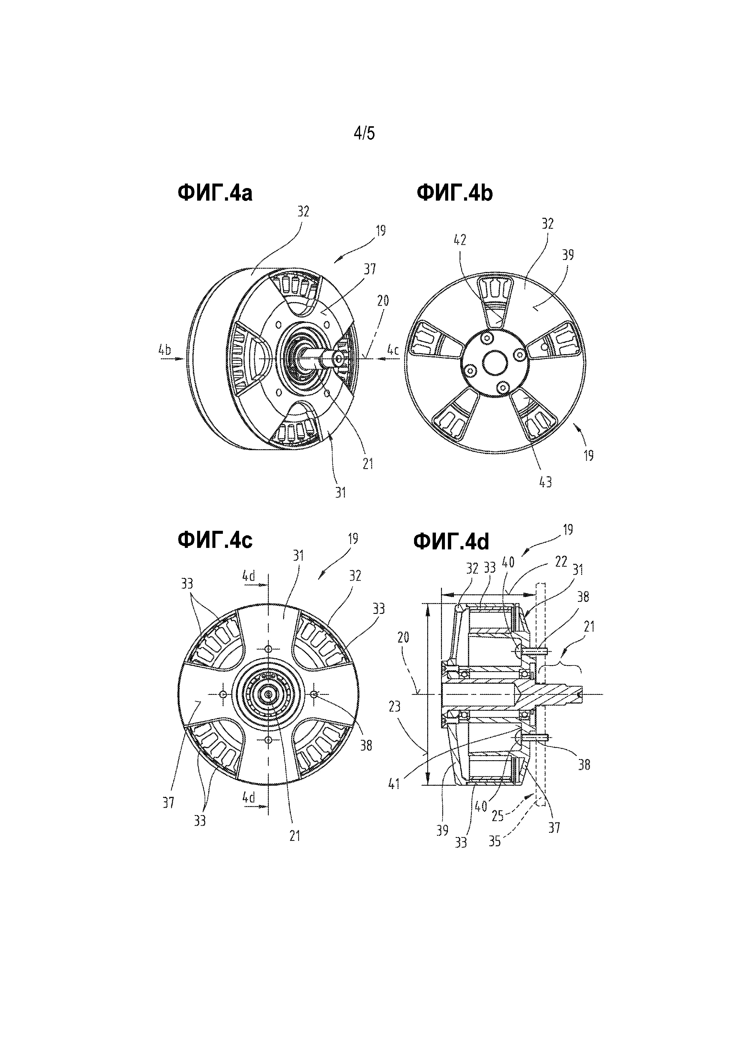 1. Переносной, работающий от аккумулятора гидравлический агрегат (2) для гидравлических спасательных инструментов (1), в частности для разжимных или режущих инструментов, содержащий по меньшей мере один гидравлический насос (18), гидравлический бак (25), уравновешивающее устройство (26) для гидравлической жидкости, обслуживаемый вручную гидравлический распределительный клапан (28), электромеханический интерфейс (15) для обеспечиваемого при необходимости присоединения и отсоединения по меньшей мере одного аккумулятора (16), гидромеханический интерфейс (4) для присоединения гидравлического инструмента (3) и приводимый посредством электрической энергии аккумулятора (16) электродвигатель (17) для привода гидравлического насоса (18), отличающийся тем, что электродвигатель (17) образован двигателем (19) с дисковым ротором, у которого проходящая параллельно продольной оси его выходного вала (21) аксиальная длина (22) является более короткой, чем его внешний диаметр (22). 2. Гидравлический агрегат по п.1, отличающийся тем, что двигатель (19) с дисковым ротором выполнен в виде двигателя с внешним ротором с внутренним неподвижным статором (31) и внешним вращающимся ротором (32), причем выполненный на роторе (22) выходной вал (21) проходит через статор (31) в аксиальном направлении выходного вала (21). 3. Гидравлический агрегат по п.1 или 2, отличающийся тем, что двигатель (19) с дисковым ротором образован в виде двигателя с колоколообразным ротором с по существу колоколообразным или U-образным ротором (32). 4. Гидравлический агрегат по п.2 или 3, отличающийся тем, что относительно периметра ротора (32) выполнено множество расположенных распределенно постоянных магнитов (33), которые находятся во взаимодействии с катушечными обмотками на статоре (31), и причем указанные катушечные обмотки предусмотрены для генерирования электромагнитных вращающихся полей. 5. Гидравлический агрегат по одному из предшествующих пунктов, отличающийся тем, что двигатель (19) с дисковым ротором непосредственно закреплен на корпусе (35) гидравлического бака (25). 6. Гидравлический агрегат по п.5, отличающийся тем, что ближайшая согласованная с выходным валом (21) первая торцевая стенка (37) двигателя (19) с дисковым ротором посредством множества крепежных винтов (38) жестко свинчена с корпусом (35) гидравлического бака (25). 7. Гидравлический агрегат по п.6, отличающийся тем, что указанное свинчивание между двигателем (19) с дисковым ротором и корпусом (35) гидравлического бака (25) установлено исходя из противолежащей первой торцевой стенке (37) второй торцевой стенки (39) двигателя (19) с дисковым ротором, так что головки (40) крепежных винтов (38) расположены между двигателем (19) с дисковым ротором и гидравлическим баком (25) на обращенной к внутреннему пространству двигателя (19) с дисковым ротором внутренней стороне (41) первой торцевой стенки (37). 8. Гидравлический агрегат по одному из пп.5-7, отличающийся тем, что противолежащая первой торцевой стенке (37) вторая торцевая стенка (39) двигателя (19) с дисковым ротором представляет собой компонент ротора (32), причем указанная вторая торцевая стенка (39) имеет по меньшей мере два проема (42, 43) или свободных места, которые позволяют вставку крепежных винтов (38) исходя от второй торцевой стенки (39) через внутреннее пространство двигателя (19) с дисковым ротором в направлении к внутренней ст
