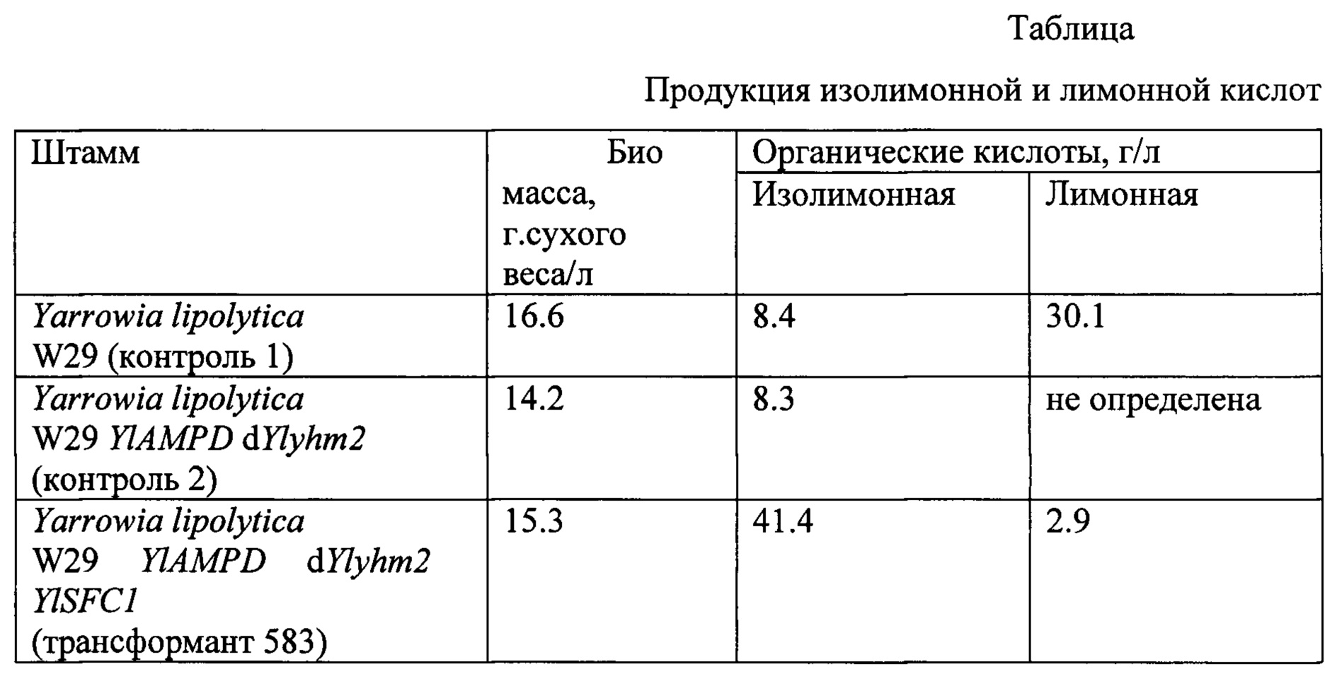 Область техники Настоящее изобретение относится к микробиологической промышленности, а именно к получению продуцента изолимонной кислоты на основе дрожжей вида Yarrowia lipolytica, модифицированных методами генной инженерии. Предшествующий уровень техники Возрастающий интерес к продукции природного изомера изолимонной кислоты (трео-Ds(+)-изолимонная кислота) связан с использованием ее в фармацевтической и пищевой промышленностях [1]. Перспективной является разработка технологии получения изолимонной кислоты с использованием микроорганизмов. Микробиологический синтез позволяет получить природный изомер и является сравнительно быстрым и простым способом, что делает продукт доступным и рентабельным для дальнейшего использования. Способность продуцировать изолимонную кислоту обнаружена у мицелиального гриба вида Penicillium purpurogenum, представителей дрожжей Candida ravautii, Candida catenulate, а также Yarrowia lipolytica [2]. Среди указанных микроорганизмов дрожжи Y. lipolytica являются наиболее физиологически и генетически изученными, для них разработаны технологии промышленной ферментации, системы генетической трансформации, подходы для экспрессии и инактивации генов, секвенирован геном [3]. Известно, что изоцитрат (изолимонная кислота) синтезируется в митохондриях в процессе осуществления цикла Кребса посредством реакции изомеризации цитрата в изоцитрат, катализируемой ферментом аконитазой. В условиях избытка источника углерода и лимита источника азота происходит частичное торможение следующего этапа цикла Кребса - окислительного декарбоксилирования изоцитрата, катализируемого ферментом изоцитратдегидрогеназой (Idh), что приводит к накоплению интермедиантов цикла Кребса изоцитрата и цитрата в митохондриях [4]. Причина торможения декарбоксилирования изоцитрата заключается в том, что клетки начинают синтезировать ионы аммония из аденозинмонофосфата (АМФ) за счет повышения активности фермента аденозинмонофосфатдеаминазы (АМФД), при этом снижение АМФ, являющегося кофактором митохондриальной изоцитратдегидрогеназы, приводит к ингибированию этого фермента и, как следствие, к накоплению цитрата и изоцитрата [4]. В условиях избытка источника углерода и лимита источника азота повышение экспрессии гена YlAMPD, ответственного за синтез аденозинмонофосфатдеаминазы в дрожжах Y. lipolytica, приводит к увеличению пула синтезируемого изоцитрата и цитрата. Так, природный штамм Y. lipolytica W29 за 5 дней культивирования в условиях избытка источника углерода и лимита по азоту продуцирует 38.5 г/л смеси цитрата и изоцитрата, а штамм Yarrowia lipolytica W29 YlAMPD, обладающий увеличенной экспрессией гена YlAMPD, в тех же условиях производит 47.5 г/л смеси цитрата и изоцитрата [5]. Внутренняя мембрана митохондрии непроницаема для крупных молекул, таких как органические кислоты, аминокислоты, нуклеотиды, коферменты и кофакторы. Транспортную функцию таких молекул через мембрану осуществляет особая группа белков - митохондриальные транспортеры [6]. Известно, что в дрожжах Y. lipolytica за транспорт цитрата в митохондрию и из нее отвечает белок YlYhm2p [5], а за транспортировку изоцитрата между митохондриями и цитоплазмой отвечает белок YlSfc1p [7]. Инактивация гена YlYHM2 приводит к неспособности митохондрий клетки транспортировать цитрат из митохондрий в цитоплазму, тем самым позволяя полностью использовать ц
