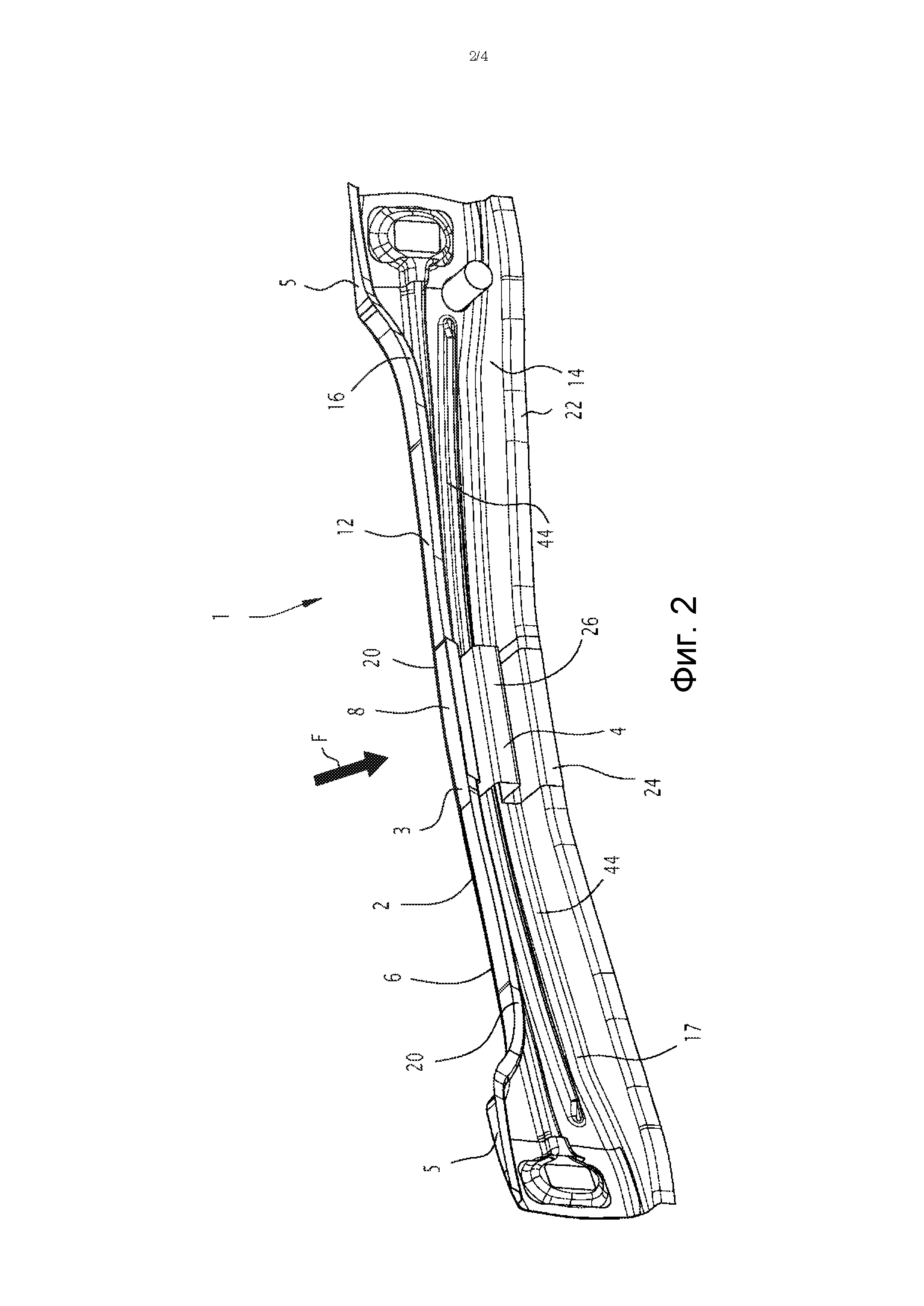 1. Поперечный элемент (1) для бруса буфера автомобиля, содержащий: - внешнюю балку (2), проходящую в поперечном направлении, с основной частью (3) балки, содержащей верхнюю стенку (12) балки, нижнюю стенку (14) балки и переднюю стенку (16) балки, соединяющую верхнюю стенку (12) балки и нижнюю стенку (14) балки, причем указанные верхняя стенка (12) балки, нижняя стенка (14) балки и передняя стенка (16) балки совместно ограничивают внутренний объем (17) балки, открытый в обратном направлении, противоположном передней стенке (16) балки; - усиливающий элемент (4), определяющий усиленную область (24) внешней балки (2), расположенную внутри части указанного внутреннего объема (17) балки и имеющую поперечное сечение, ограничивающее объем (25) внутреннего усиления, открытый в указанном обратном направлении; - закрывающую пластину (6), которая закрывает по меньшей мере часть внутреннего объема (17) балки, причем поперечное сечение усиливающего элемента (4) имеет форму, которая не сопрягается с формой внешней балки (2) в усиленной области (24), отличающийся тем, что усиливающий элемент содержит по меньшей мере верхнюю усиливающую стенку (26), связанную с первой промежуточной усиливающей стенкой (28) верхней соединительной стенкой (30), причем указанная первая промежуточная усиливающая стенка (28) соединена со второй промежуточной усиливающей стенкой (32) центральной соединительной стенкой (34), и указанная вторая промежуточная усиливающая стенка (32) связана с нижней усиливающей стенкой (36) нижней соединительной стенкой (38), причем указанные верхняя и нижняя соединительные стенки (30) и (38) обращены к передней стенке (16) внешней балки (2), и указанная центральная соединительная стенка (34) обращена к открытой стороне внешней балки (2). 2. Поперечный элемент (1) по п.1, отличающийся тем, что закрывающая пластина (6) полностью закрывает объем (25) внутреннего усиления. 3. Поперечный элемент (1) по п.1 или 2, отличающийся тем, что ширина усиленной области (24) в поперечном направлении составляет 30-80% ширины основной части (3) внешней балки (2) в указанном поперечном направлении. 4. Поперечный элемент (1) по любому из пп.1-3, отличающийся тем, что ширина закрывающей пластины (6) в поперечном направлении составляет 50-100% ширины основной части (3) внешней балки (2) в указанном поперечном направлении. 5. Поперечный элемент (1) по любому из пп.1-4, отличающийся тем, что по меньшей мере указанная центральная соединительная стенка (34) упирается в закрывающую пластину (36). 6. Поперечный элемент (1) по п.5, отличающийся тем, что указанные центральная соединительная стенка (34) и закрывающая стенка (6) прикреплены друг к другу. 7. Поперечный элемент (1) по любому из пп.1-6, отличающийся тем, что закрывающая пластина (6) содержит по меньшей мере одно отверстие (44) снаружи усиленной области (24) и не содержит отверстий внутри указанной усиленной области (24). 8. Поперечный элемент (1) по любому из пп.1-7, отличающийся тем, что внешняя балка (2) является горячештампованным стальным листом. 9. Поперечный элемент (1) по любому из пп.1-8, отличающийся тем, что внешняя балка (2) является горячештампованной сваренной по выкройке заготовкой, содержащей центральную часть (8) балки и две боковые части (10) балки, проходящие с каждой стороны указанной центральной части (8) балки в поперечном направлении, причем ширина центральной части (8) балки в поперечном направлении 