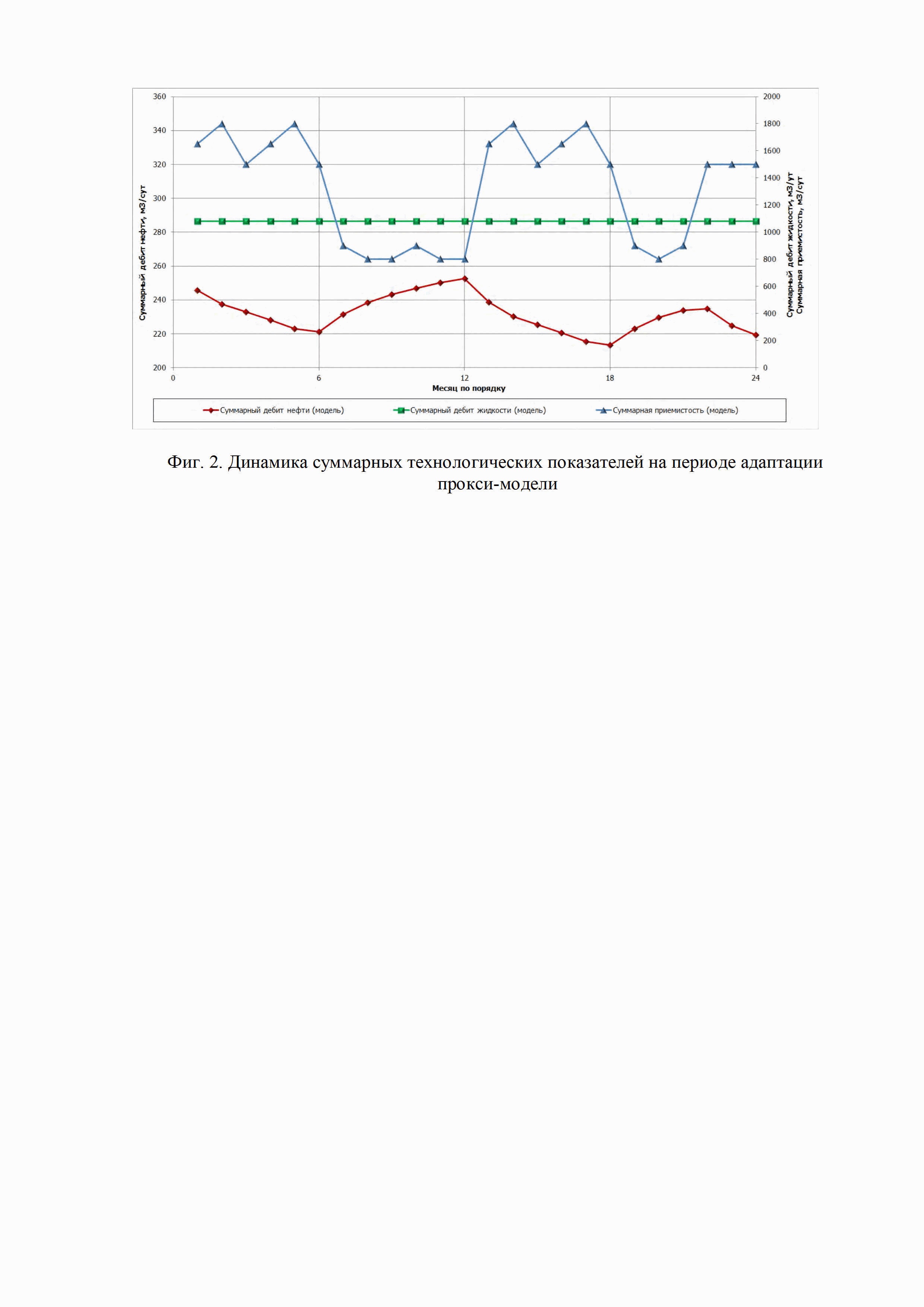 • на фиг.2 графически представлена динамика суммарных технологических показателей на периоде адаптации прокси-модели (динамика изменения фактических технологических показателей разработки нефтяной залежи во времени: красной линей по левой оси - суммарный дебит нефти, зеленой линией по правой оси - суммарный дебит жидкости, синей линией по правой оси - суммарная приемистость);