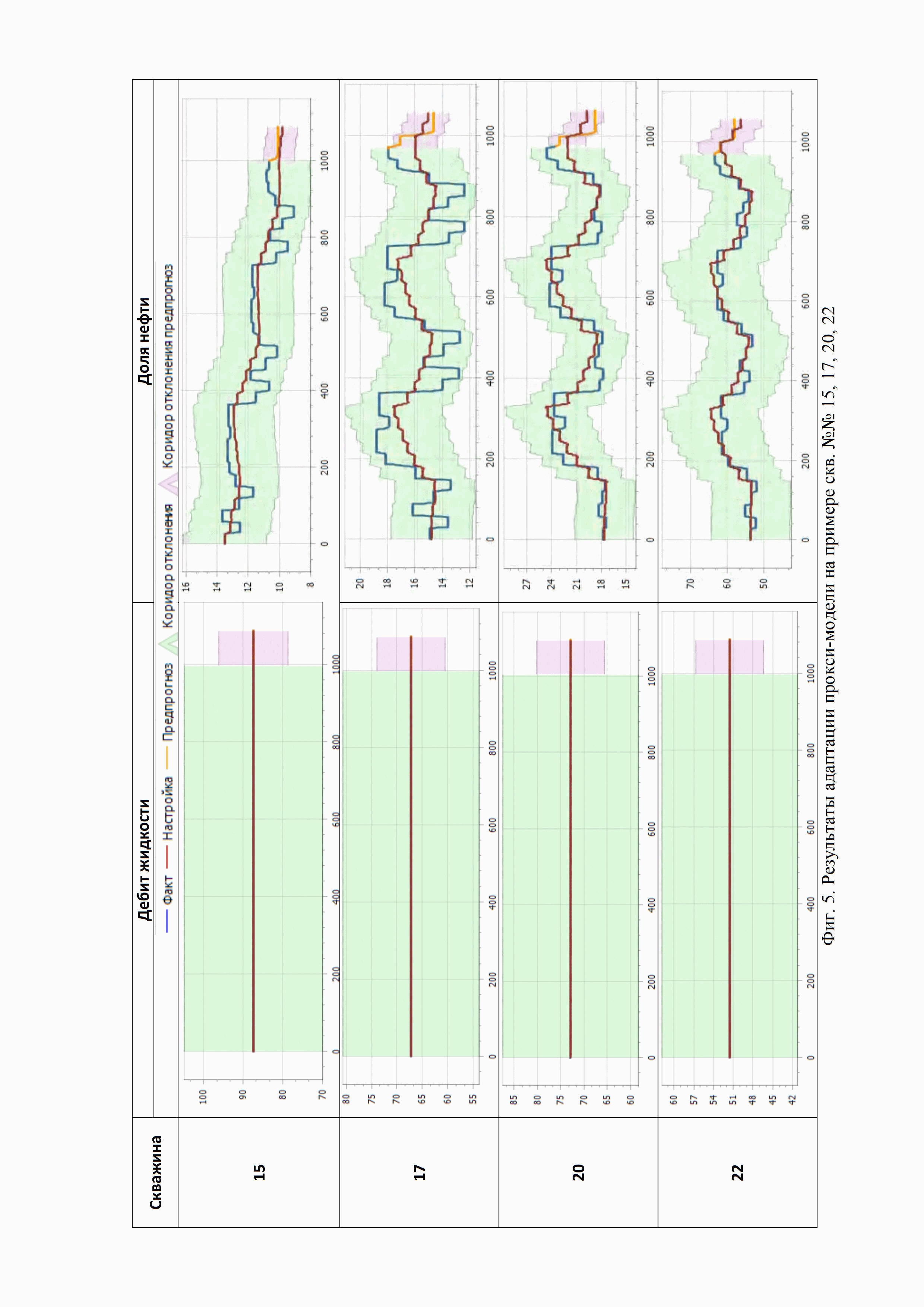 • на фиг. 5 представлены результаты адаптации прокси-модели (графики качества адаптации прокси-модели) на примере скважин №№ 15, 17, 20, 22 по дебиту жидкости (слева) и доле нефти (справа). Красными линиями показаны расчетные значения, полученные на прокси-модели, синими - фактические показатели. Каналы с зеленой заливкой характеризуют допустимые коридоры отклонений расчетного значения дебита жидкости/доли нефти от фактического на временном промежутке с начала адаптации до завершения адаптации за вычетом трех месяцев, каналы с красной заливкой характеризуют аналогичные коридоры за последние три месяца периода адаптации прокси-модели;