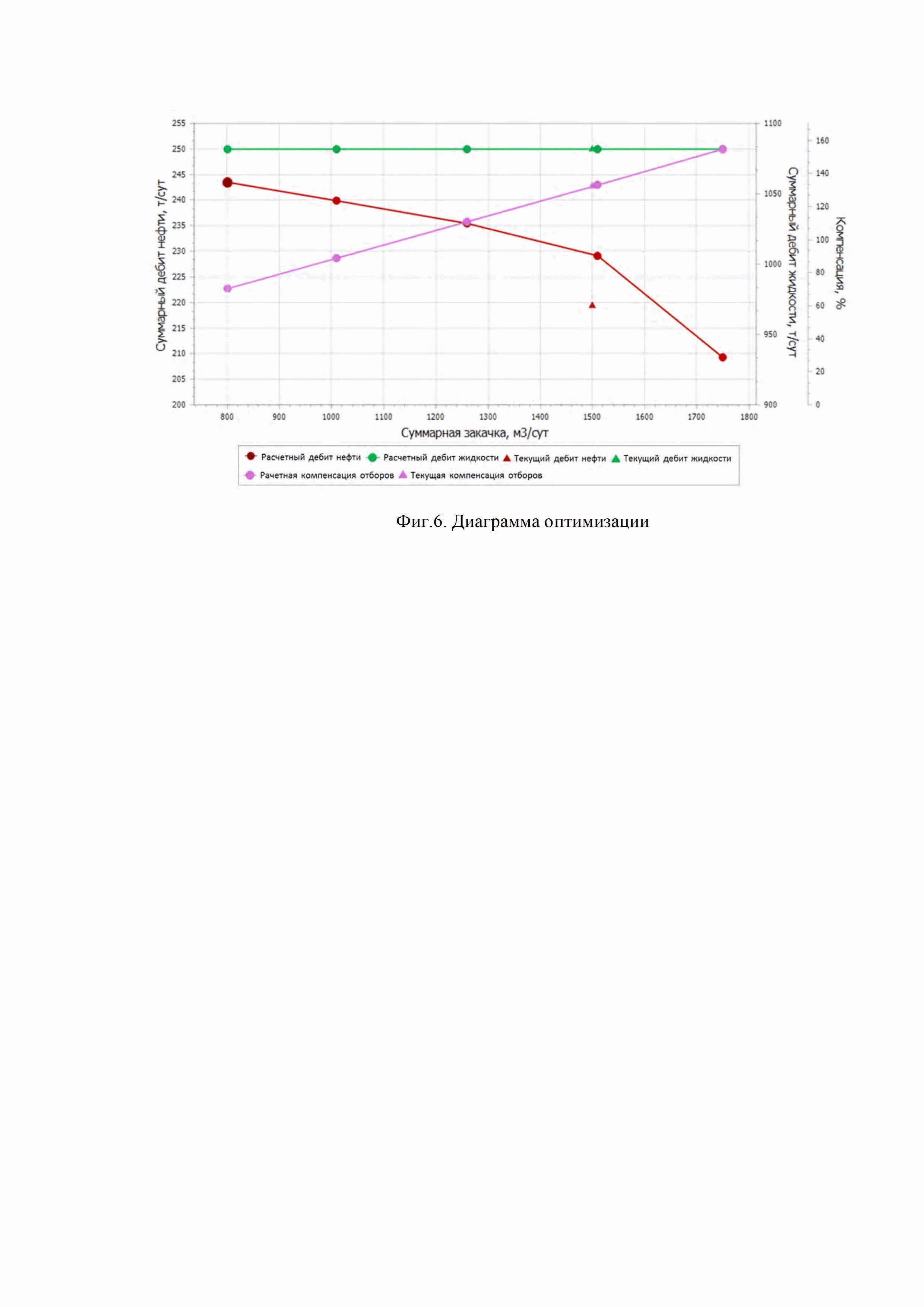 • на фиг.6 представлена диаграмма оптимизации - зависимость расчетного суммарного дебита нефти (красной линией с круглыми маркерами), расчетного суммарного дебита жидкости (зеленой линией с круглыми маркерами) и расчетной компенсации отборов (розовой линией с круглыми маркерами) от суммарной закачки воды. Текущие показатели разработки залежи изображены в виде треугольных маркеров: красным треугольником - текущий суммарный дебит нефти, зеленым треугольником - текущий суммарный дебит жидкости, розовым треугольником - текущая компенсация отборов;