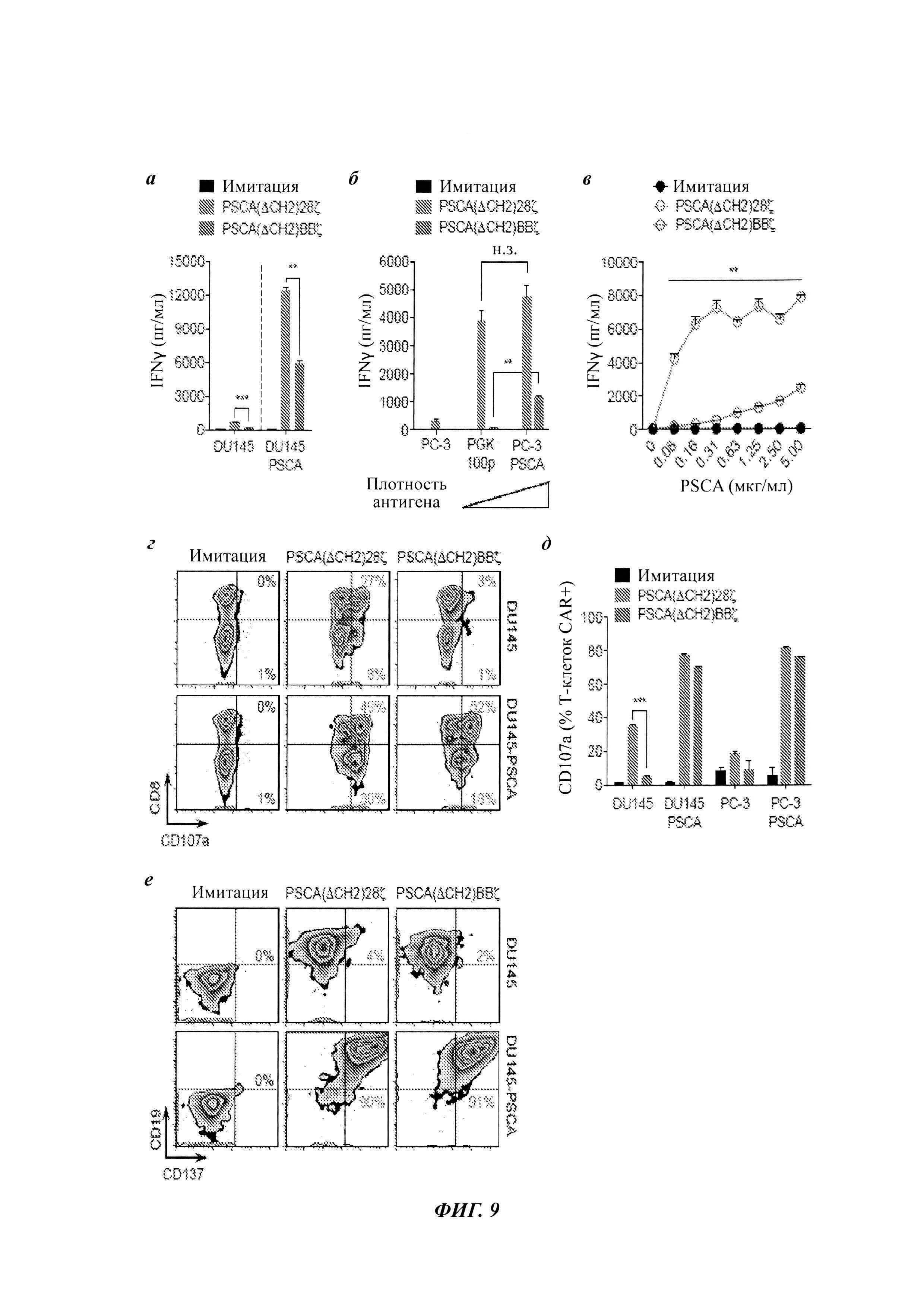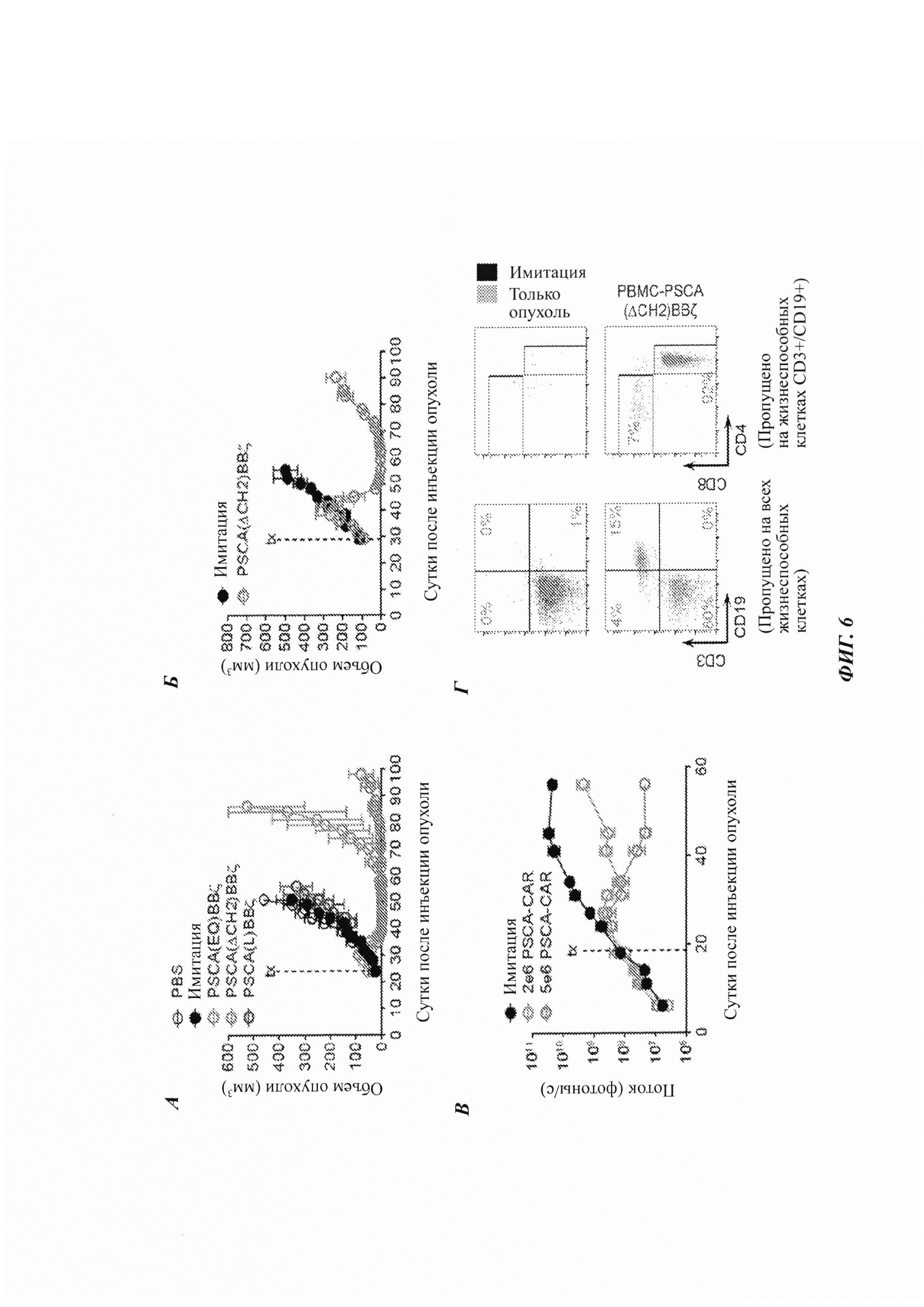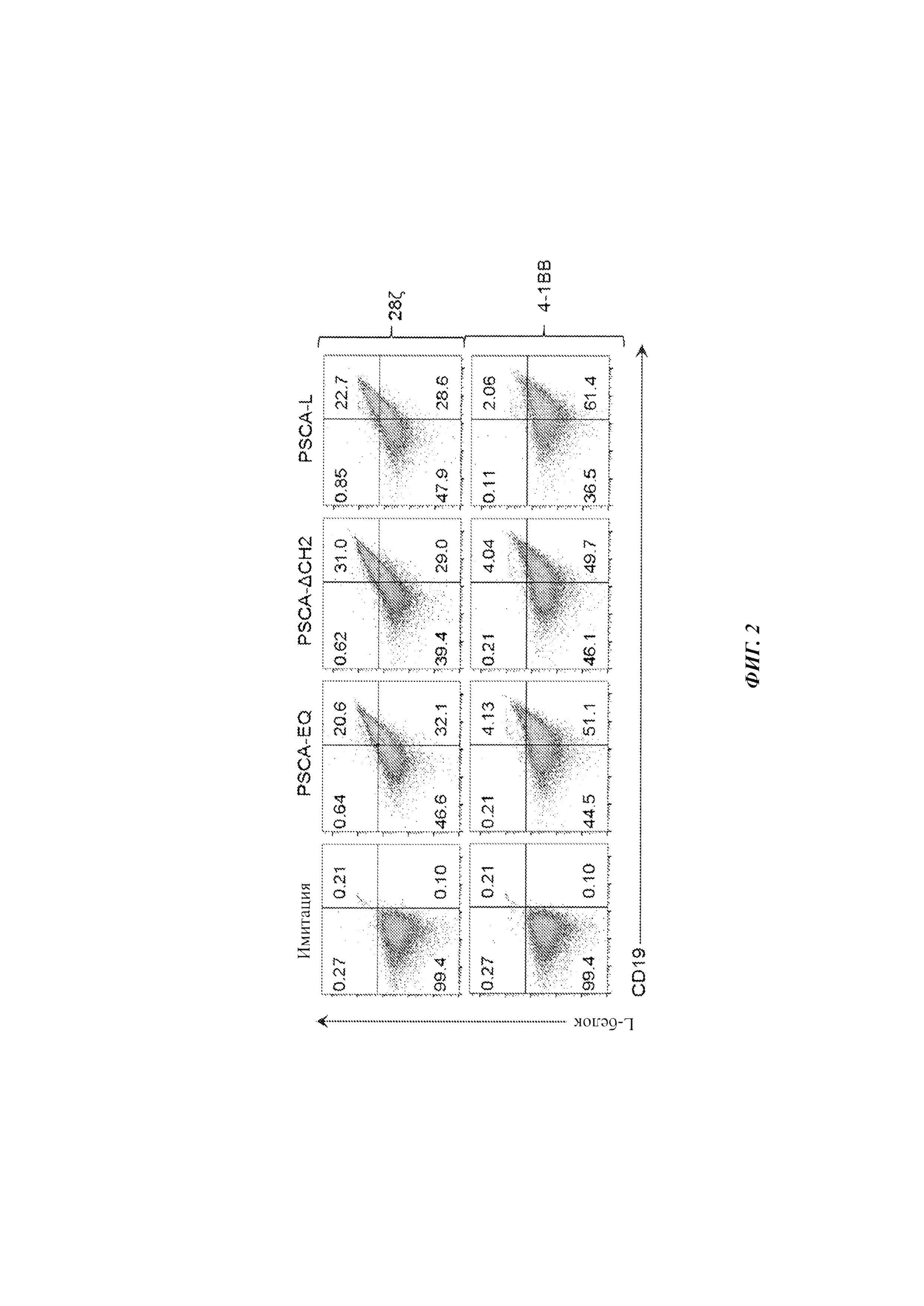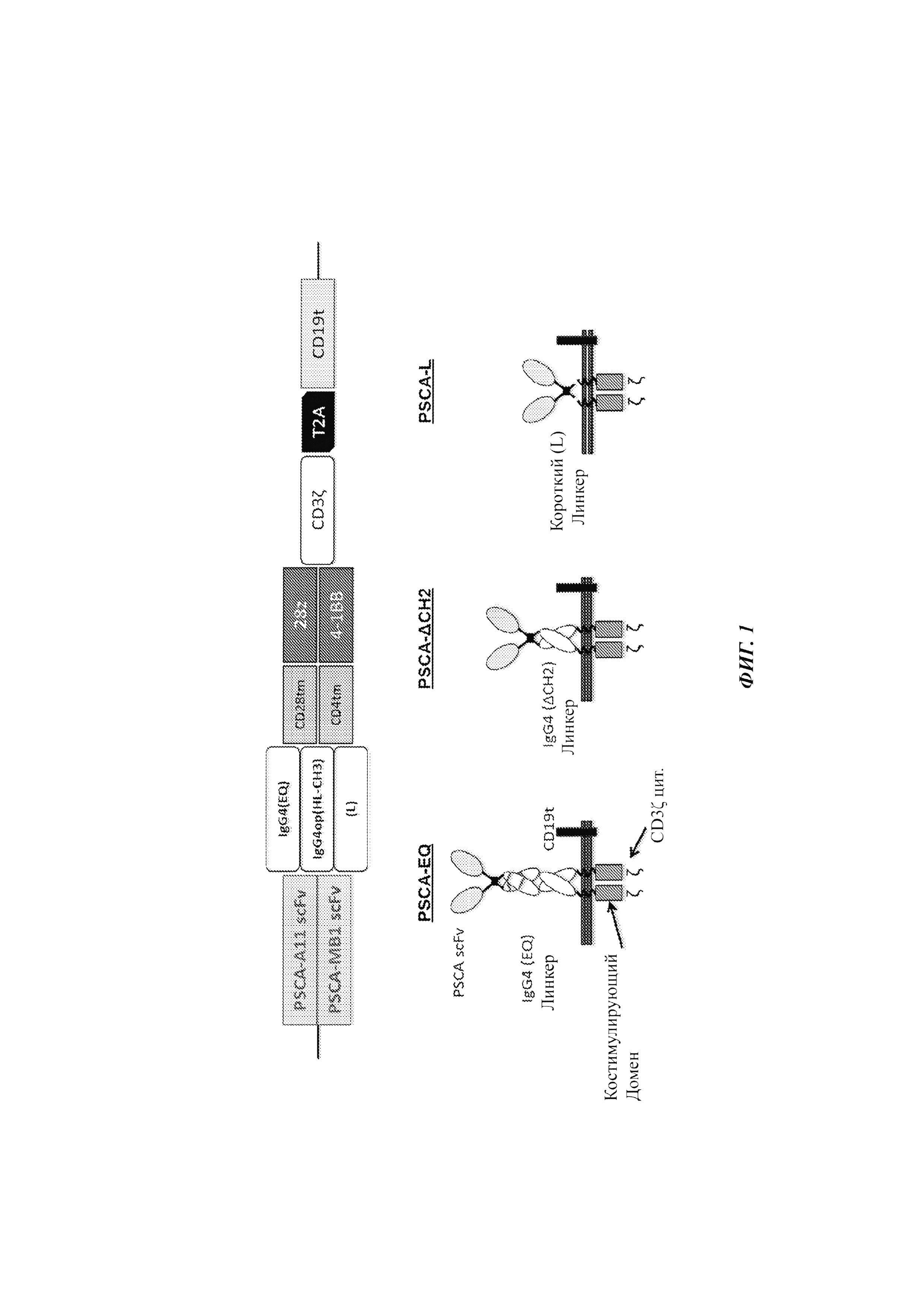 Помимо scFv, нацеленного на PSCA, внеклеточный домен включает спейсер, содержащий, например, часть домена Fc человеческого IgG4. Трансмембранная часть CAR включает, например, трансмембранный домен CD4, трансмембранный домен CD8, трансмембранный домен CD28, трансмембранный домен CD3 или трансмембранный домен 4IBB. Внутриклеточный домен сигнализации включает домен сигнализации из зета цепи комплекса человеческого CD3 (CD3ζ) и костимулирующий домен, например, костимулирующий домен ОХ40, CD28, CD28gg или 4-IBB (CD137). Внеклеточный домен обеспечивает то, что CAR, при экспрессии на поверхности Т-клетки, направляет активность Т-клетки на те клетки, которые экспрессируют PSCA. Такие клетки включают раковые клетки простаты. Включение костимулирующего домена последовательно с (но не обязательно непосредственно рядом с) CD3ζ во внутриклеточной области обеспечивает получение Т-клеткой костимулирующих сигналов. Т-клетки, например, специфичные для пациента, аутологичные Т-клетки, можно генетически модифицировать для экспрессии CAR, описанных в данном документе, и данные генетически модифицированные клетки могут быть размножены и использованы в ACT (адоптивная клеточная терапия). Можно использовать разные поднаборы Т-клеток. Кроме того, CAR могут быть экспрессированы в других иммунных клетках, таких как клетки NK (природные киллеры). При лечении пациента иммунной клеткой, экспрессирующей CAR, описанный в данном документе, данная клетка может быть аутологичной или аллогенной Т-клеткой. В некоторых случаях использованные клетки представляют собой центральные Т-клетки памяти (TCM) CD4+ и CD8+, которые представляют собой CD45RA-CD62L+, или клетки TCM/SCM/N (CD45RA+CD62L+), и применение таких клеток может улучшать долговременную жизнестойкость клеток после адоптивного переноса, по сравнению с применением других типов Т-клеток, специфичных для пациента. Важно то, что общая конструкция CAR избегает нежелательной активности против нераковых клеток, включая нераковые клетки, экспрессирующие только относительно низкий уровень PSCA.