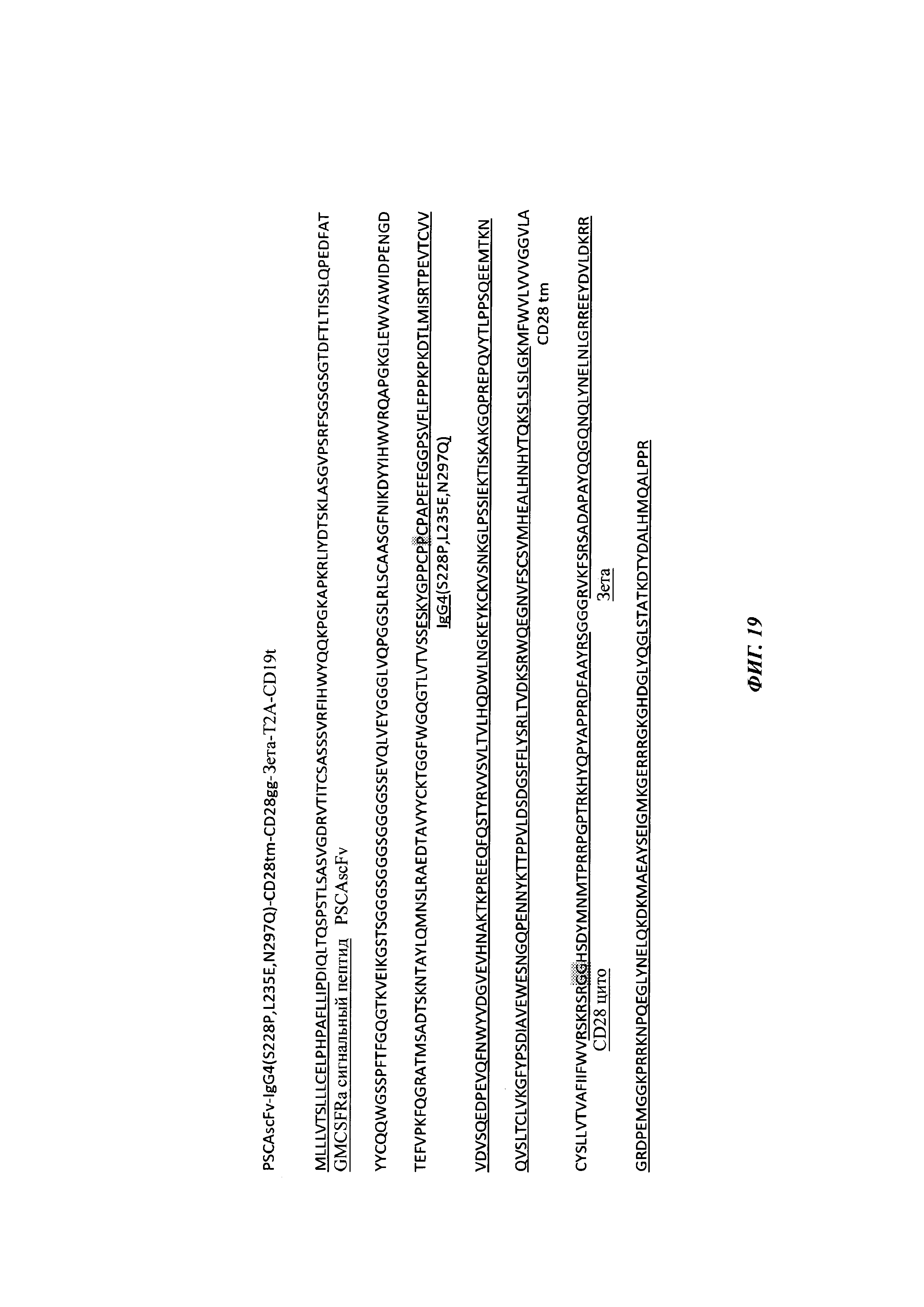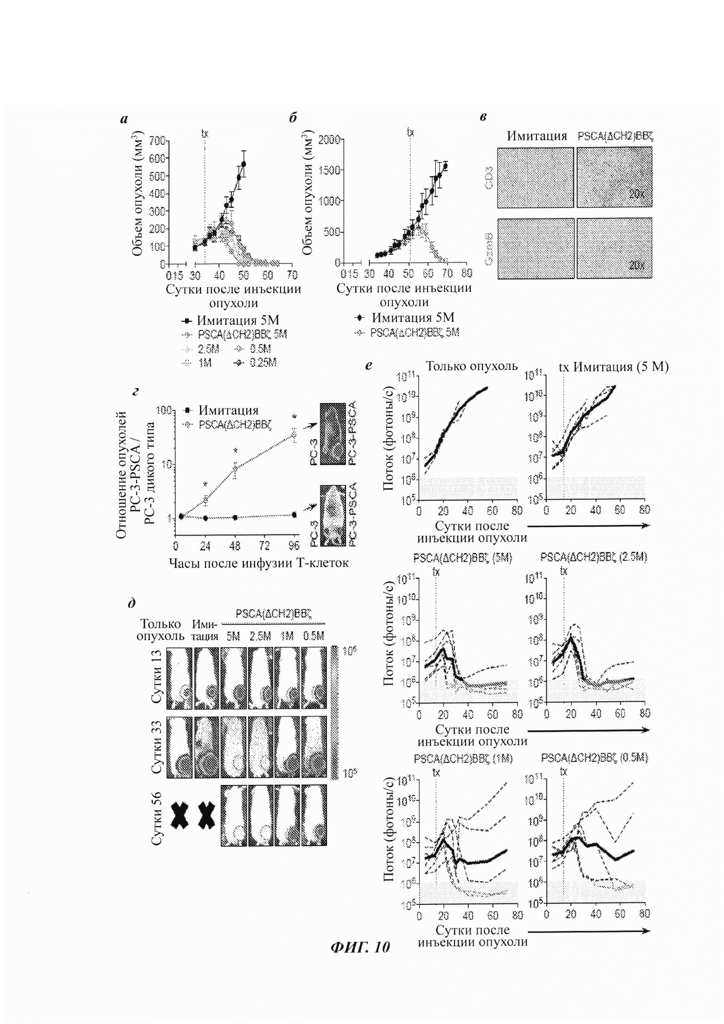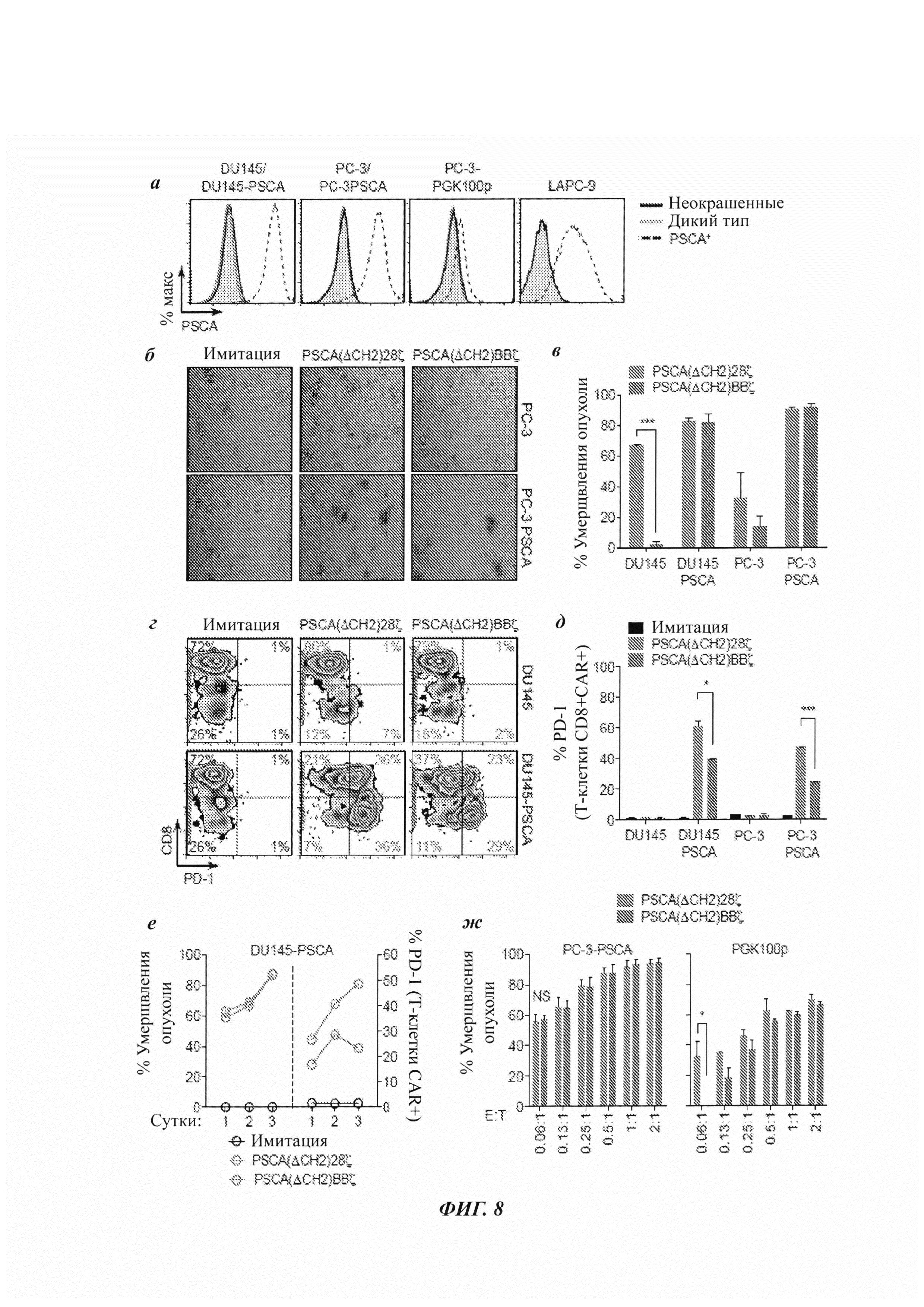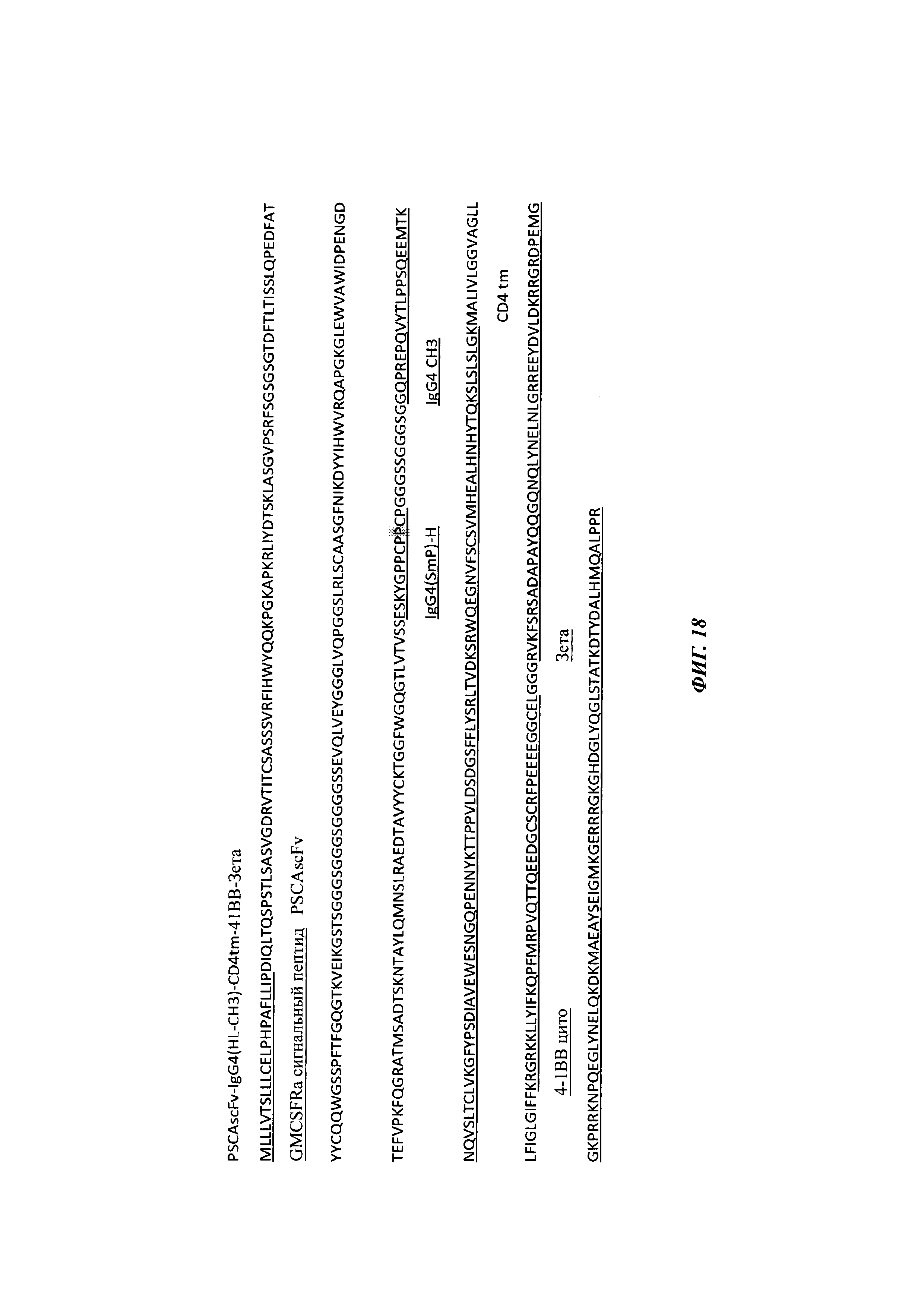 Помимо scFv, нацеленного на PSCA, внеклеточный домен включает спейсер, содержащий, например, часть домена Fc человеческого IgG4. Трансмембранная часть CAR включает, например, трансмембранный домен CD4, трансмембранный домен CD8, трансмембранный домен CD28, трансмембранный домен CD3 или трансмембранный домен 4IBB. Внутриклеточный домен сигнализации включает домен сигнализации из зета цепи комплекса человеческого CD3 (CD3ζ) и костимулирующий домен, например, костимулирующий домен ОХ40, CD28, CD28gg или 4-IBB (CD137). Внеклеточный домен обеспечивает то, что CAR, при экспрессии на поверхности Т-клетки, направляет активность Т-клетки на те клетки, которые экспрессируют PSCA. Такие клетки включают раковые клетки простаты. Включение костимулирующего домена последовательно с (но не обязательно непосредственно рядом с) CD3ζ во внутриклеточной области обеспечивает получение Т-клеткой костимулирующих сигналов. Т-клетки, например, специфичные для пациента, аутологичные Т-клетки, можно генетически модифицировать для экспрессии CAR, описанных в данном документе, и данные генетически модифицированные клетки могут быть размножены и использованы в ACT (адоптивная клеточная терапия). Можно использовать разные поднаборы Т-клеток. Кроме того, CAR могут быть экспрессированы в других иммунных клетках, таких как клетки NK (природные киллеры). При лечении пациента иммунной клеткой, экспрессирующей CAR, описанный в данном документе, данная клетка может быть аутологичной или аллогенной Т-клеткой. В некоторых случаях использованные клетки представляют собой центральные Т-клетки памяти (TCM) CD4+ и CD8+, которые представляют собой CD45RA-CD62L+, или клетки TCM/SCM/N (CD45RA+CD62L+), и применение таких клеток может улучшать долговременную жизнестойкость клеток после адоптивного переноса, по сравнению с применением других типов Т-клеток, специфичных для пациента. Важно то, что общая конструкция CAR избегает нежелательной активности против нераковых клеток, включая нераковые клетки, экспрессирующие только относительно низкий уровень PSCA.